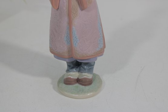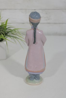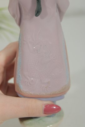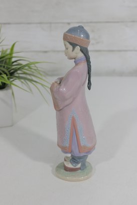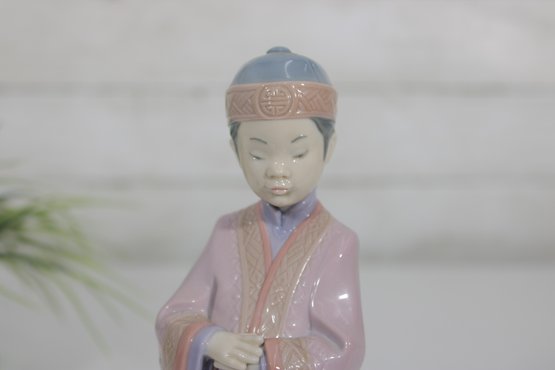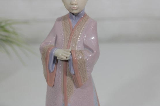 LLADRÓ porcelain figurine depicting an Asian boy in traditional attire, produced between 1995–1999. This refined piece features soft pastel tones, including a pink robe with delicate detailing and a coordinating cap, showcasing LLADRÓ’s signature craftsmanship.
