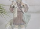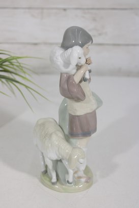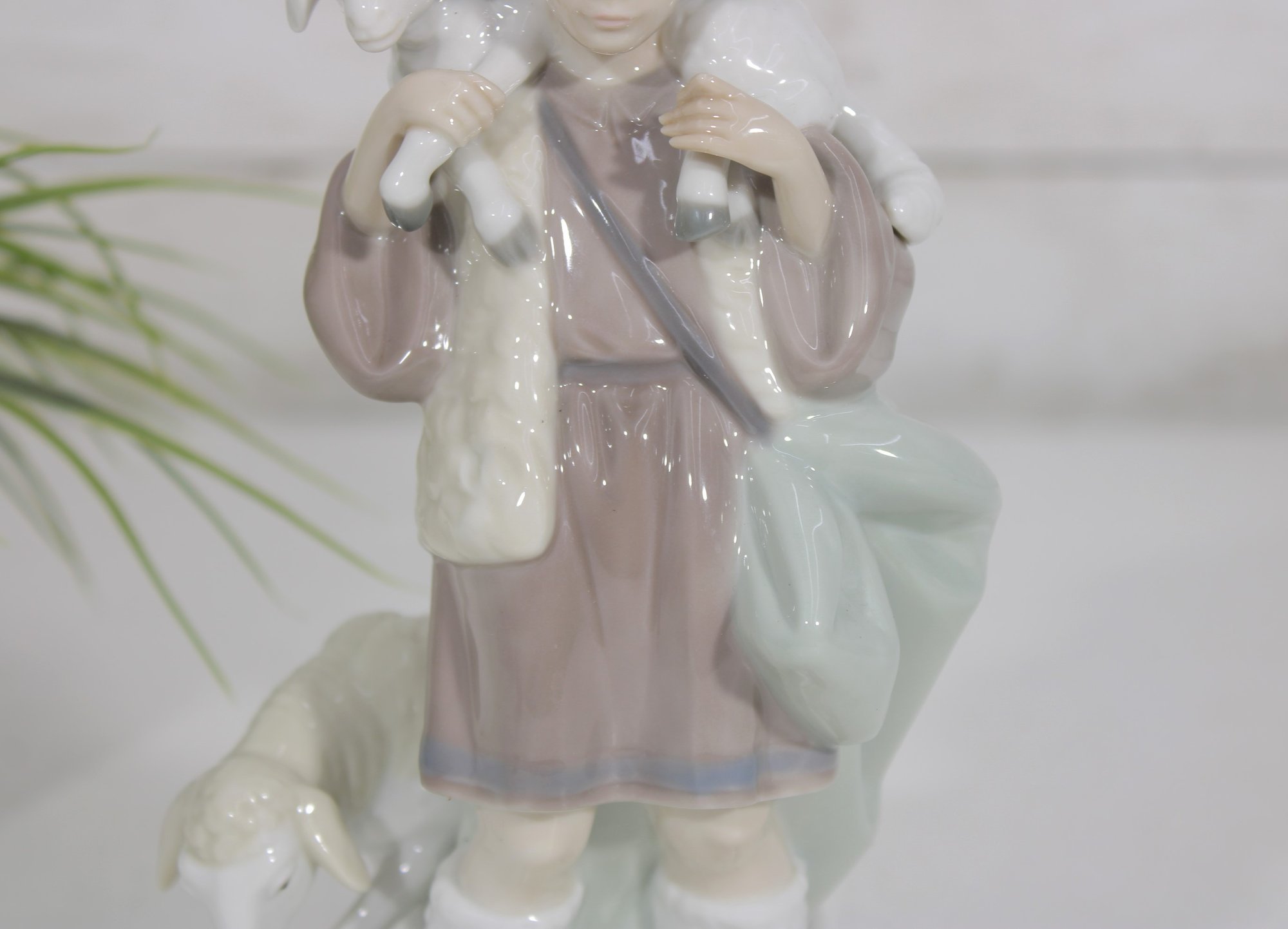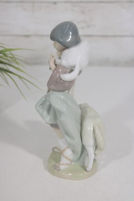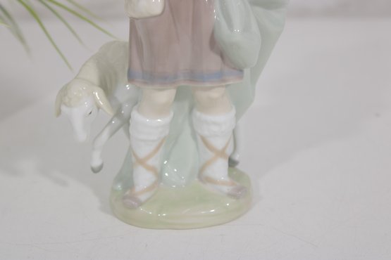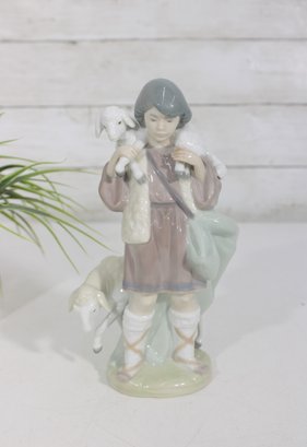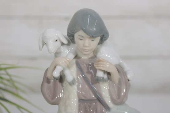 Charming LLADRÓ porcelain figurine depicting a young shepherd boy carrying a lamb, a classic piece from a nativity scene collection. This beautifully crafted figure features soft pastel tones, a gentle expression, and finely detailed clothing and accessories.