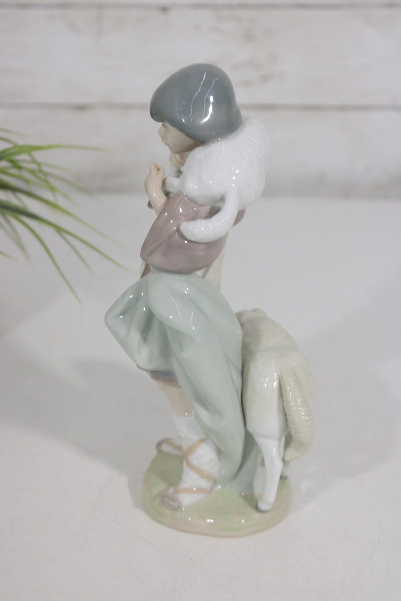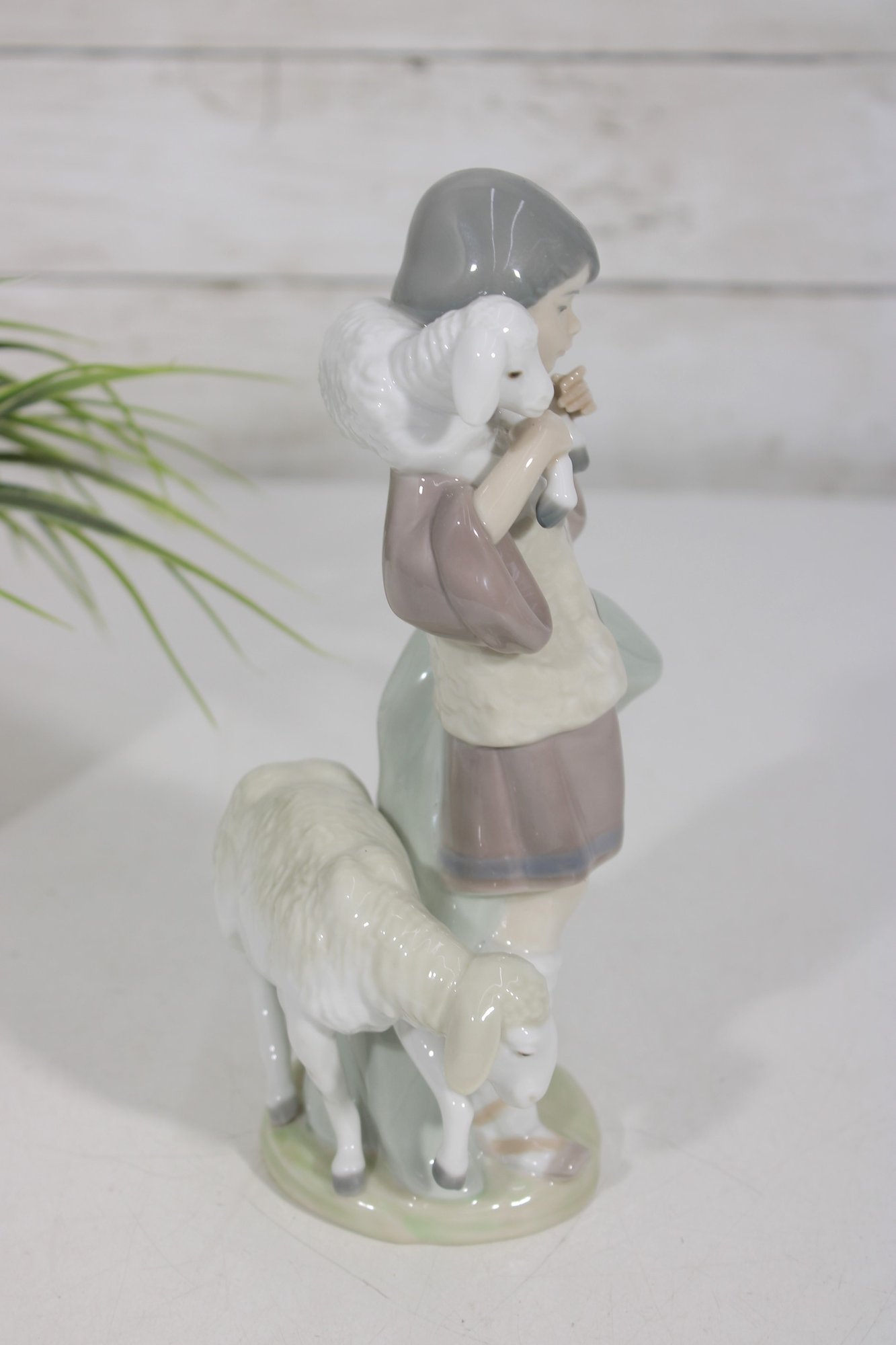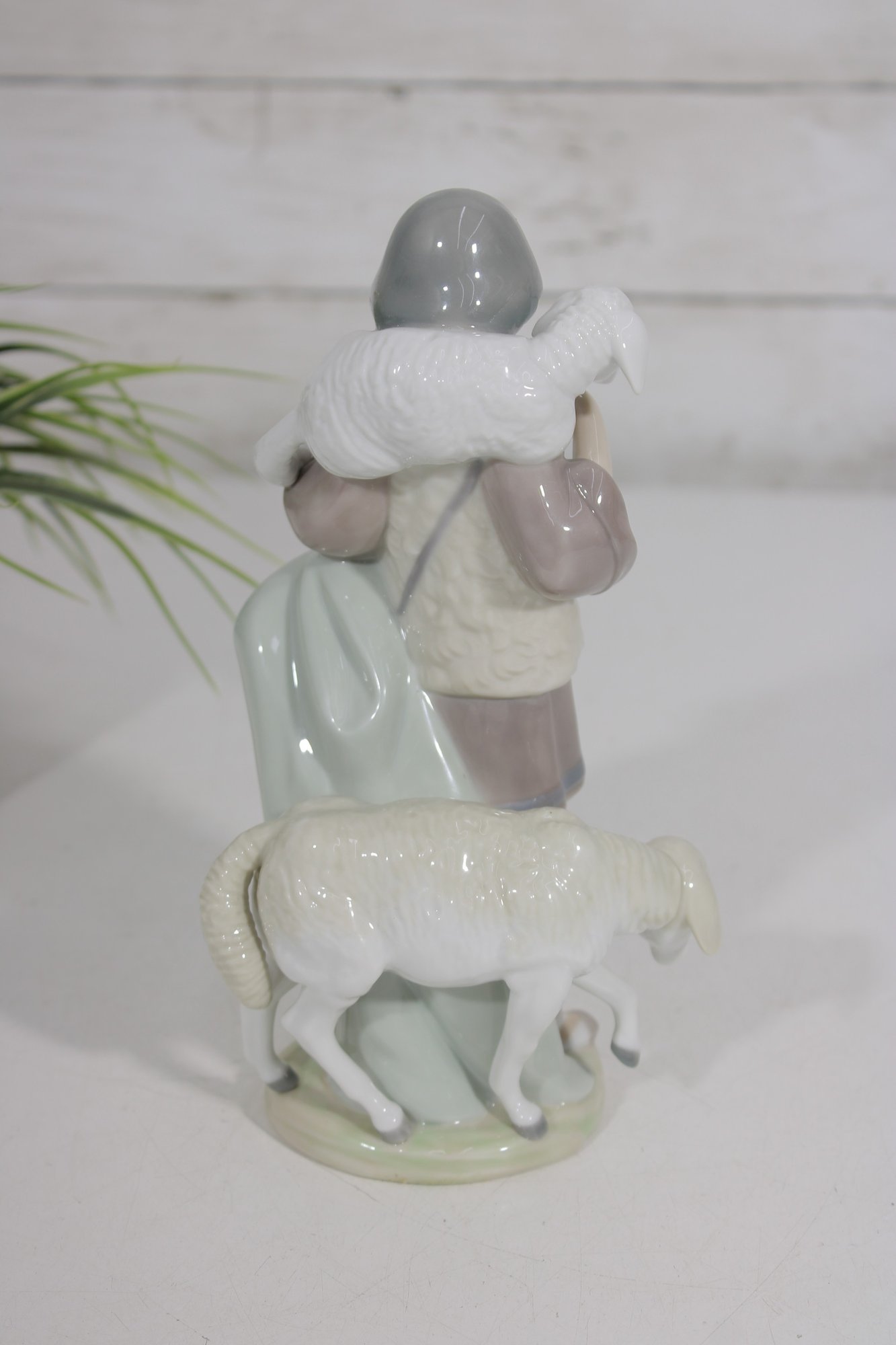 The shepherd is shown with a lamb draped over his shoulders and another at his side, capturing a peaceful pastoral moment. The glossy porcelain finish and delicate sculpting reflect LLADRÓ’s renowned craftsmanship.