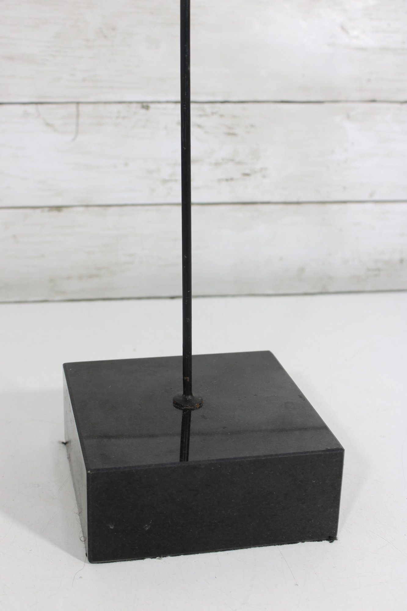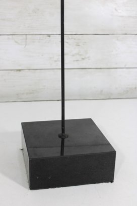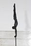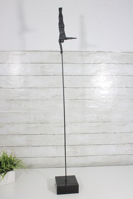 Crafted in a dark metal finish, the figure is mounted atop a slender rod and supported by a solid square base, giving the piece height and presence while maintaining a clean, modern aesthetic. Its tall, narrow profile makes it ideal for display in entryways, corners, or as a statement accent in modern interiors.