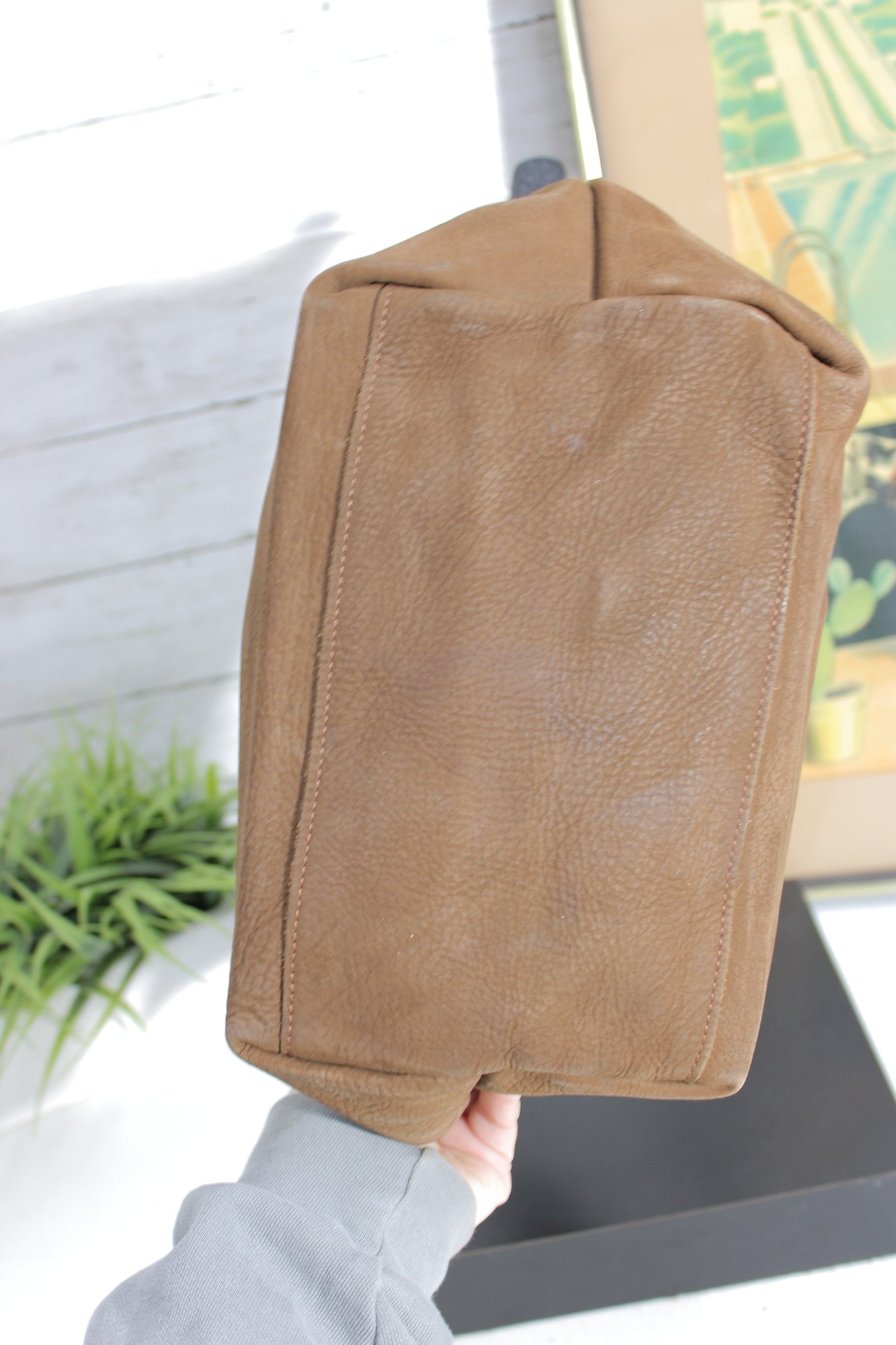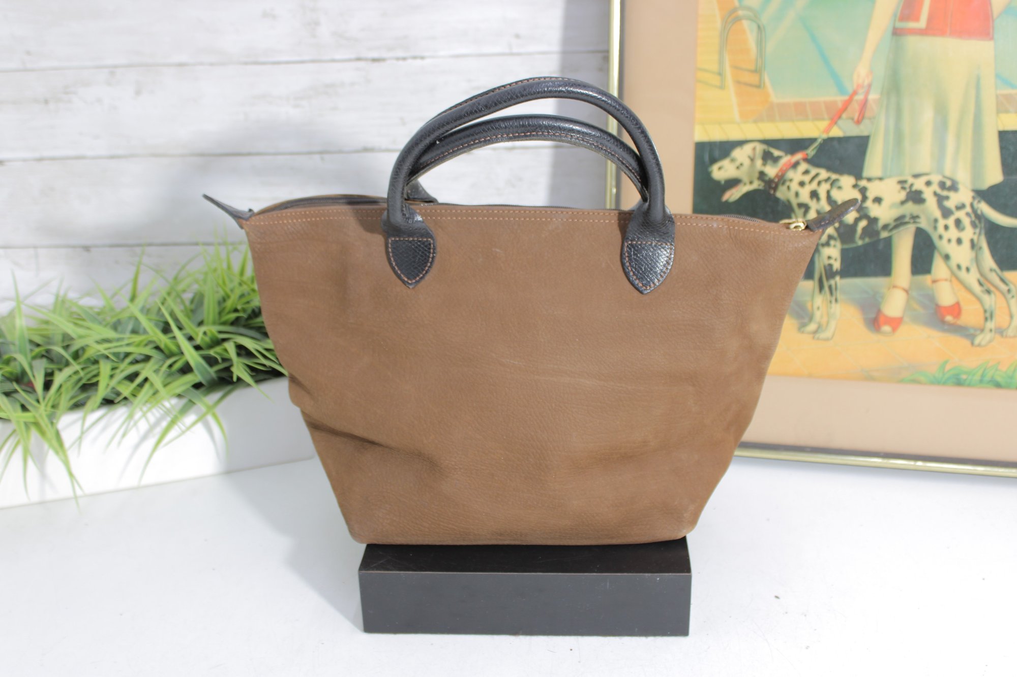 this Longchamp tote handbag features a rich brown leather body accented by contrasting black leather handles for a refined, classic look.
