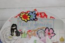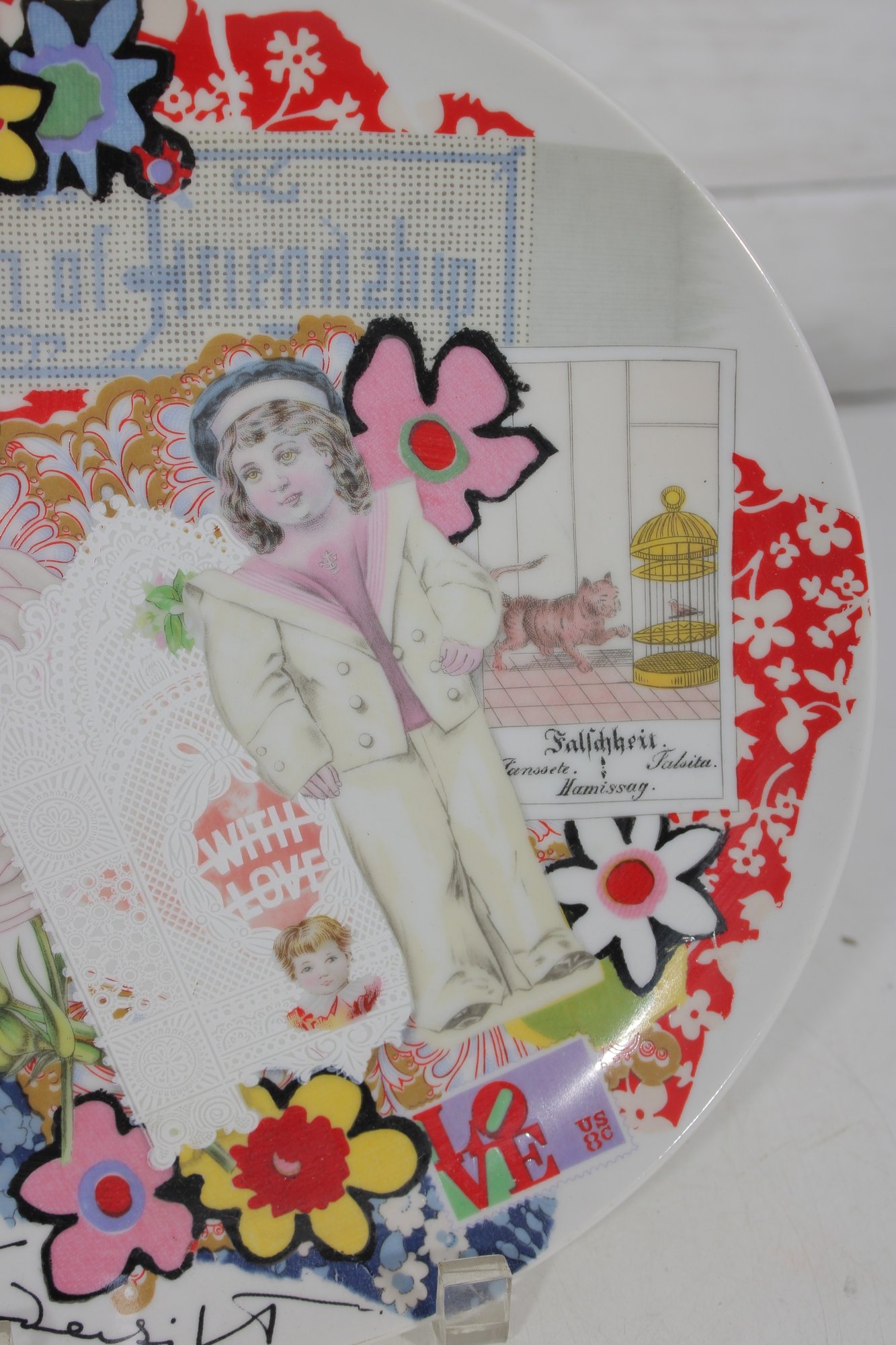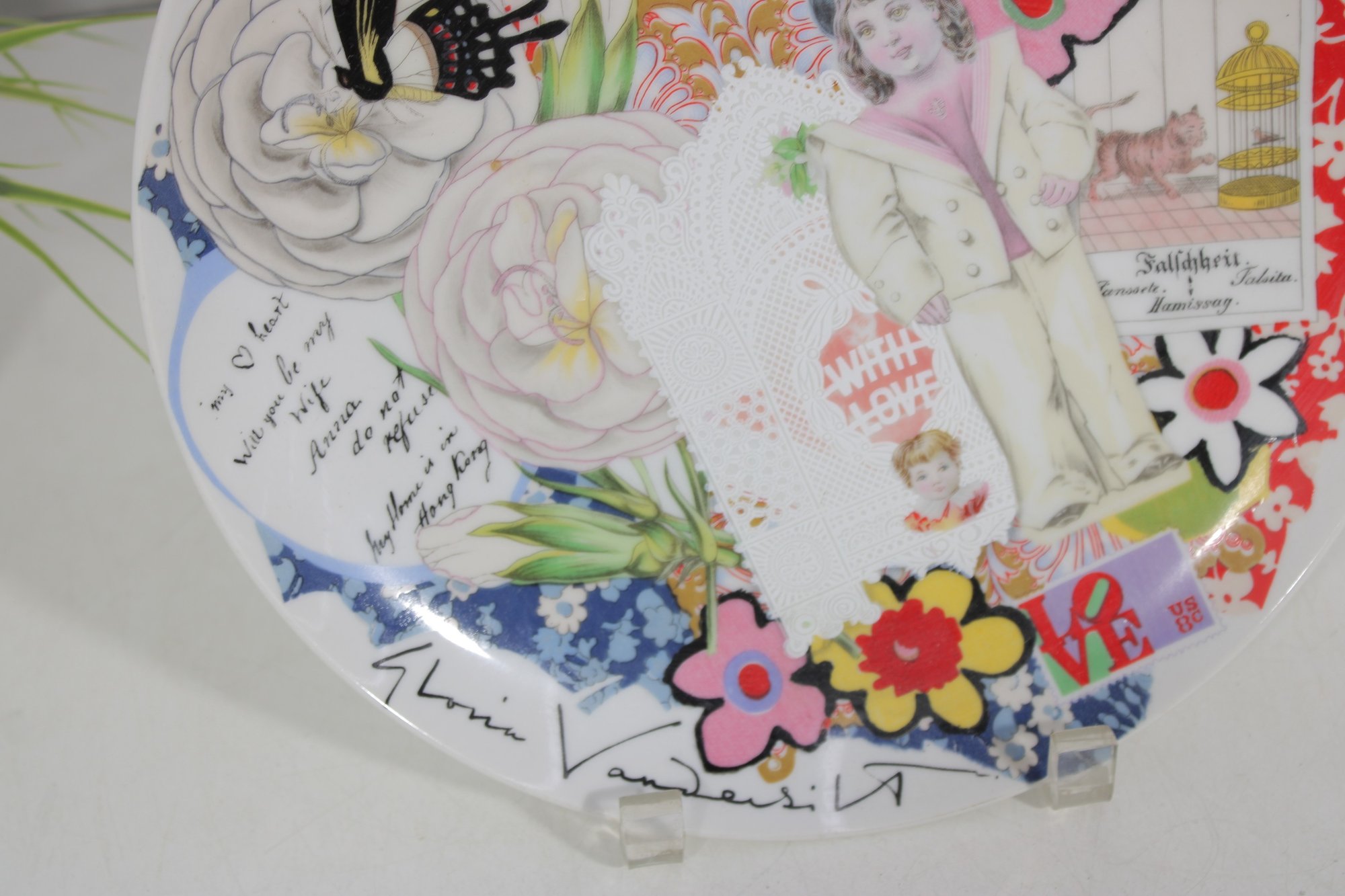 Colorful and collectible vintage decorative plate designed by Gloria Vanderbilt for Taste Setter Sigma, titled “Token of Friendship.” This vibrant 10-inch plate features a charming collage-style design with florals, butterflies, script elements, and a vintage-inspired figure, all rendered in bold and playful colors.
