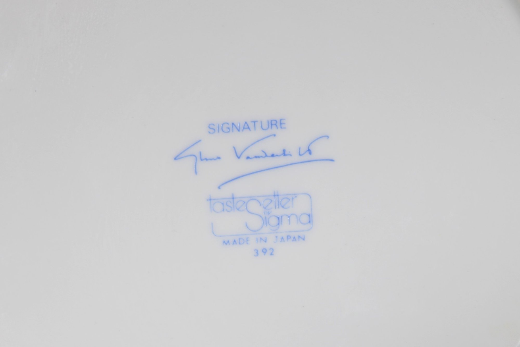 The underside bears the printed signature “Gloria Vanderbilt” along with the Taste Setter Sigma mark, confirming authenticity. This piece dates to the late 20th century and reflects Vanderbilt’s distinctive artistic style.