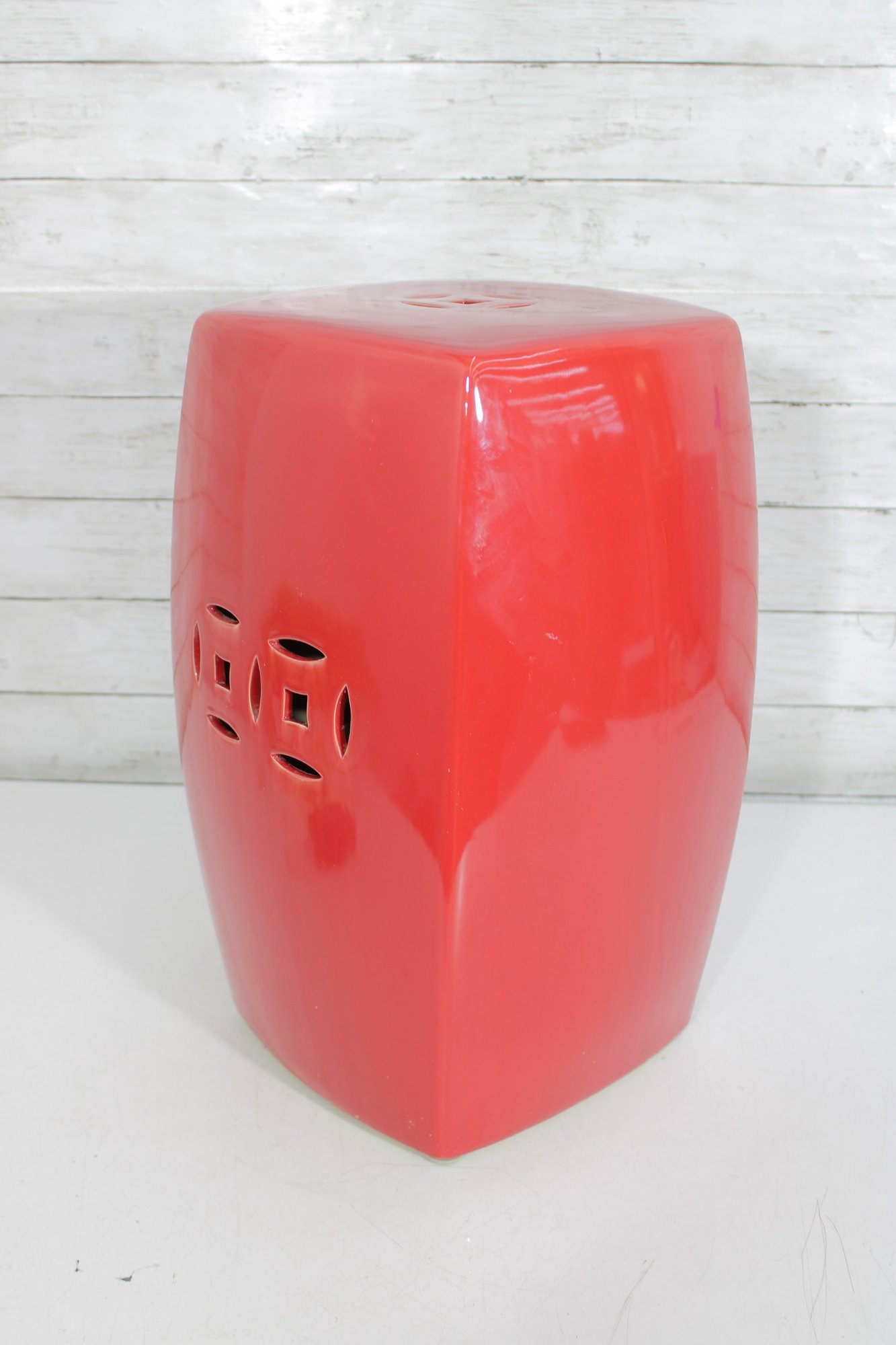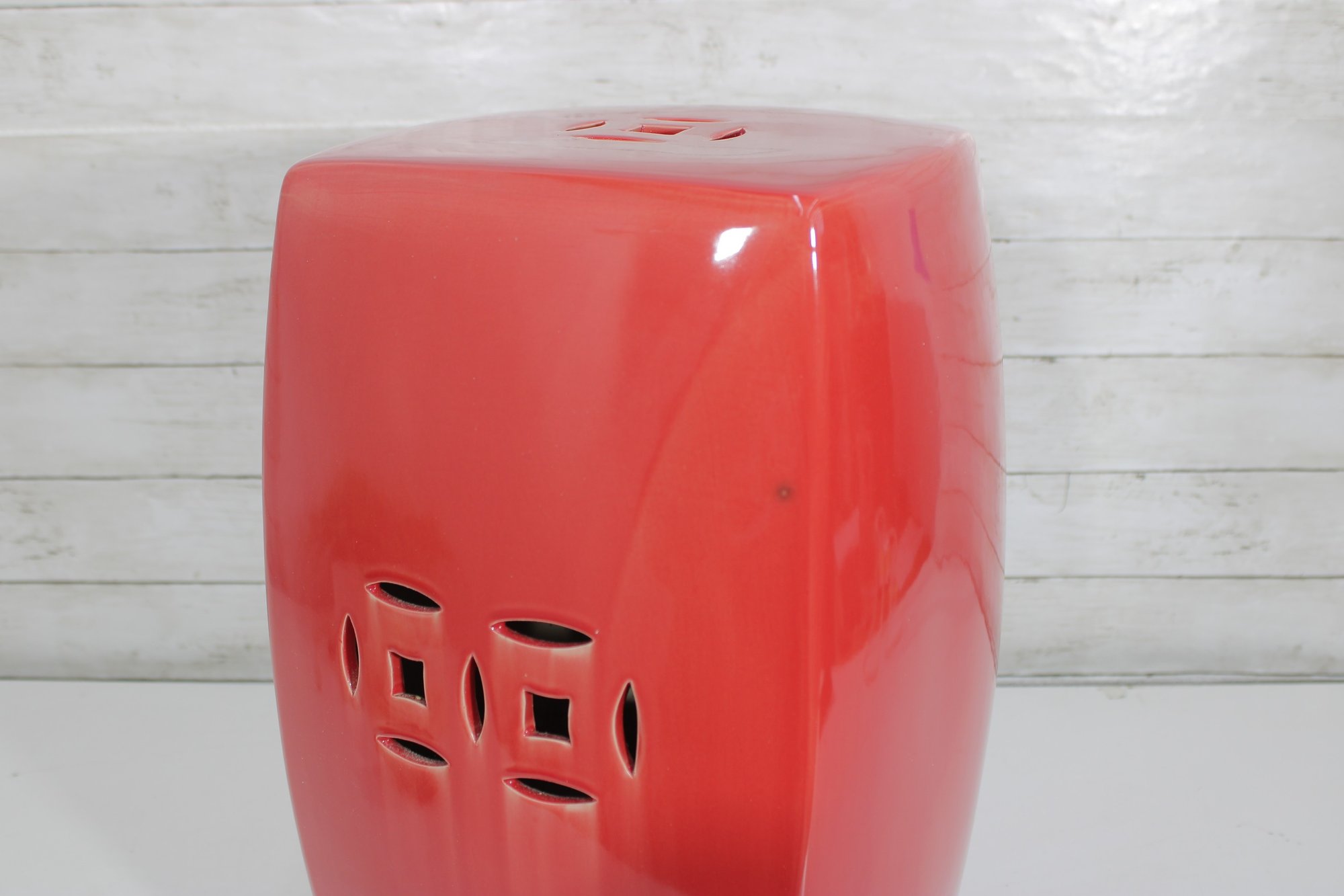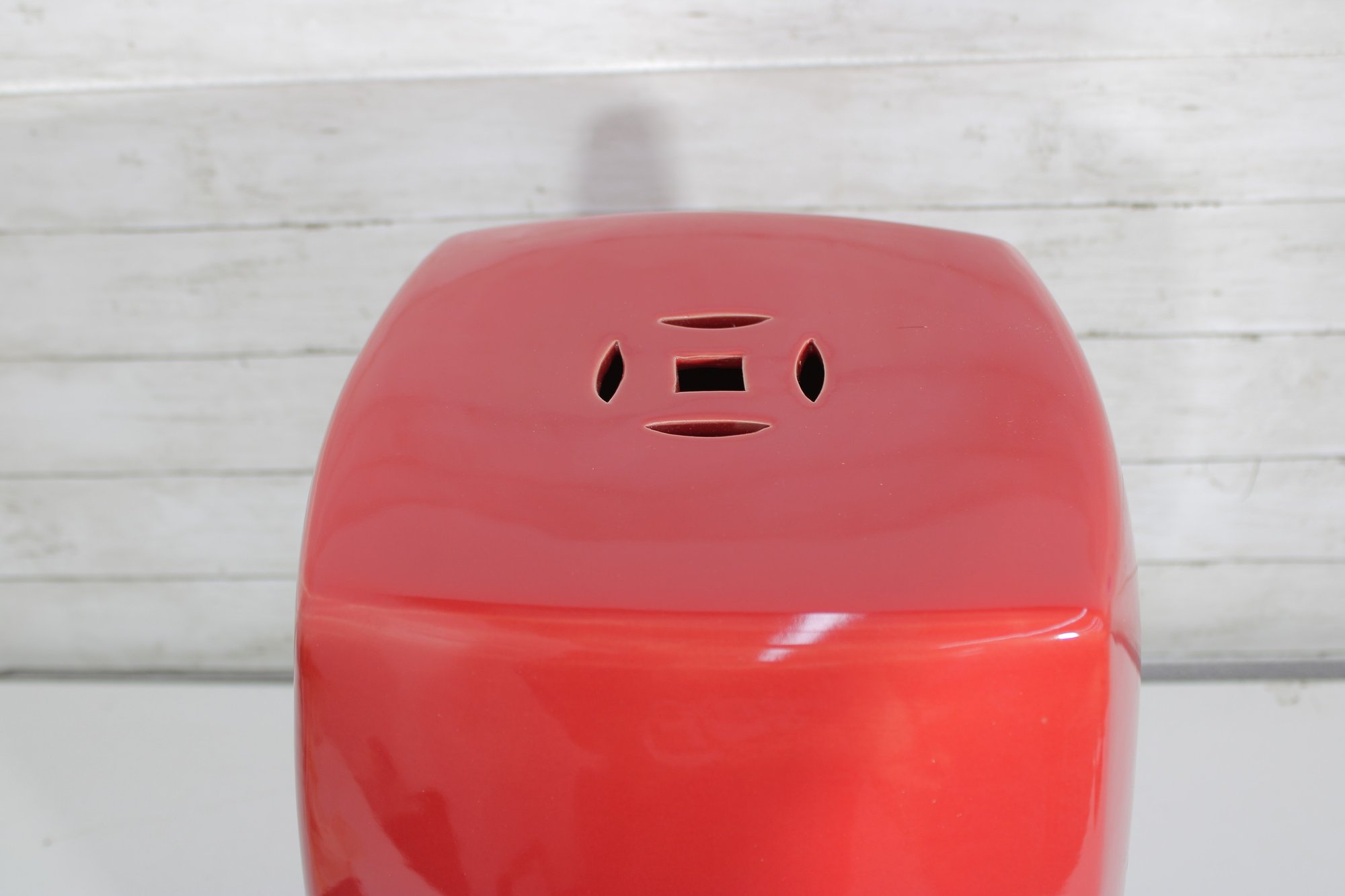 this striking glossy red ceramic garden stool, standing 18 inches tall. With its smooth, modern form and classic pierced details, this piece combines timeless garden stool design with vibrant contemporary style.