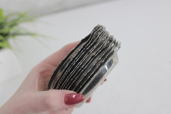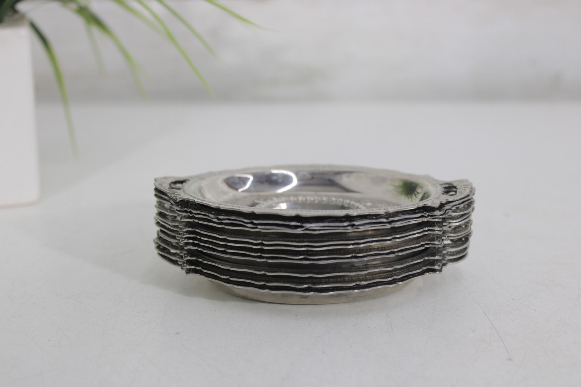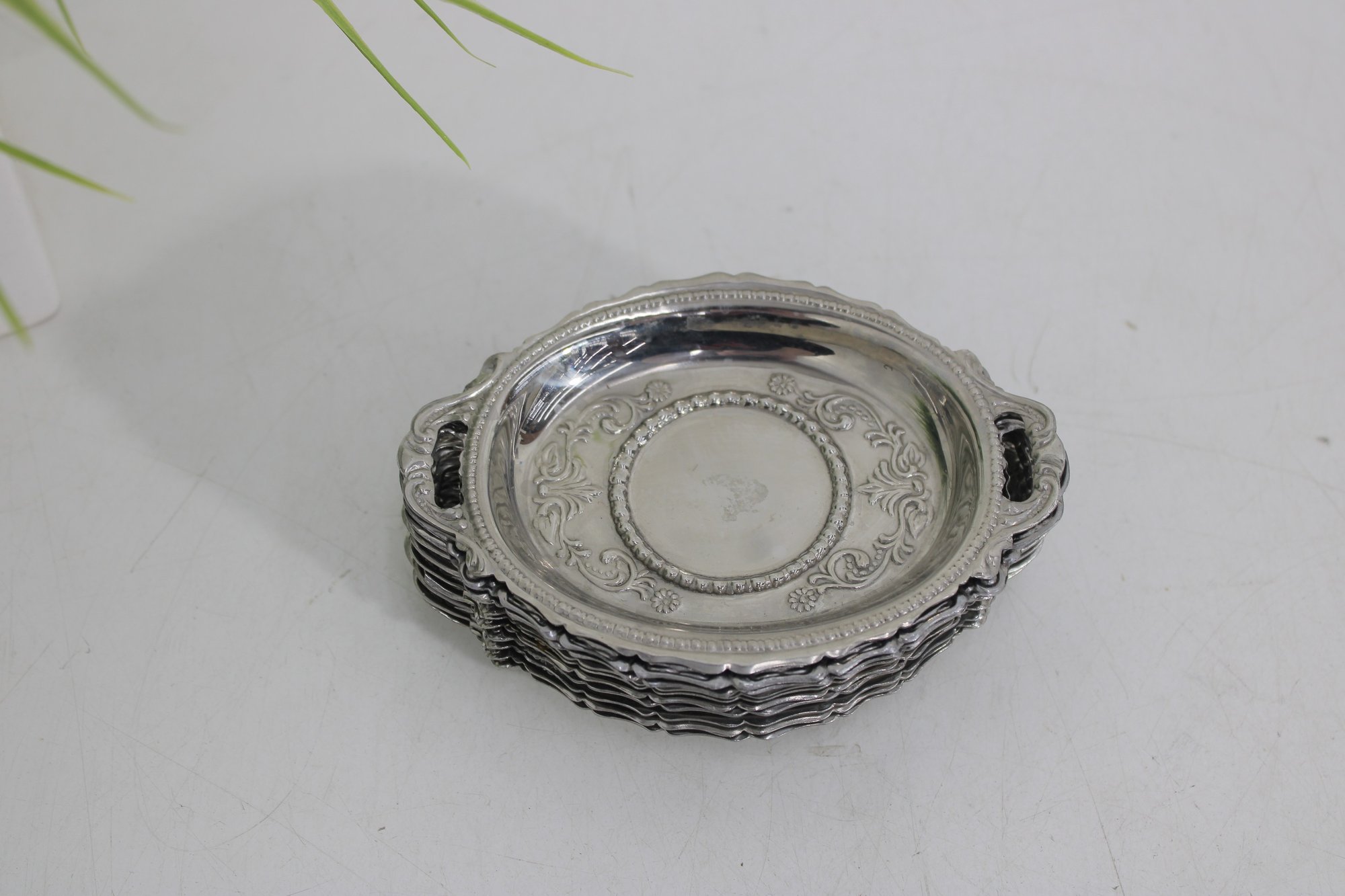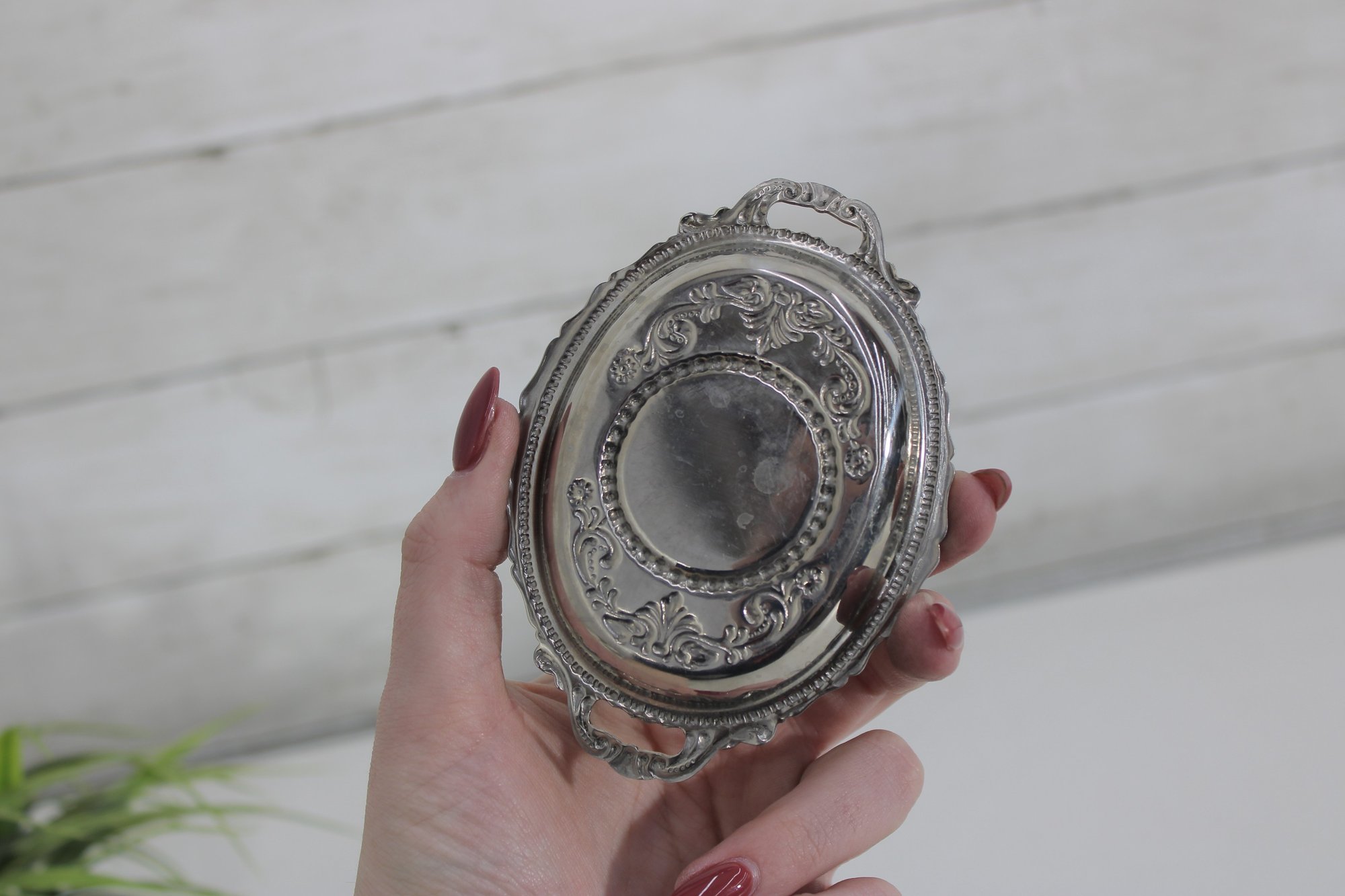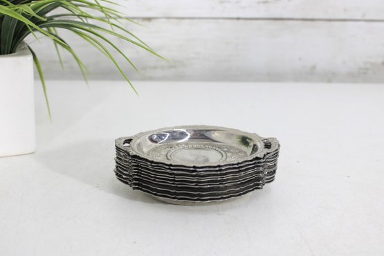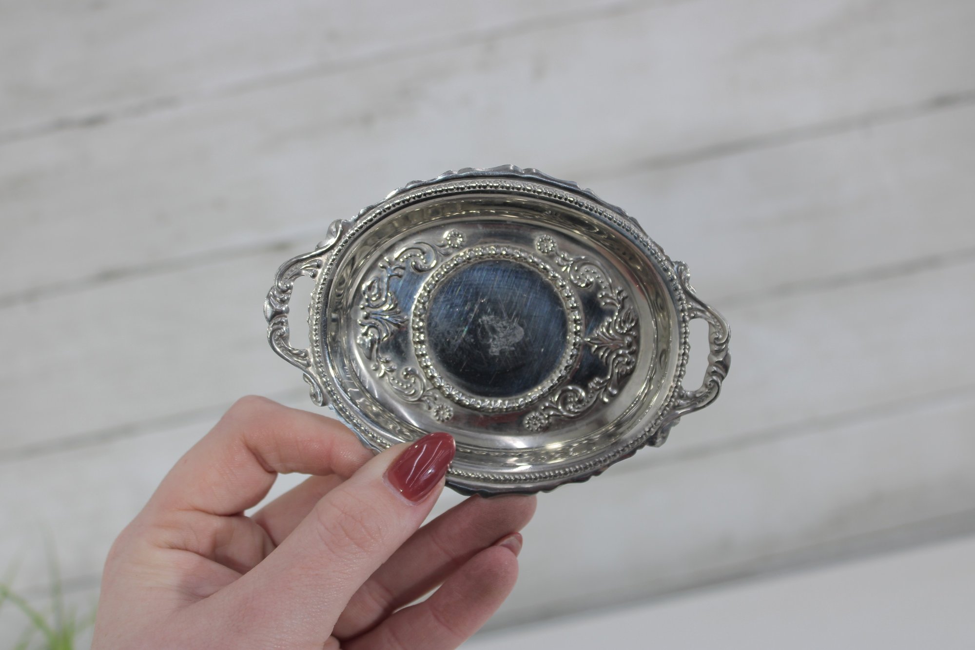 These small oval trays feature decorative borders and petite side handles, giving them an elegant vintage look. The interiors display subtle engraved detailing around the center medallion area. Perfectly sized for dollhouse displays, individual butter pats, small desserts, salt cellars, or decorative place settings.
