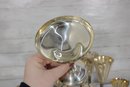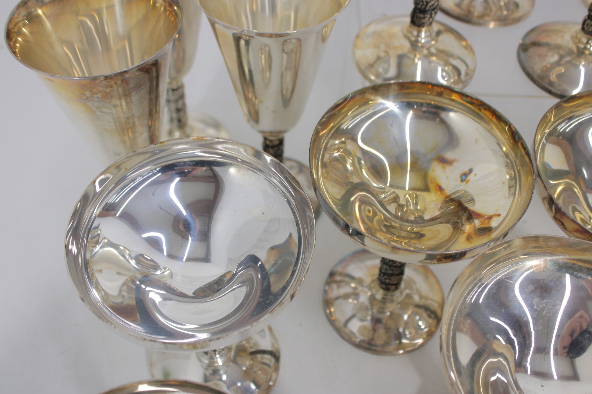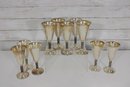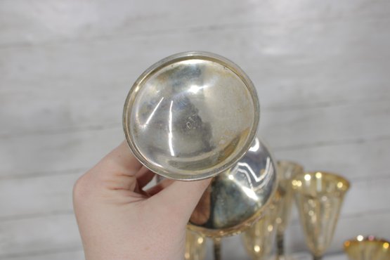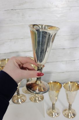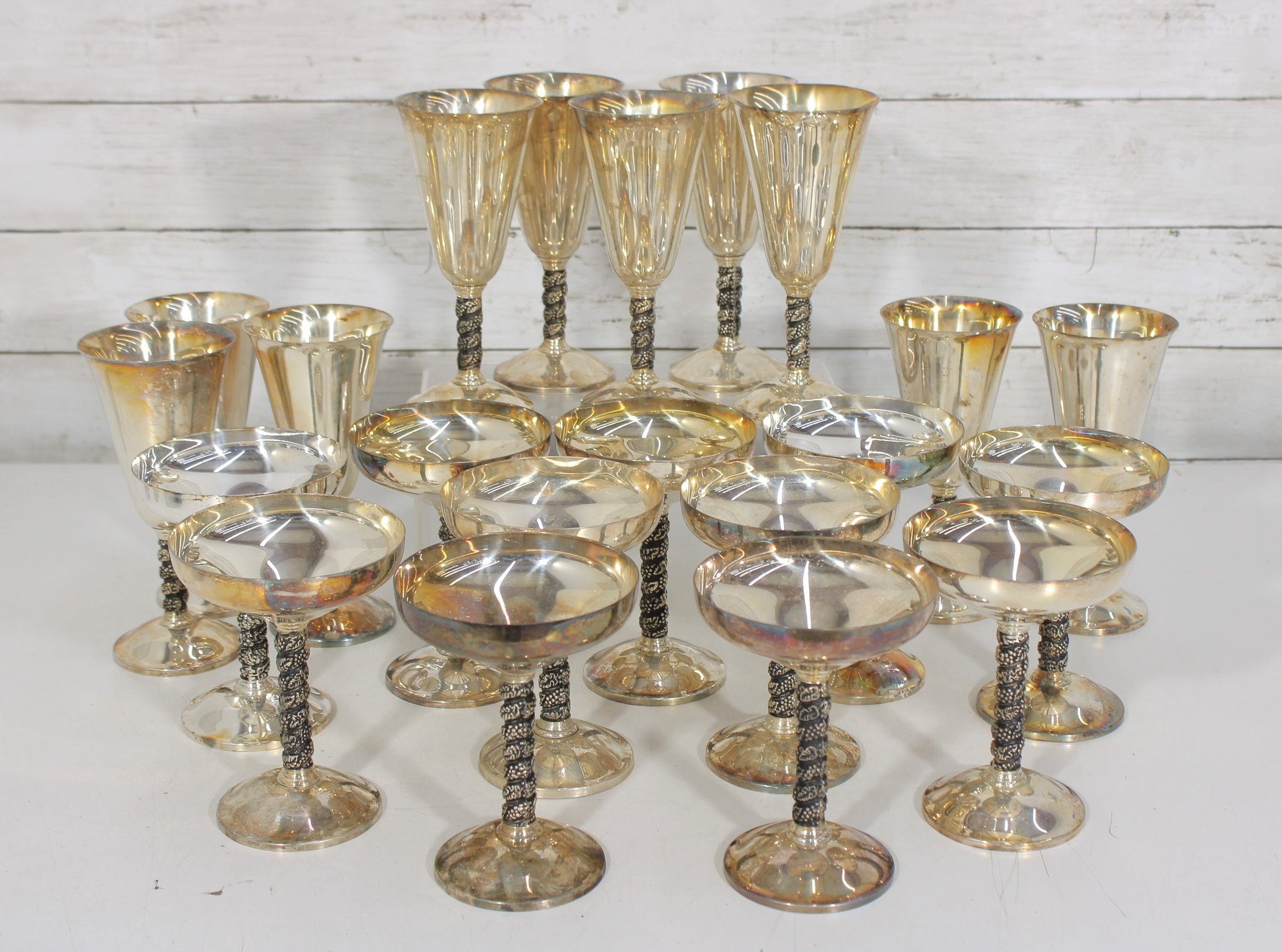 vintage silver plate stemmed goblets, marked “Made in Spain.” This beautiful matching set features two coordinating sizes with decorative stems and polished bowls, perfect for entertaining or display.