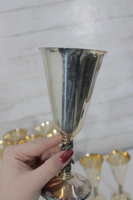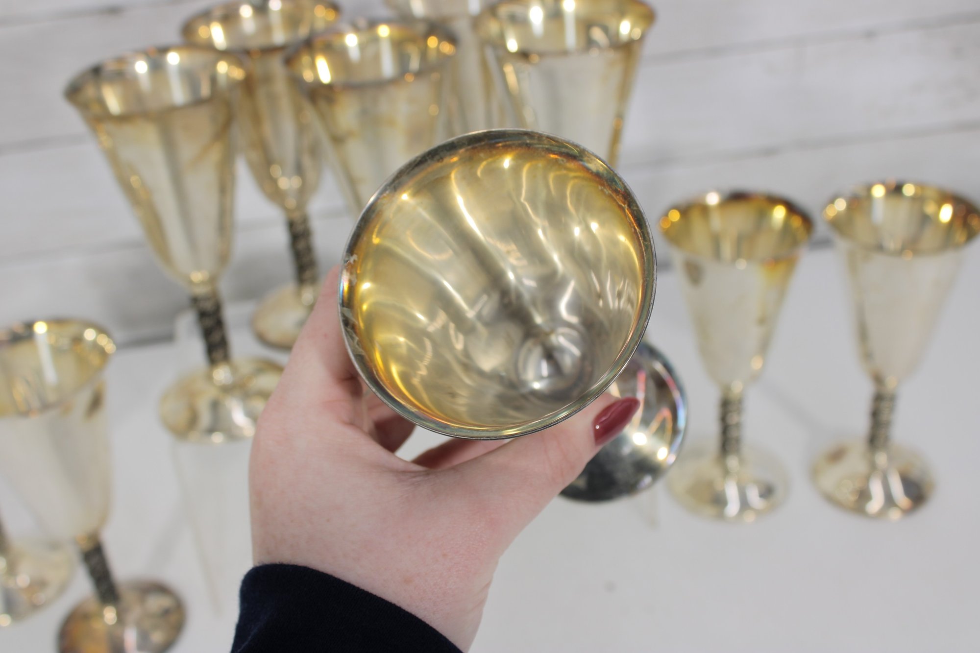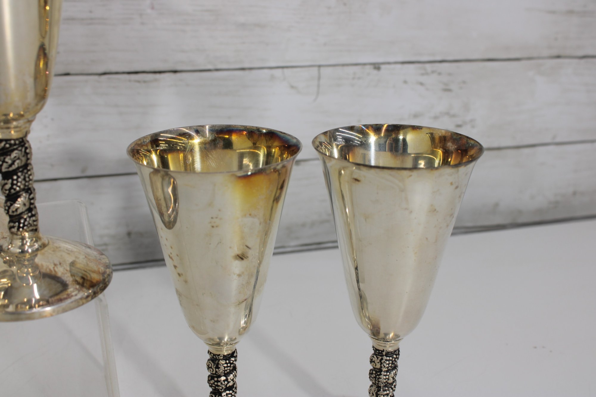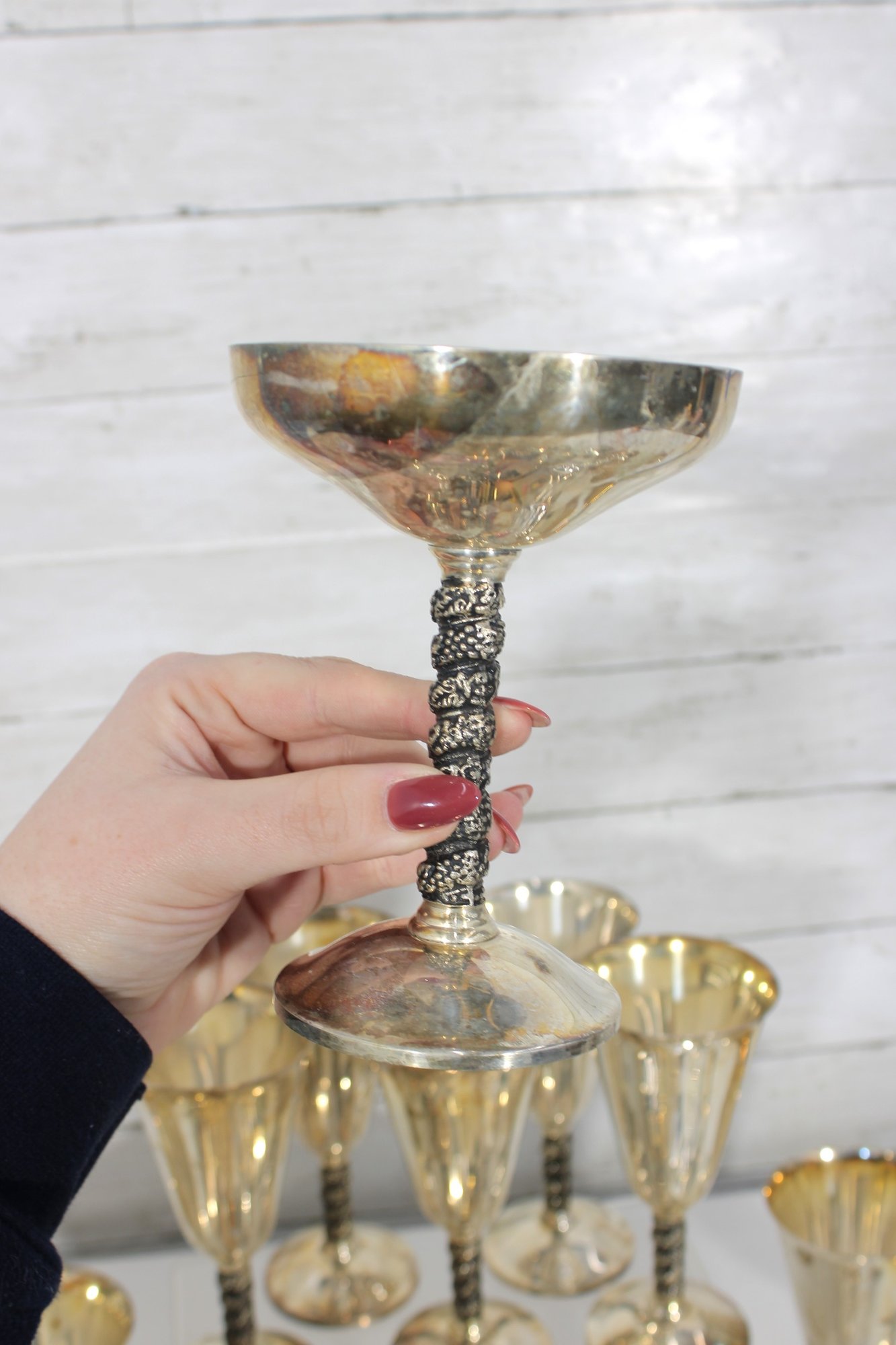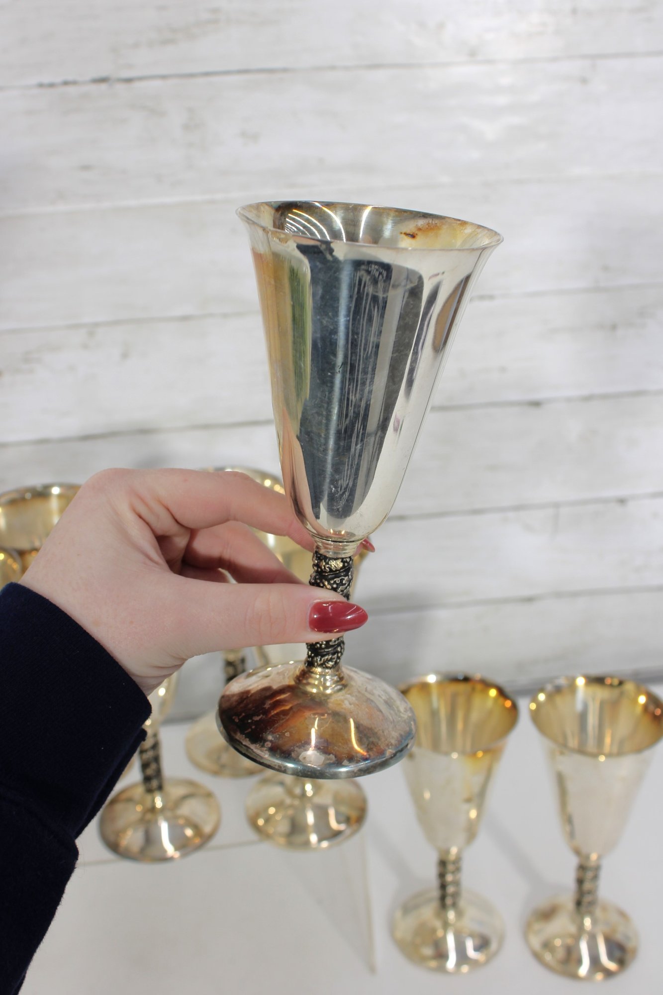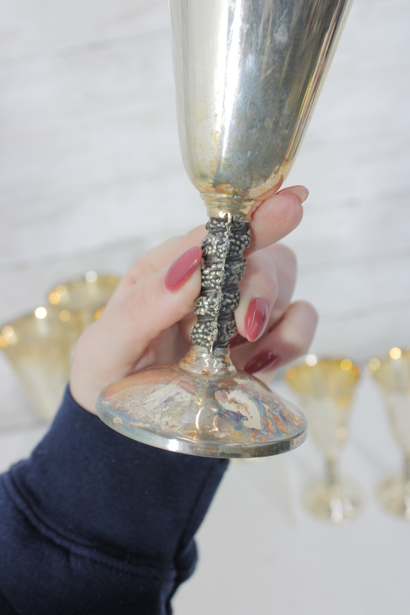 The goblets showcase a classic flared bowl design with warm silver-tone finish and ornate textured stems that add visual interest and vintage charm.