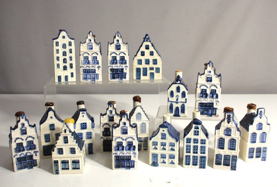 A charming collection of 17 KLM Delft Blue ceramic canal house miniatures. These finely crafted miniatures replicate traditional Dutch canal houses, each one featuring unique architectural designs. A perfect addition for collectors of Delft Blue or Dutch souvenirs. Some still include cork tops. All pieces appear to be in good condition with no visible cracks or chips. A wonderful display set to bring a touch of classic Dutch culture to your home or collection!