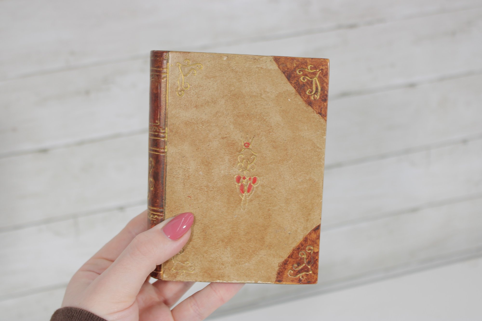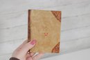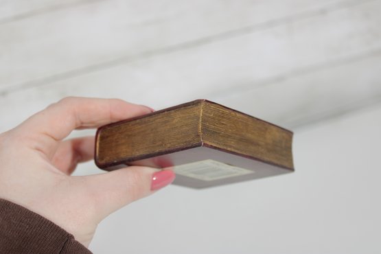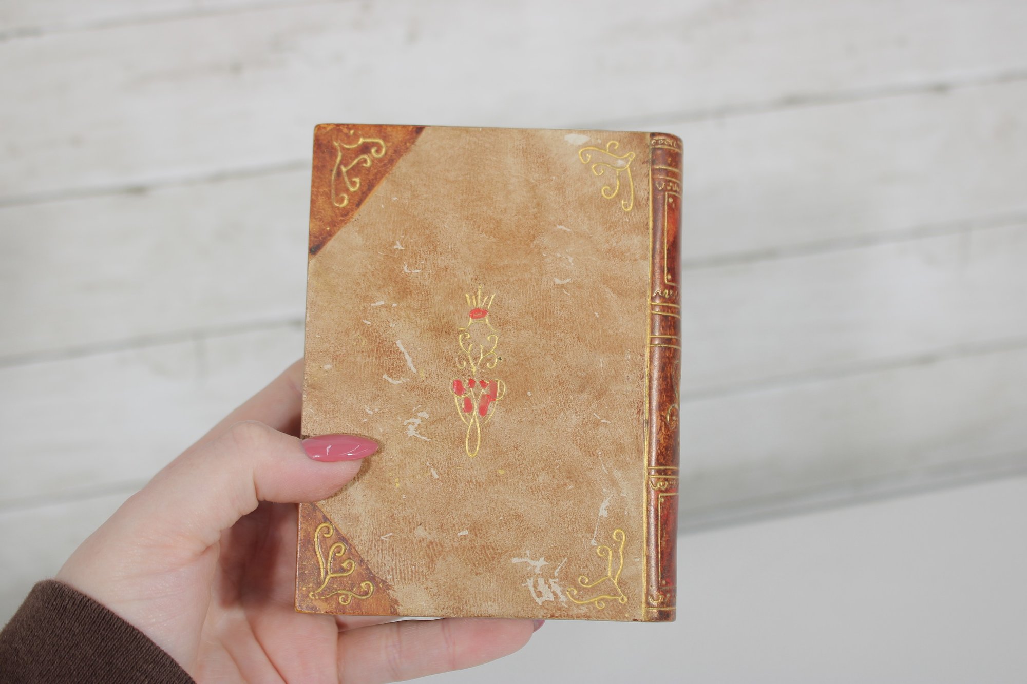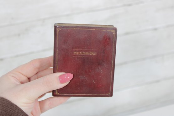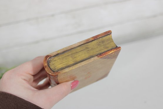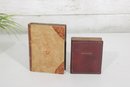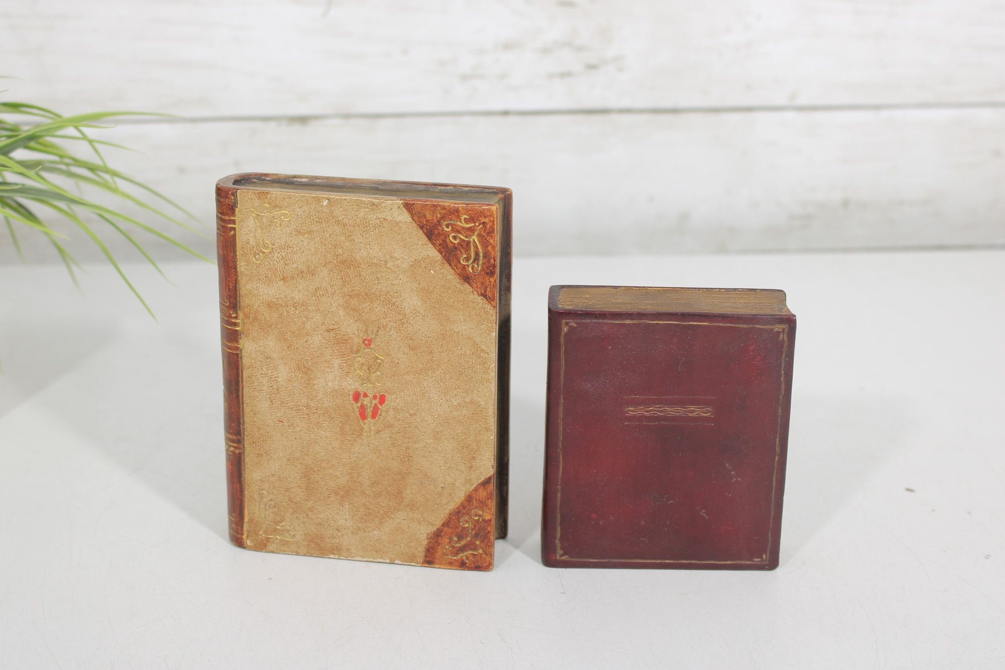 Charming lot of two decorative leather like -(Resin) books, featuring richly embossed spines with gold gilt detailing. These small vintage volumes have classic old-world styling, making them ideal for decorative display on a shelf, desk, or in a vintage library setting.