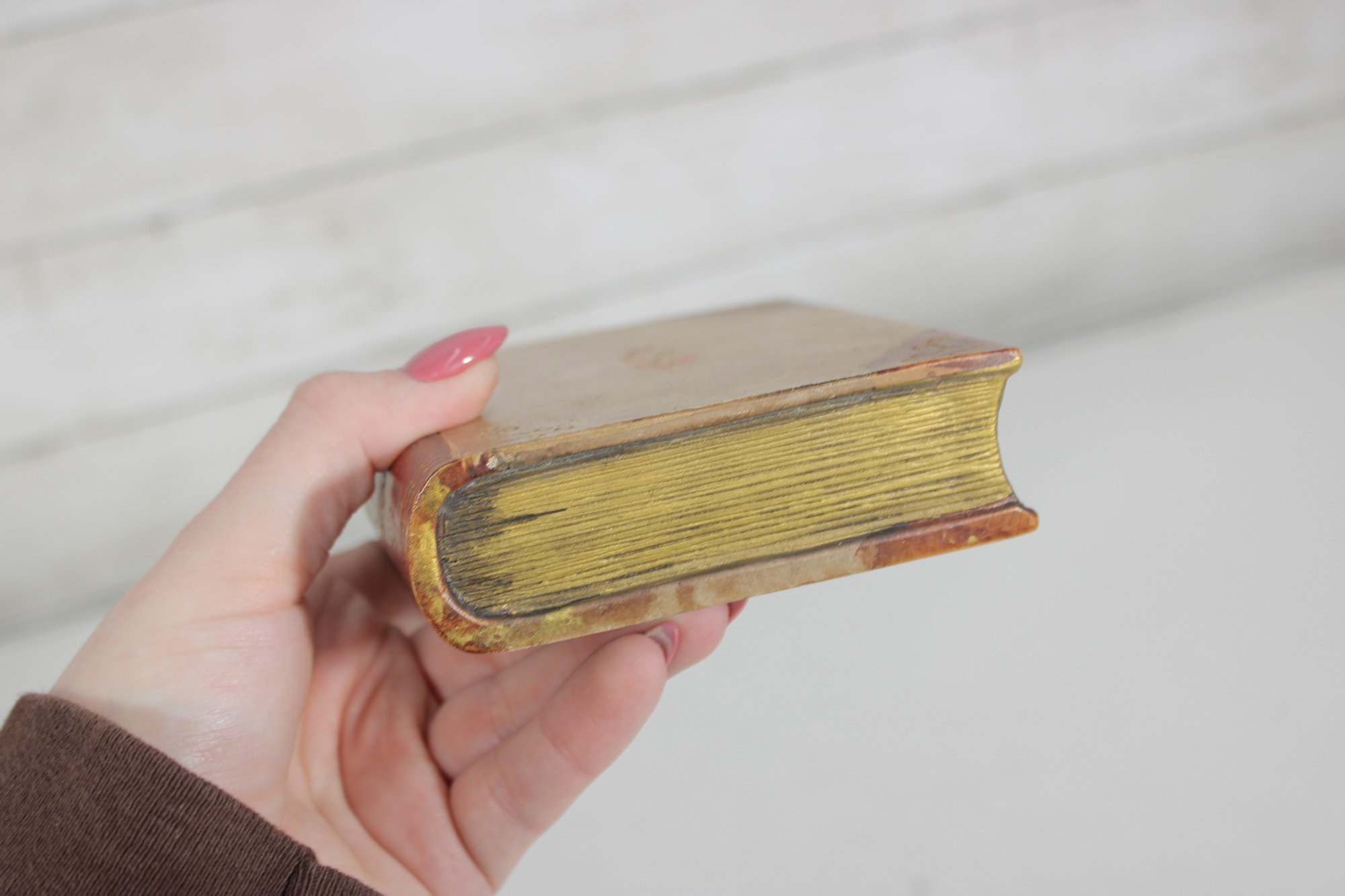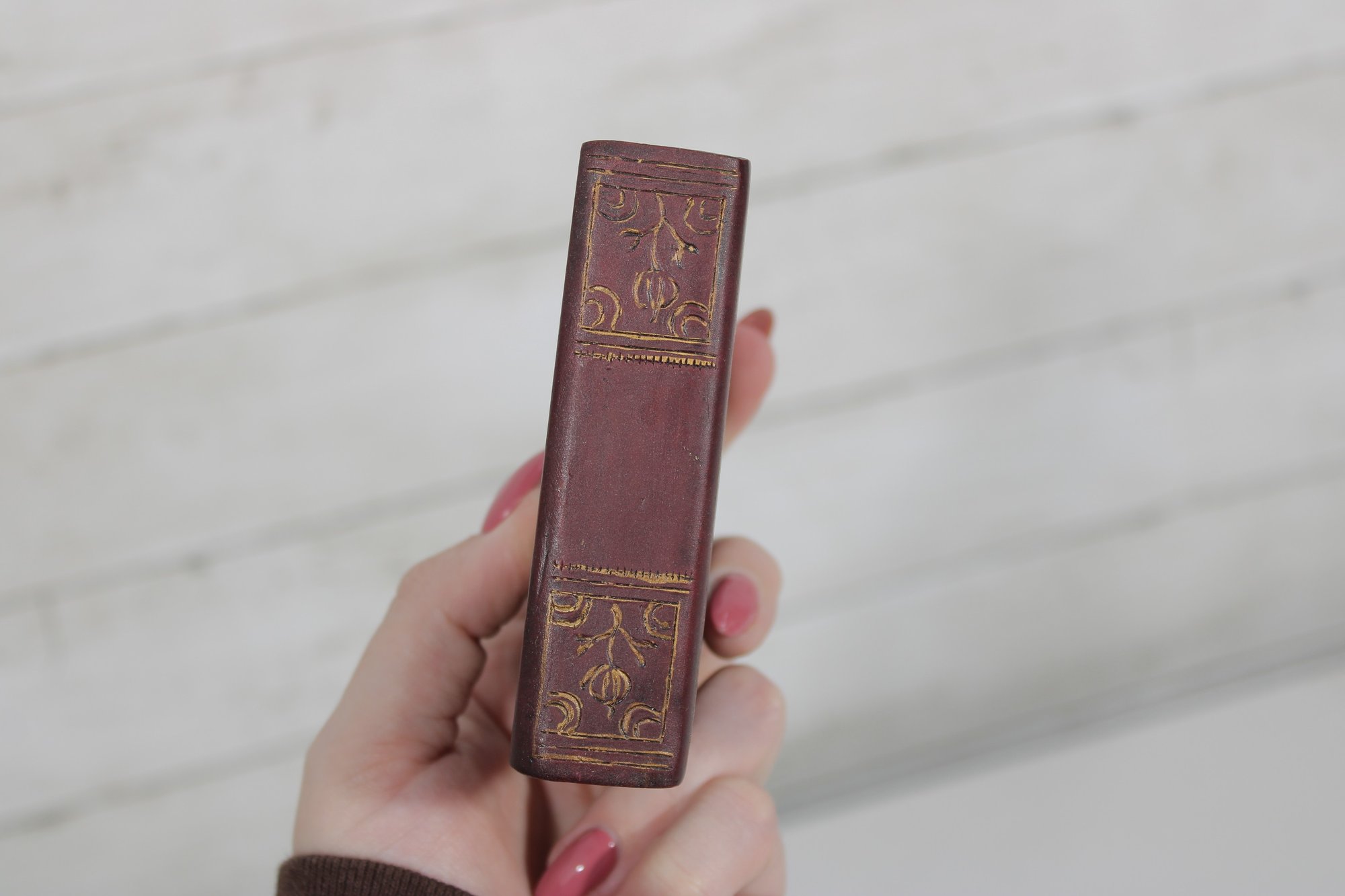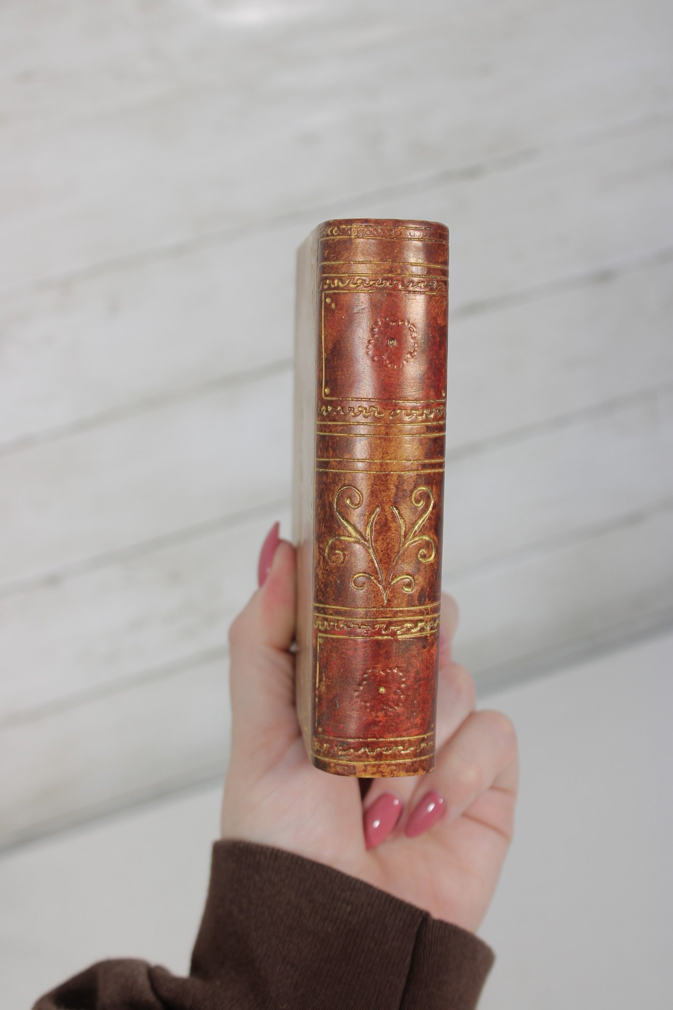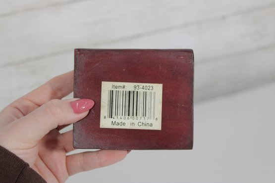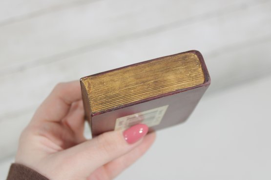 Charming lot of two decorative leather like -(Resin) books, featuring richly embossed spines with gold gilt detailing. These small vintage volumes have classic old-world styling, making them ideal for decorative display on a shelf, desk, or in a vintage library setting.