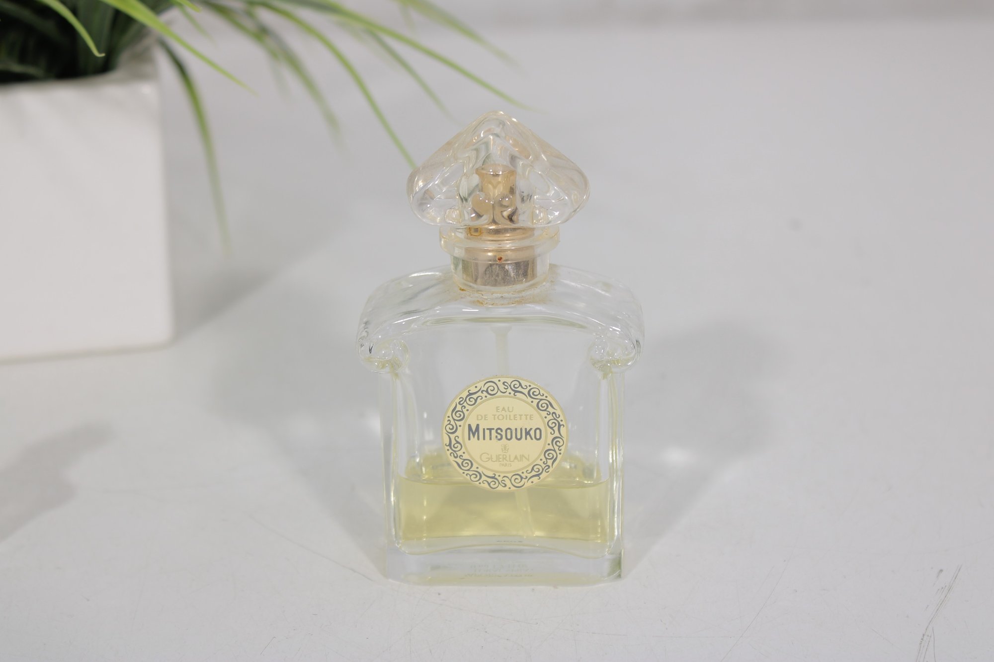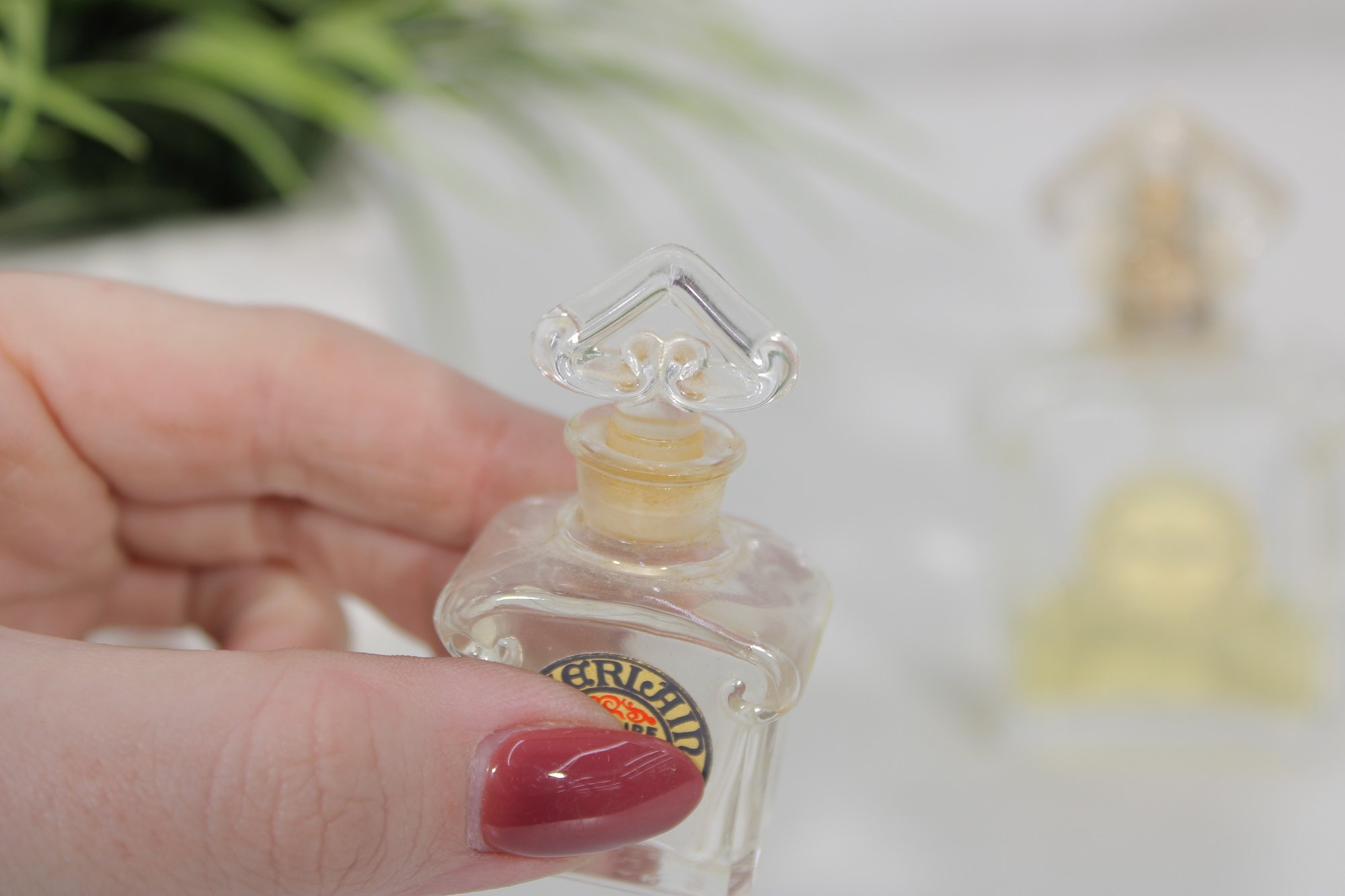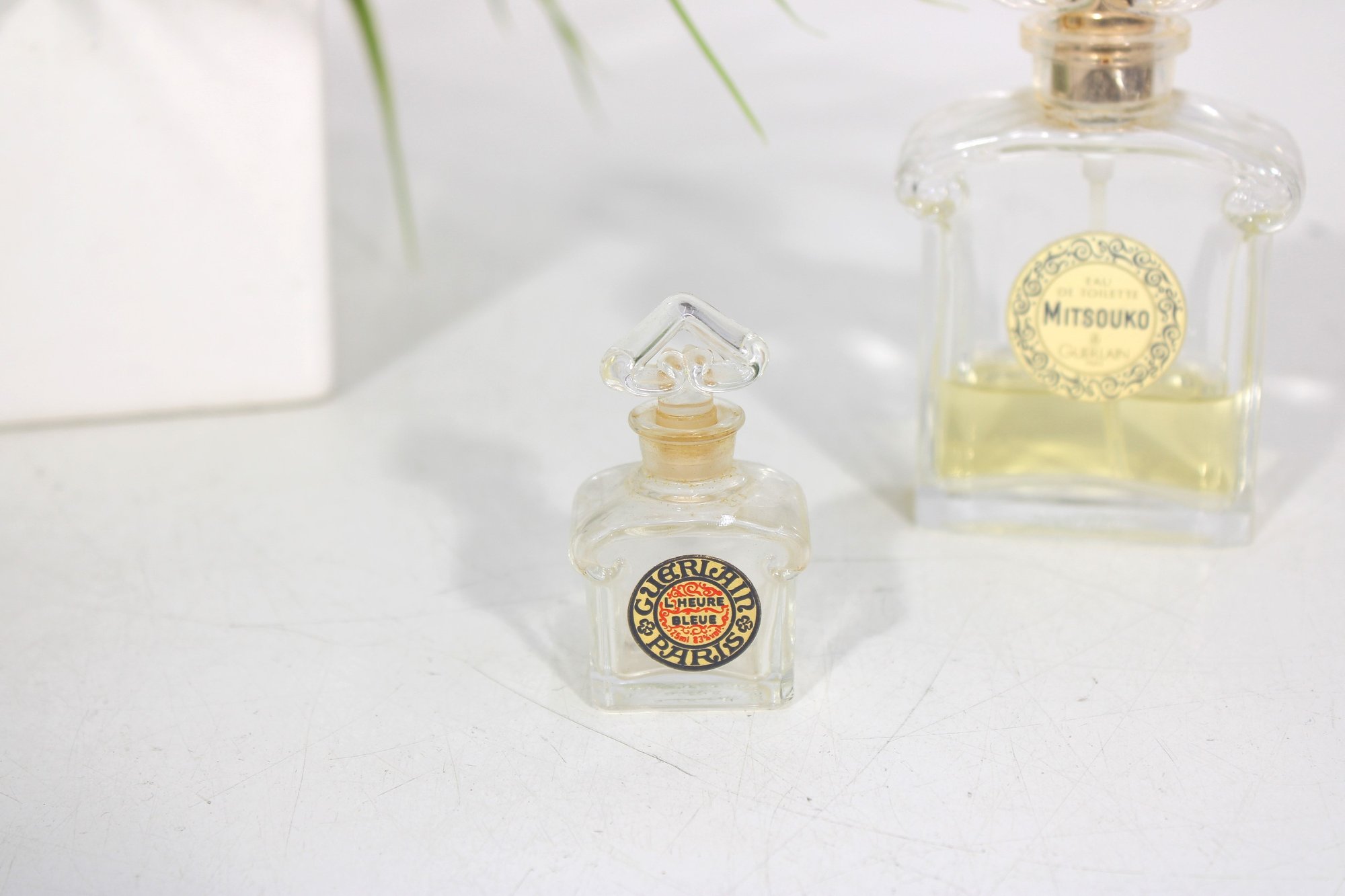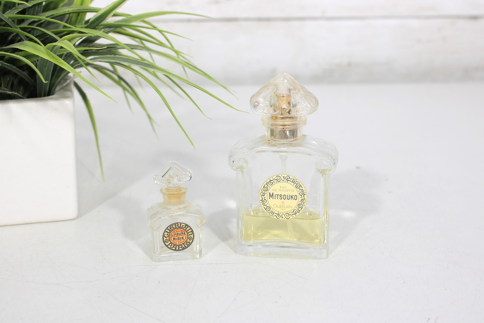 Both bottles are in nice vintage condition with light wear consistent with age. The L’Heure Bleue bottle is empty. The Mitsouko bottle retains approximately 25% of the original fragrance. Please review all photos carefully as they are part of the description and show fill levels and condition.