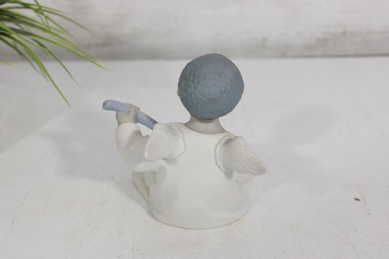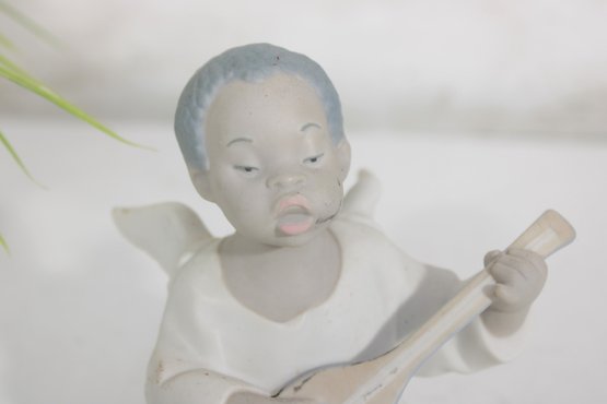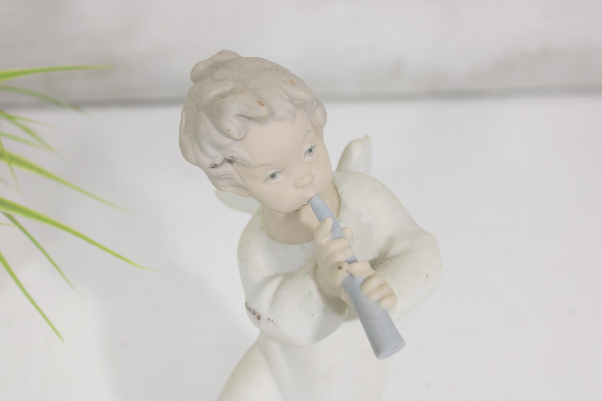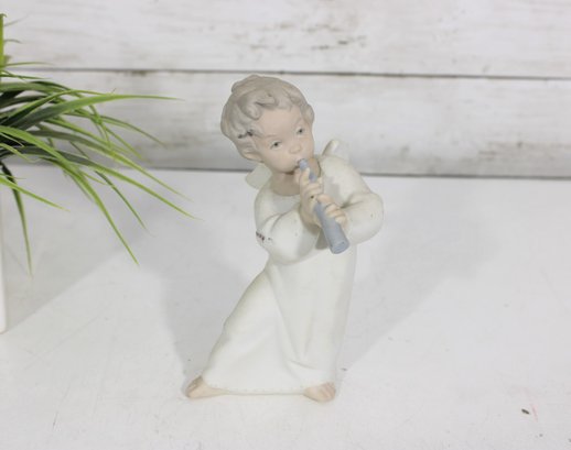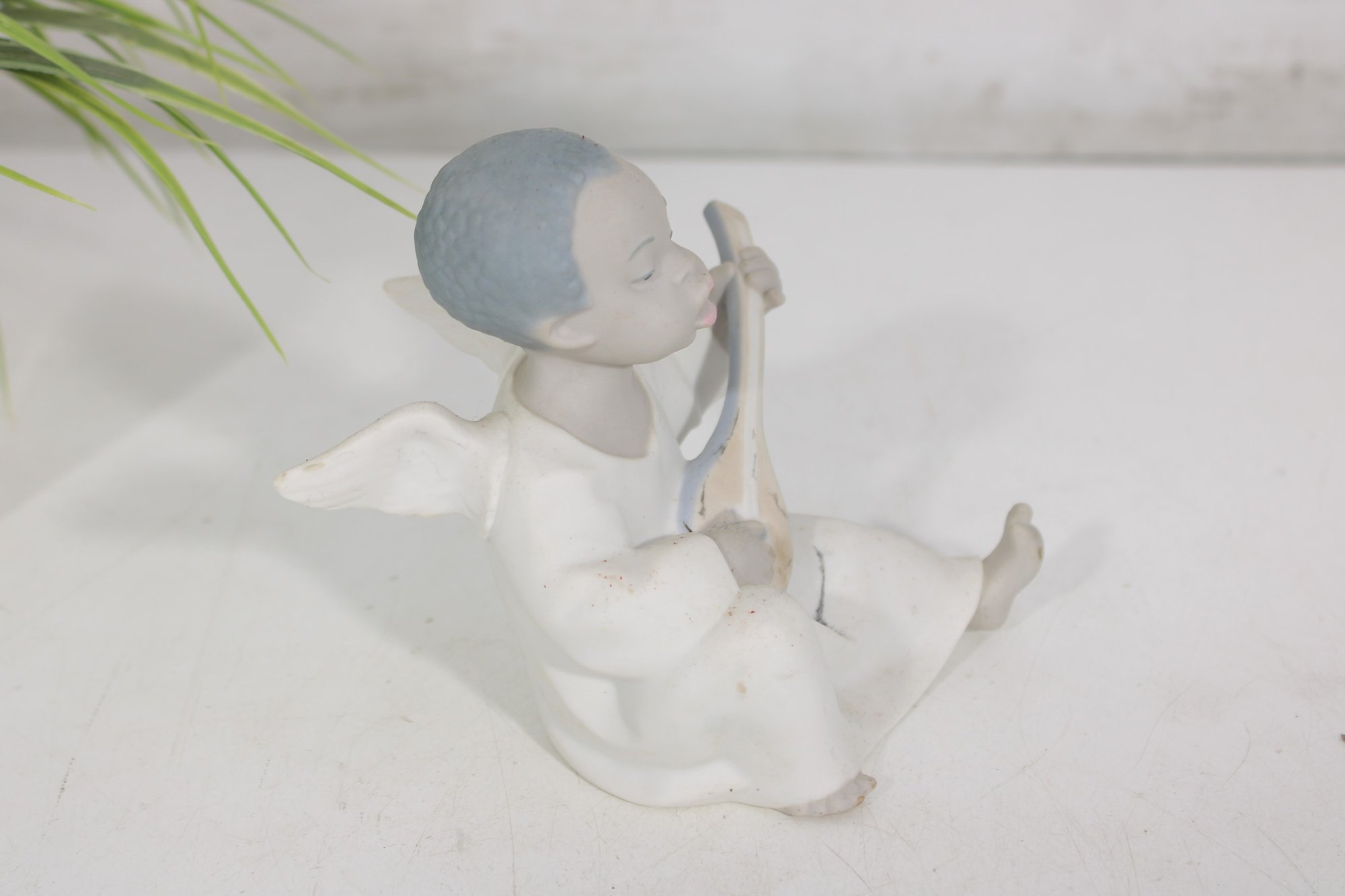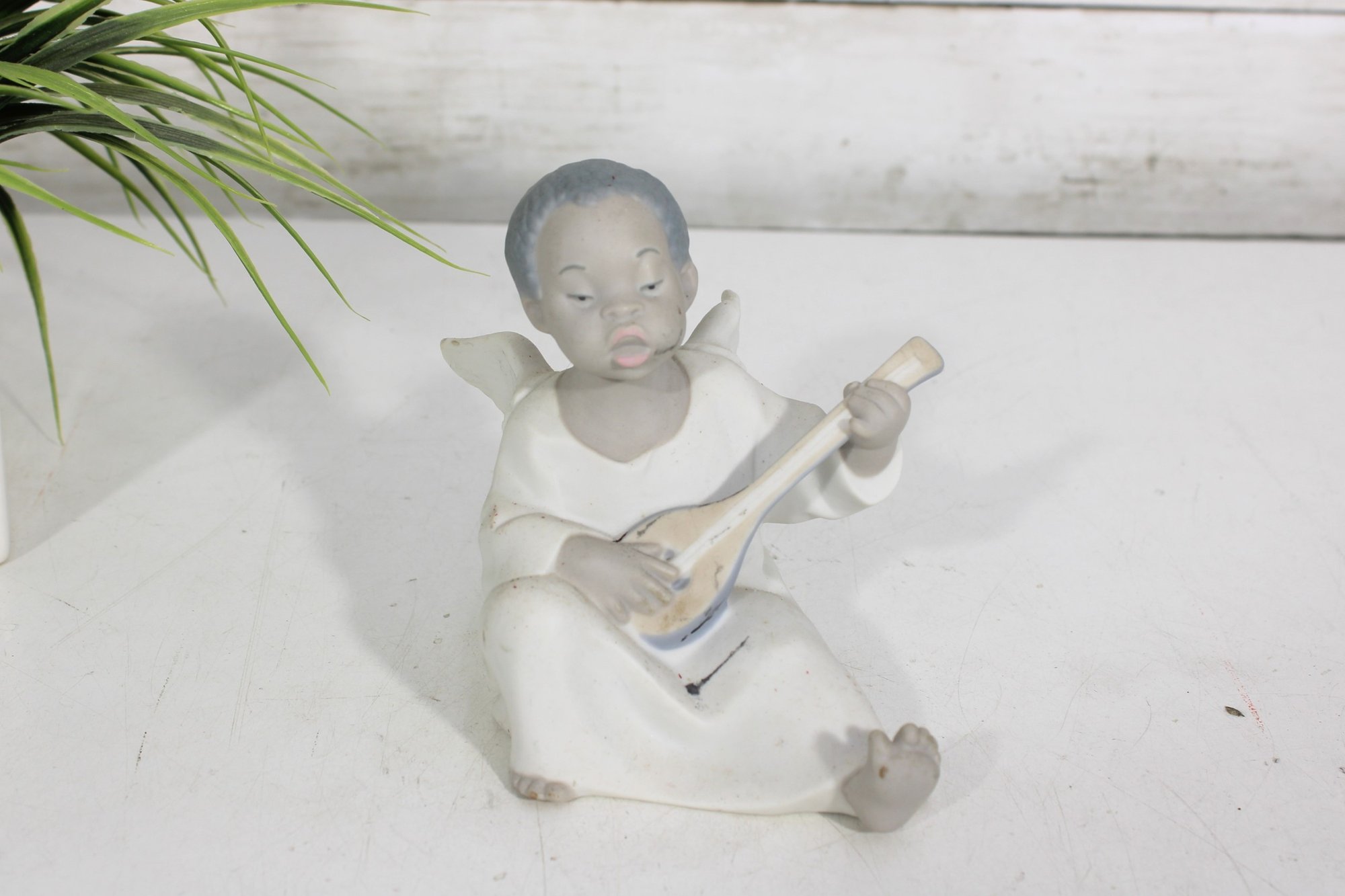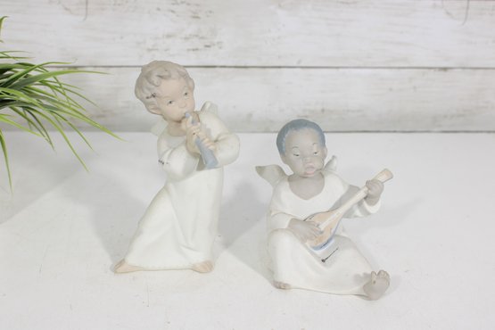 Lovely lot of two Lladro porcelain figurines featuring angelic children playing musical instruments, finished in Lladro’s signature soft matte glaze. This charming pair includes one seated angel playing a stringed instrument and one standing angel playing a flute, both rendered with gentle expressions and delicate detailing.