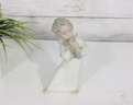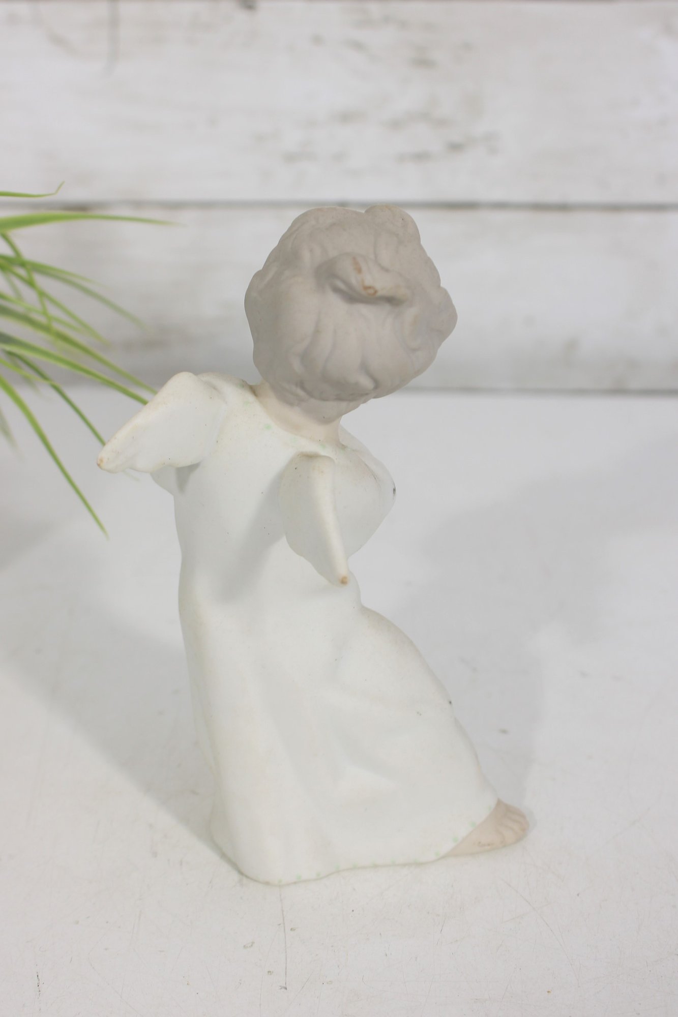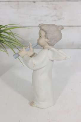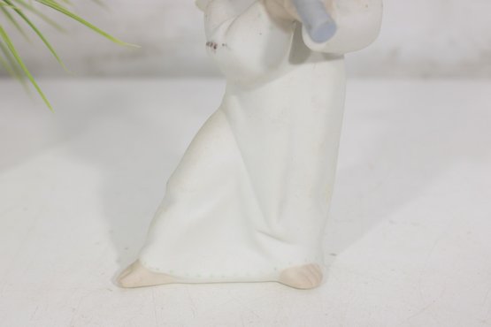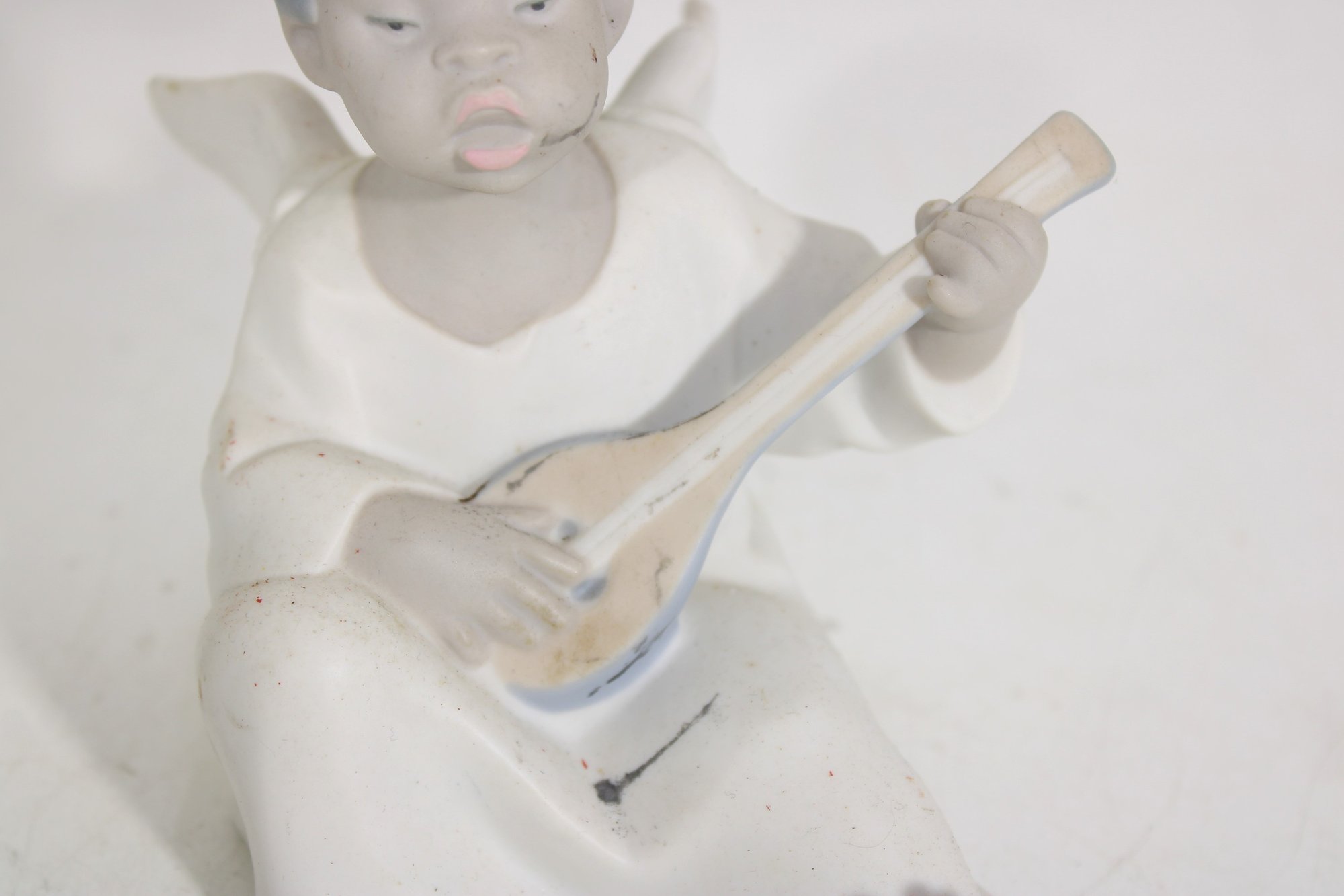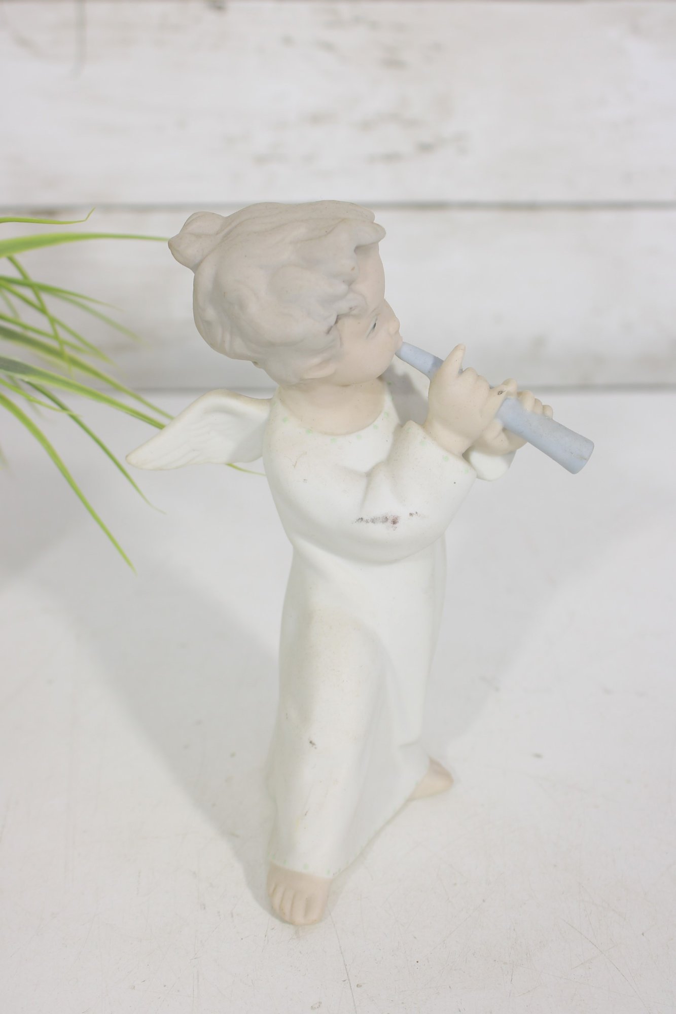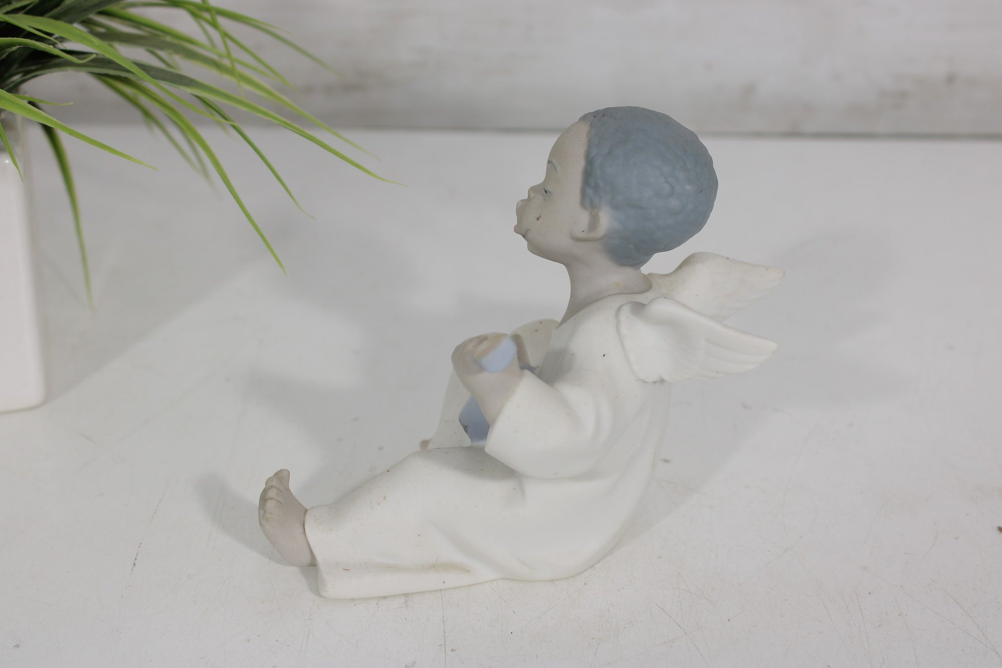 Lovely lot of two Lladro porcelain figurines featuring angelic children playing musical instruments, finished in Lladro’s signature soft matte glaze. This charming pair includes one seated angel playing a stringed instrument and one standing angel playing a flute, both rendered with gentle expressions and delicate detailing.