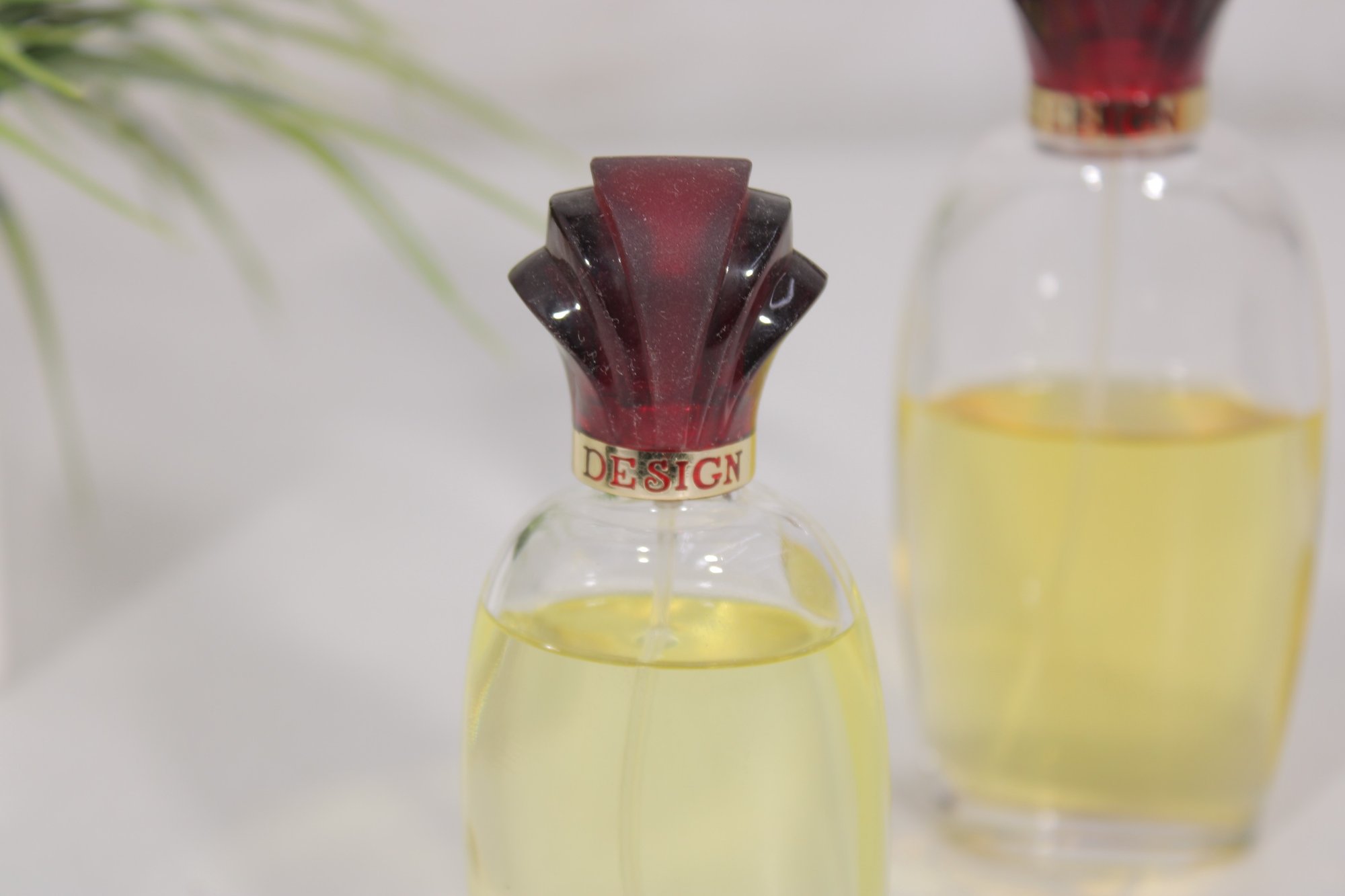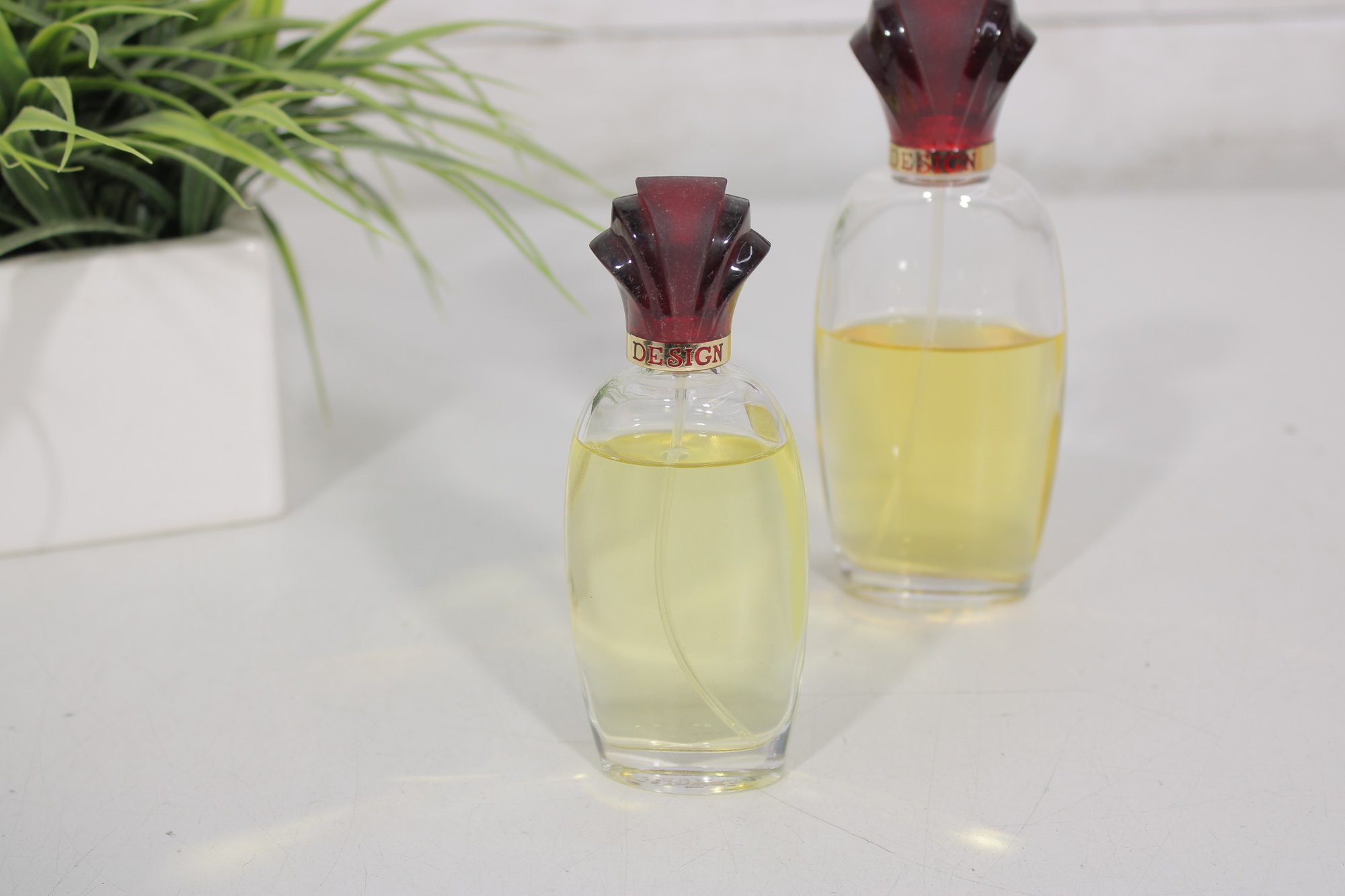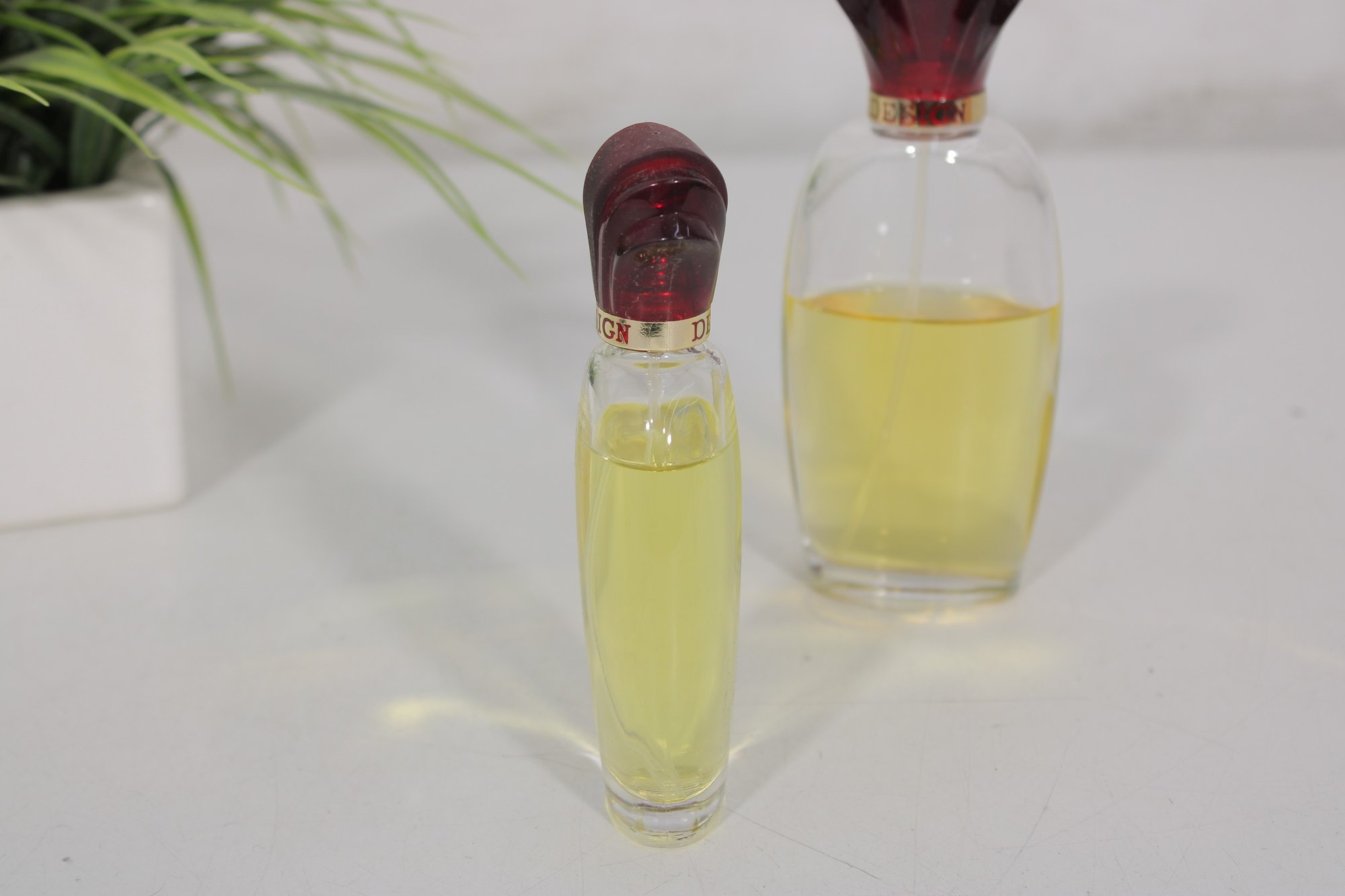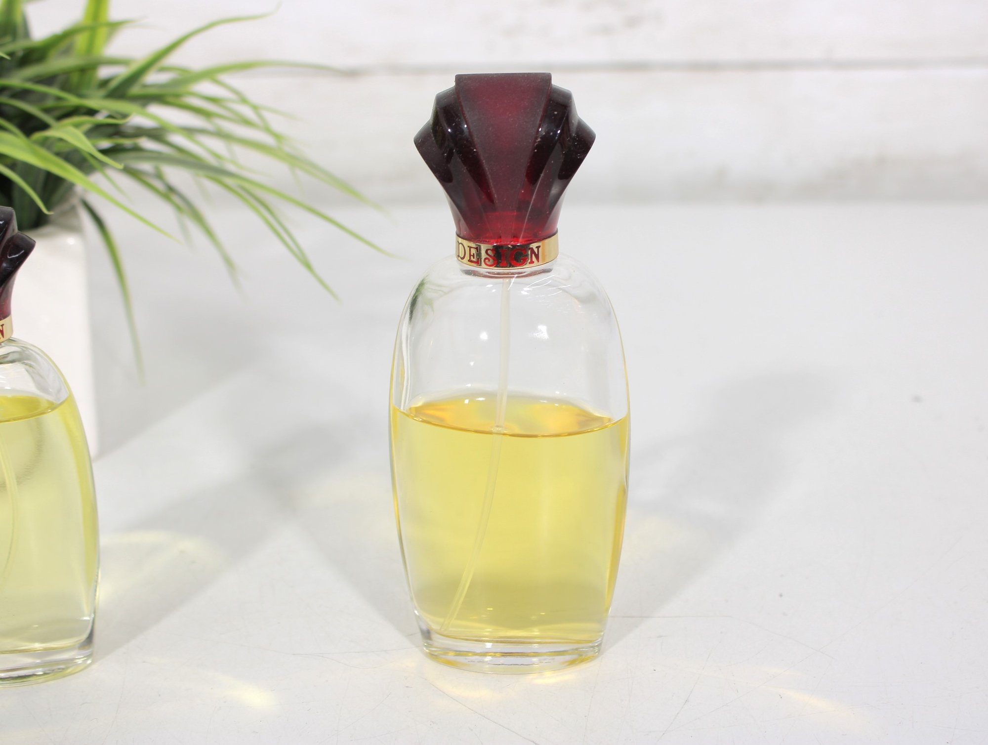 These classic women’s fragrances feature the iconic oval glass bottles with distinctive deep burgundy sculpted caps and gold-tone neck bands marked “DESIGN.”