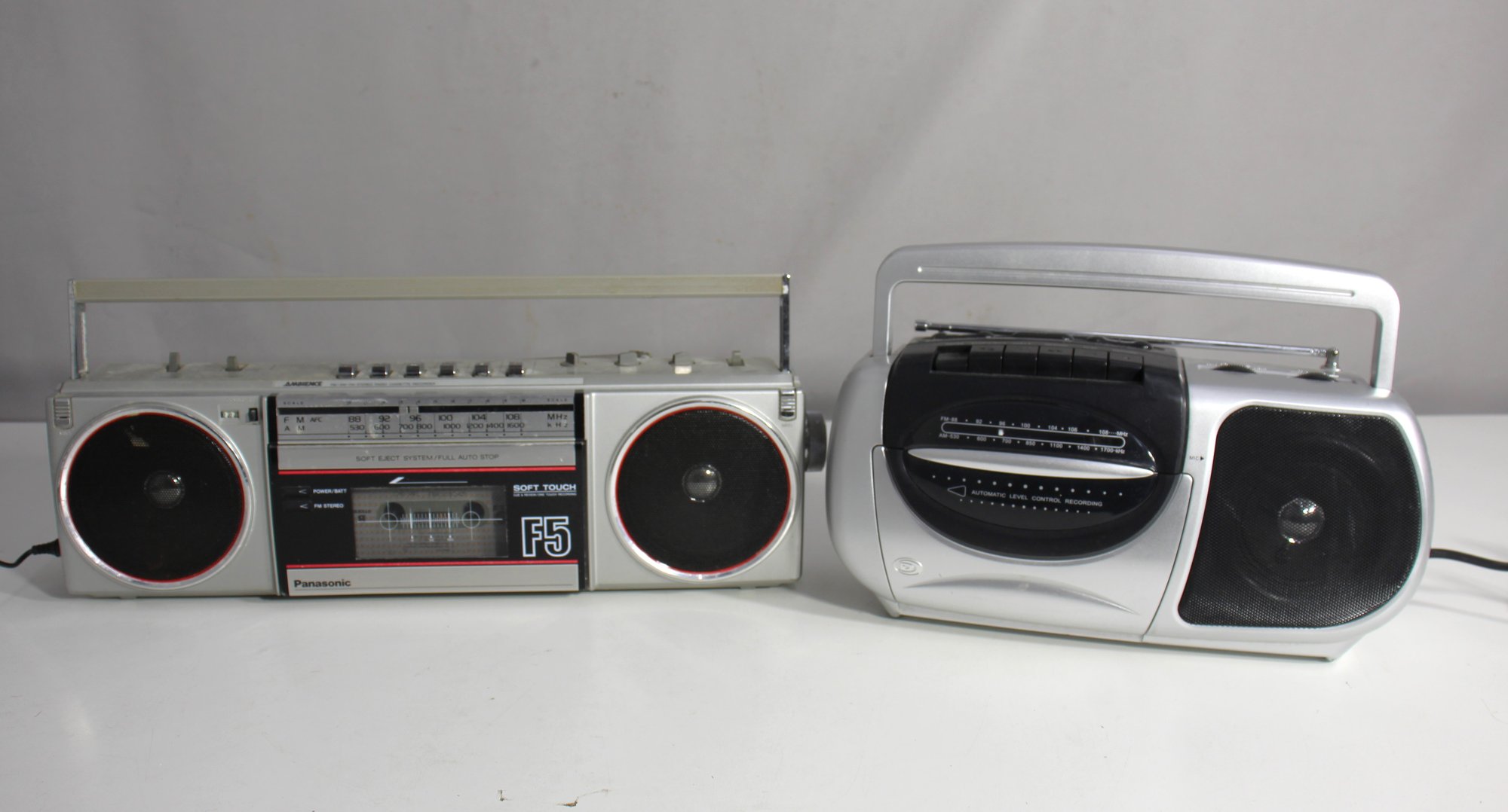 This lot includes two vintage boomboxes: a Panasonic F5 with its classic design and dual speakers, and a silver boombox with AM/FM radio and cassette functions. Both units are untested and sold as-is. These boomboxes are ideal for collectors or those interested in retro audio equipment. Their nostalgic style and functionality make them great display pieces or potential restoration projects. Perfect for fans of vintage electronics and audio history.