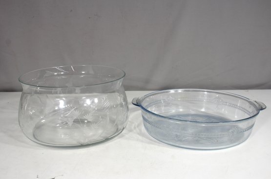 This beautiful lot of two vintage glass bowls includes one etched floral bowl and one embossed oven-safe casserole dish, both perfect for serving, baking, or display.