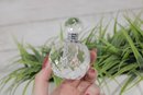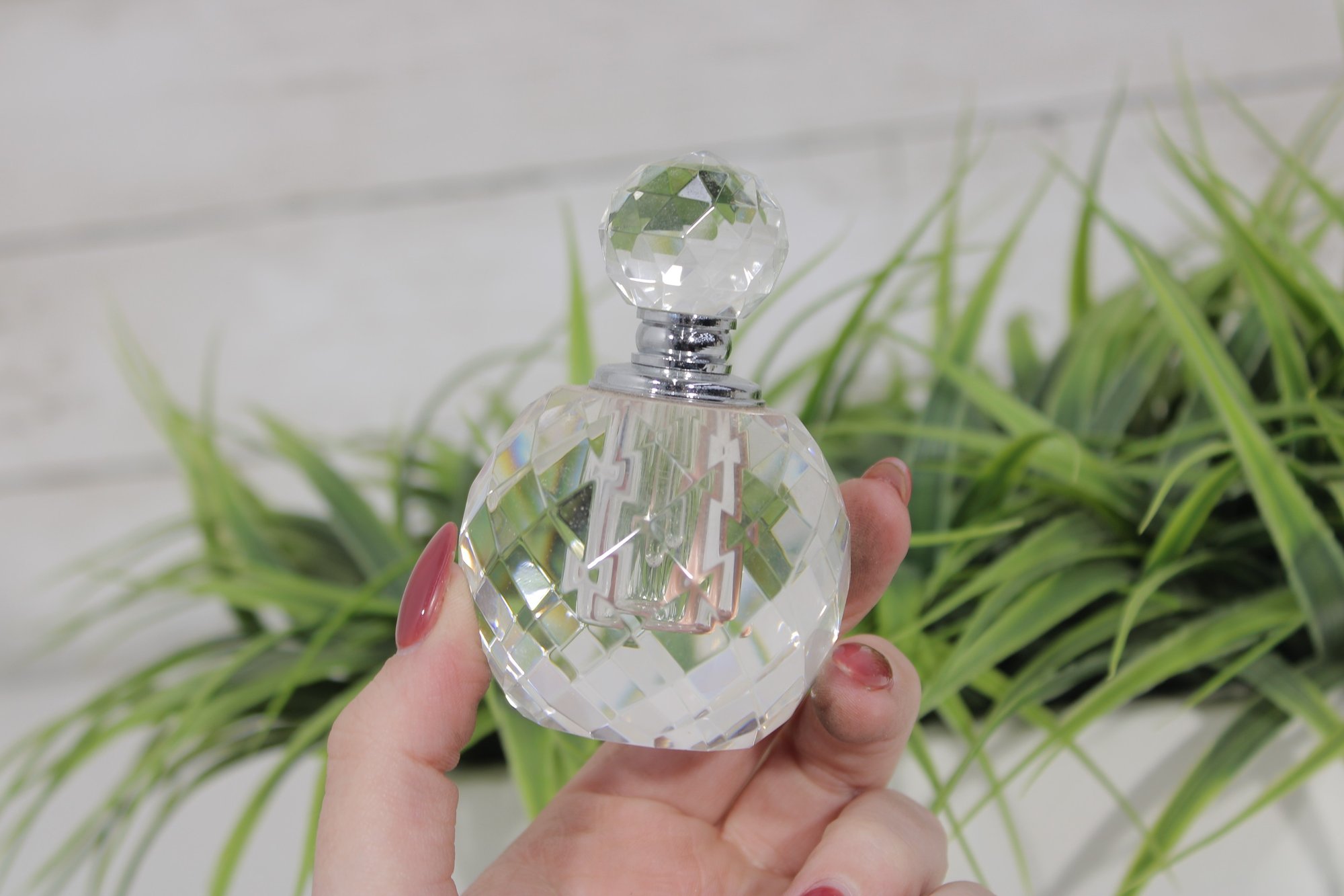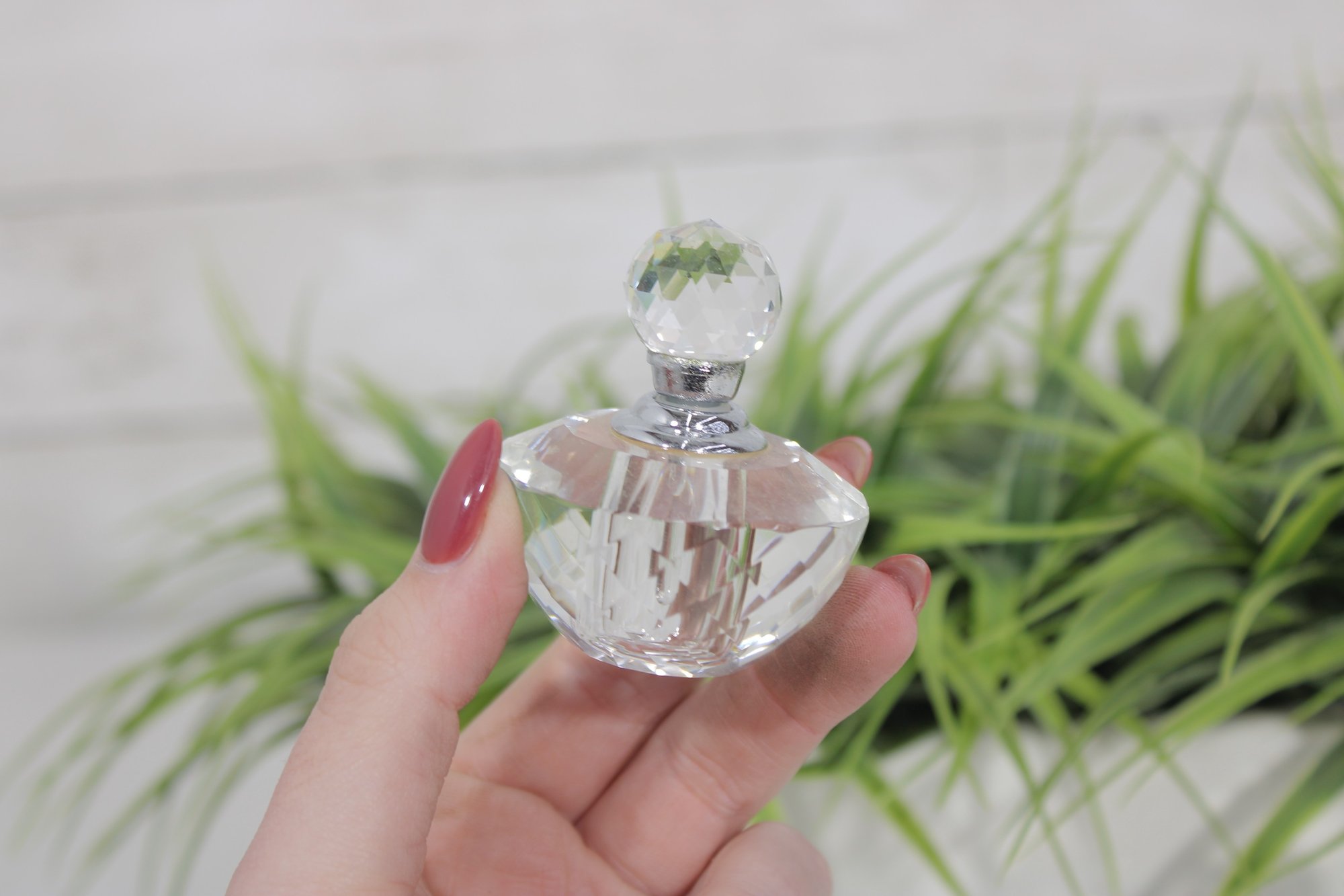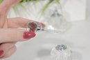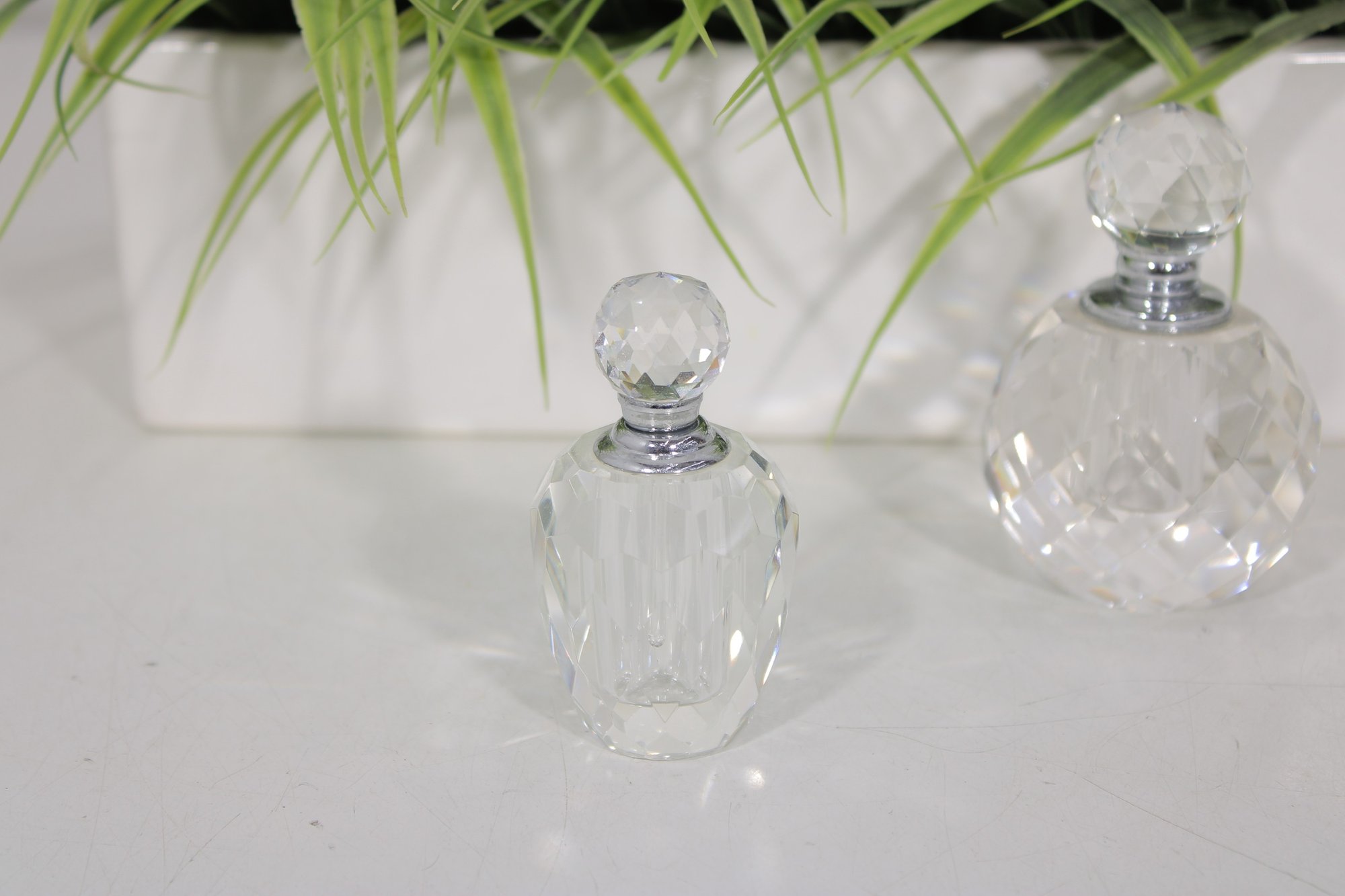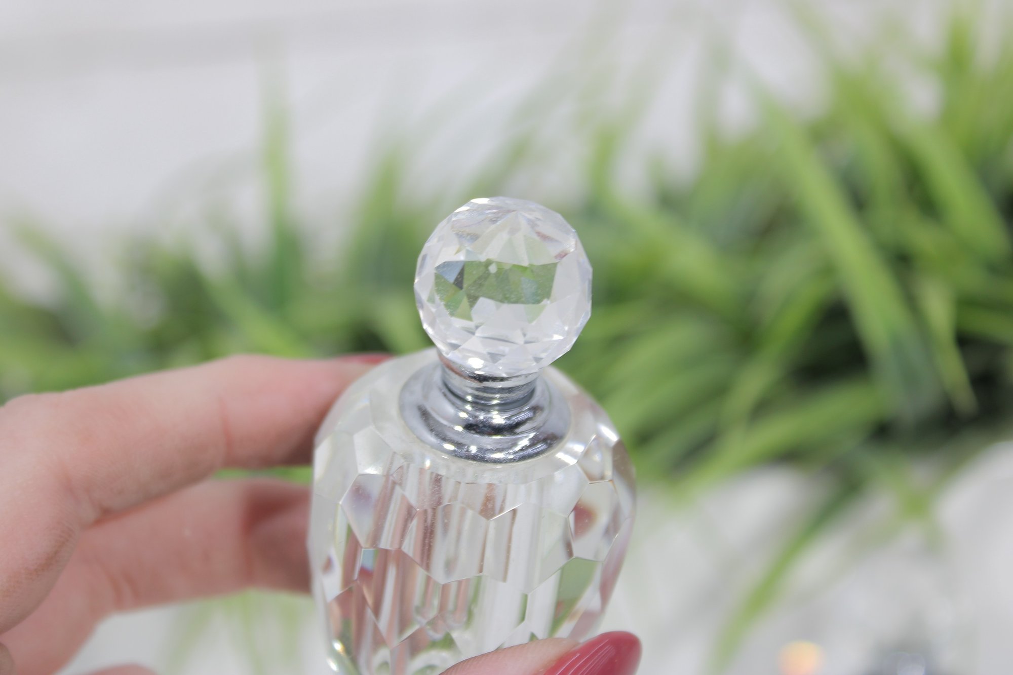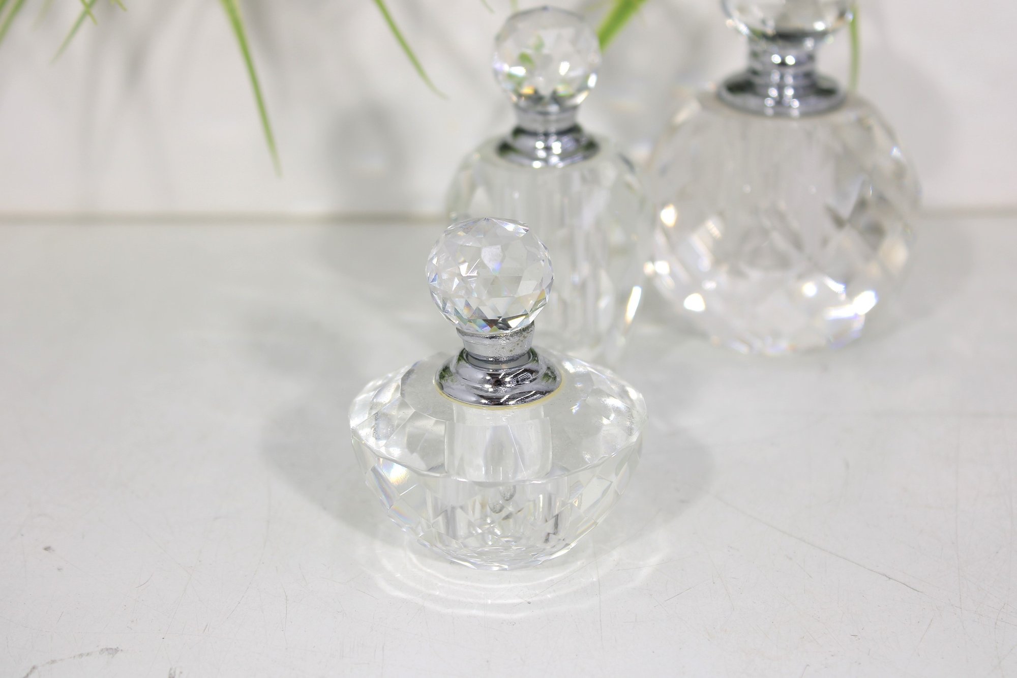 These elegant glass bottles feature faceted crystal-style designs with matching stoppers, reflecting classic vintage Art Deco aesthetics. Each bottle varies slightly in shape and size, making this a charming display set for a vanity or dressing table.