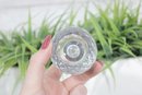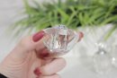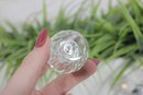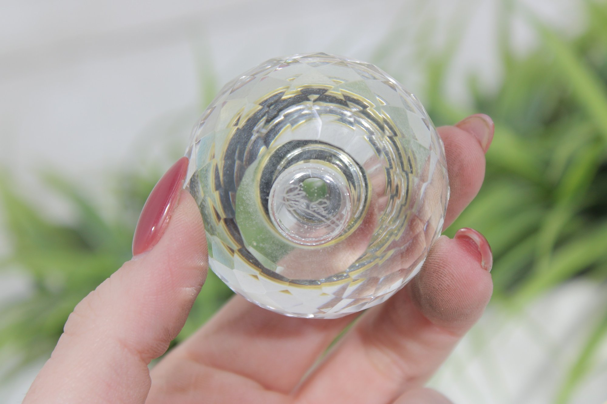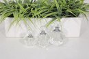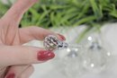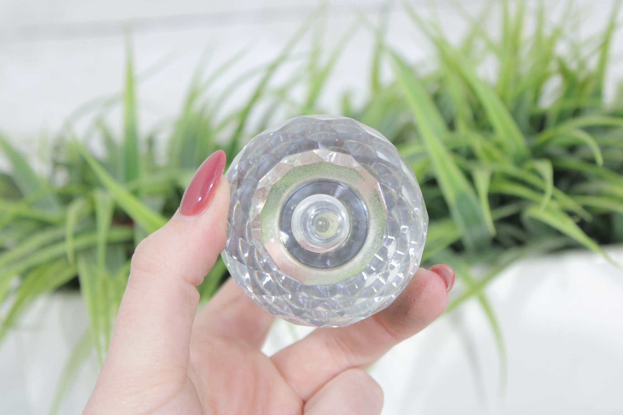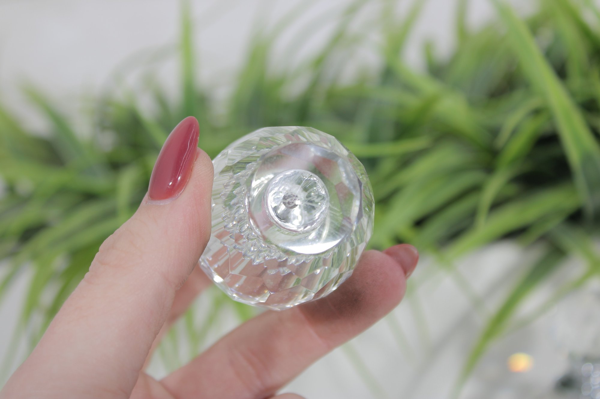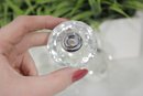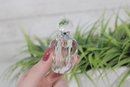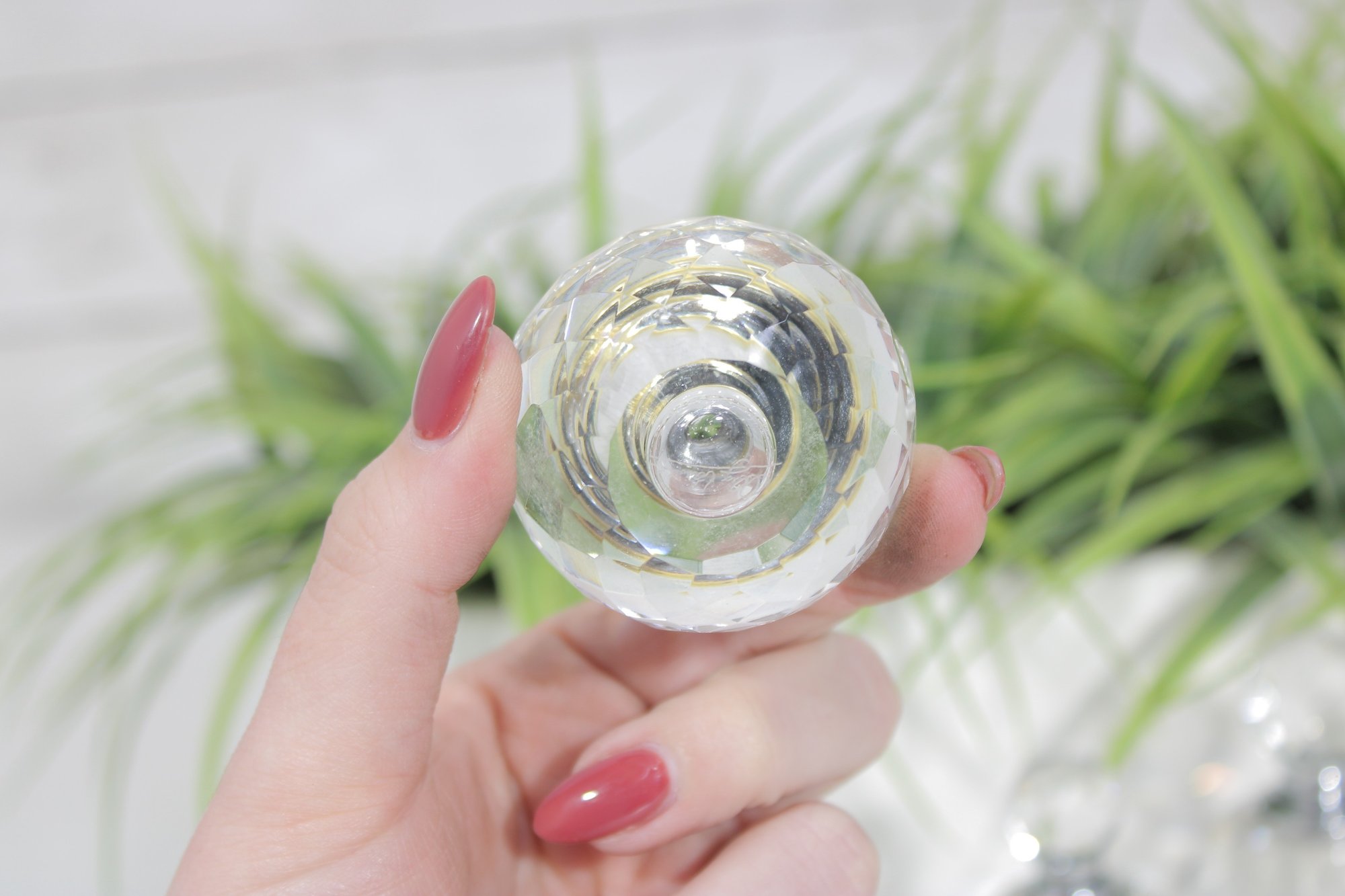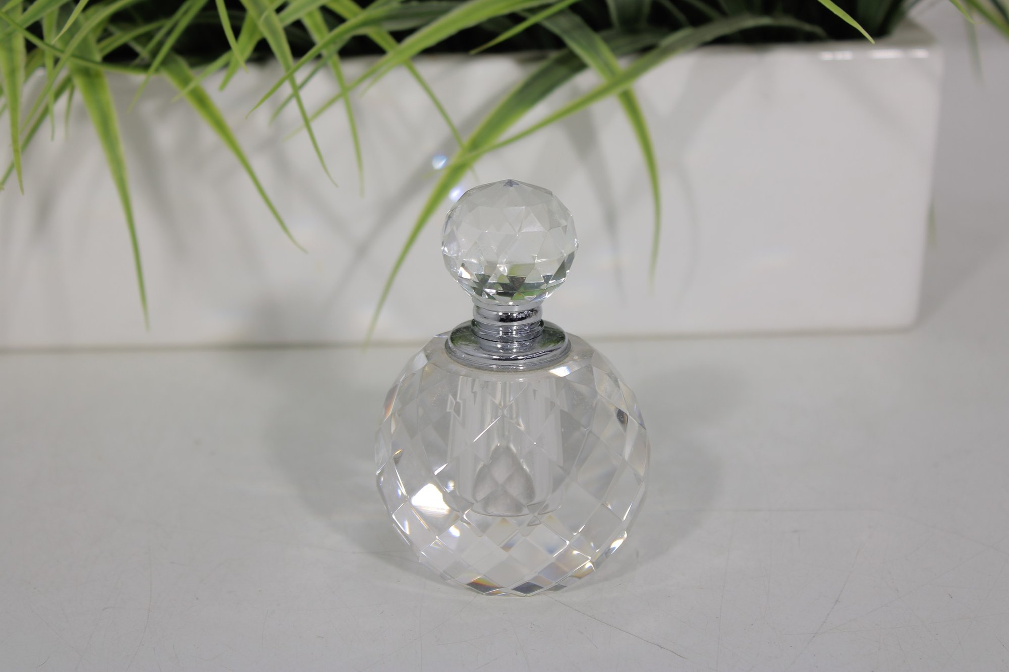 These elegant glass bottles feature faceted crystal-style designs with matching stoppers, reflecting classic vintage Art Deco aesthetics. Each bottle varies slightly in shape and size, making this a charming display set for a vanity or dressing table.