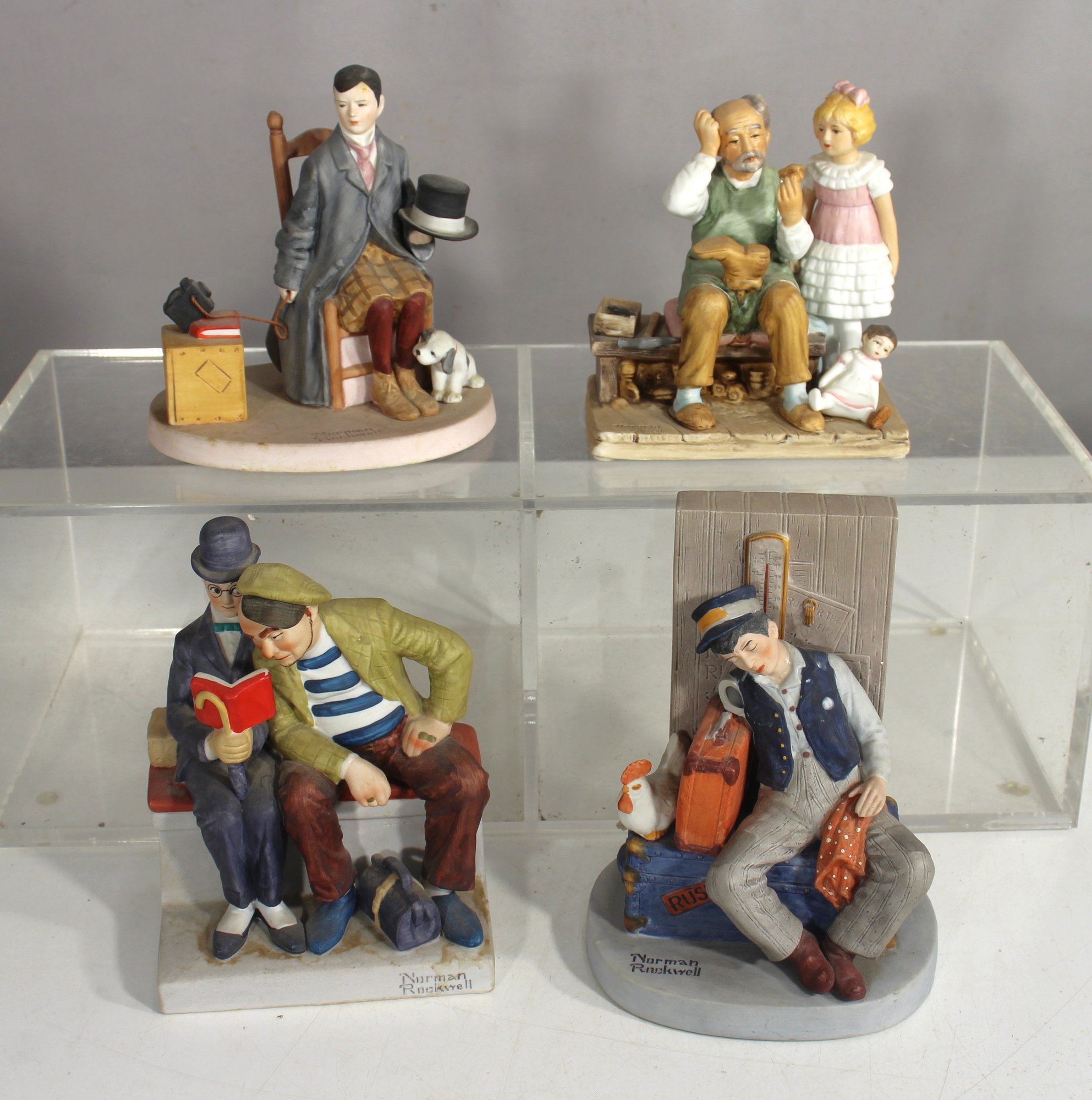 A delightful collection of four detailed figurines, featuring charming scenes reminiscent of Norman Rockwell’s iconic illustrations and heartwarming classic moments. Each figurine captures nostalgic everyday life through expressive characters and fine craftsmanship.