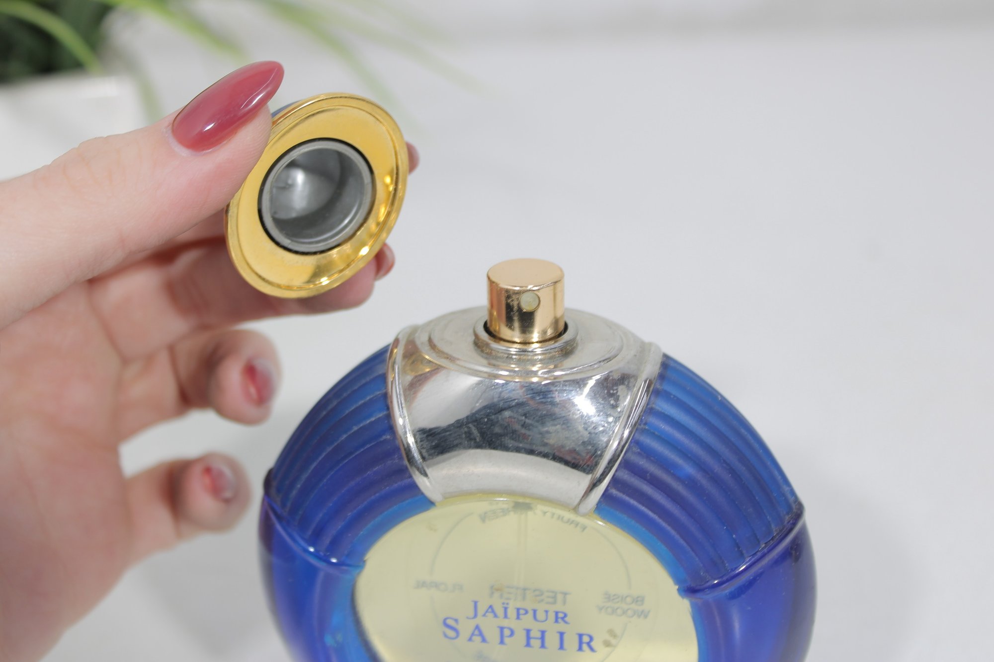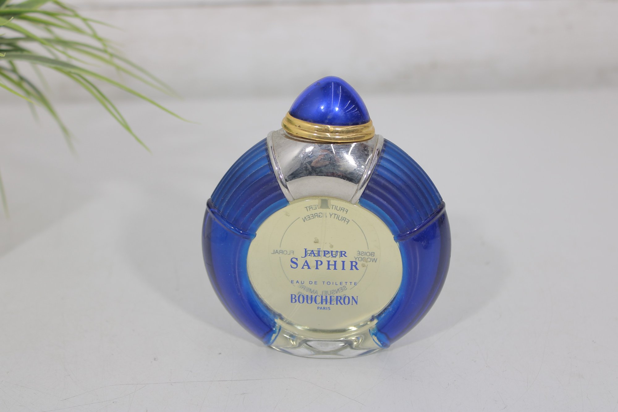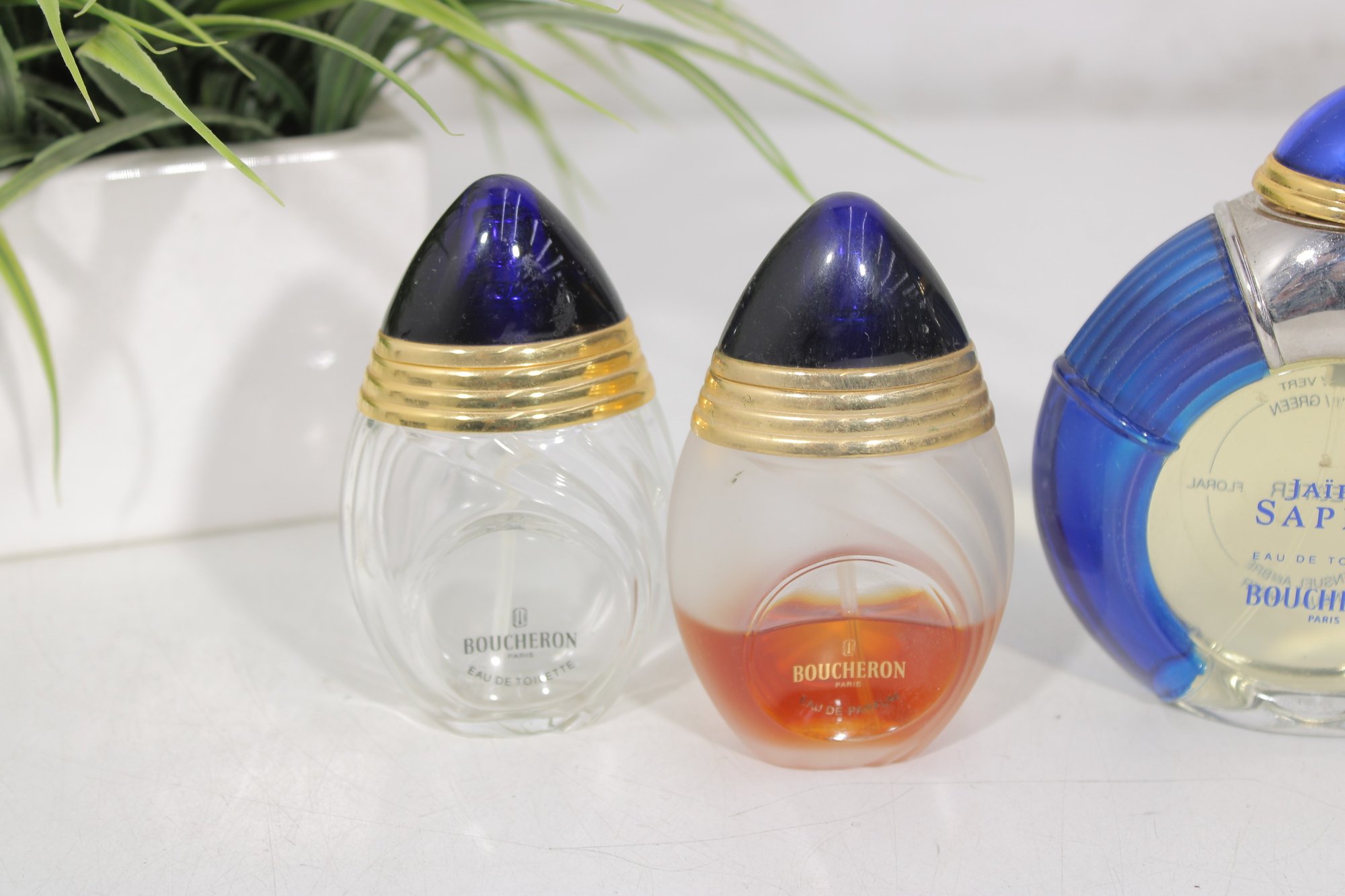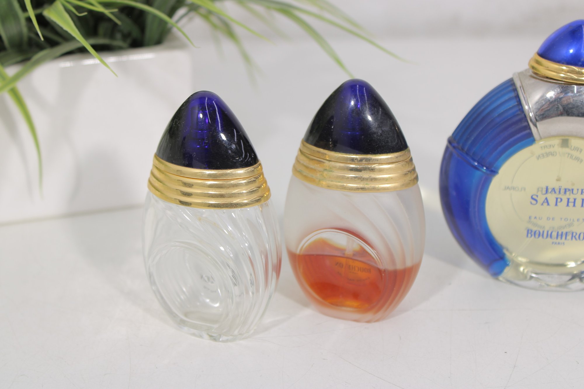 This grouping features the distinctive Jaipur Saphir design with deep blue caps and gold-tone accents, along with the signature round blue fluted bottle.
