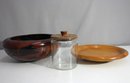 This charming lot includes a mix of decorative and functional pieces, perfect for enhancing your home décor. The set features a carved wooden bowl with intricate black detailing, a glass jar with a snug wooden lid, and a round wooden plate with a natural finish and elevated base. These versatile items can serve as centerpieces, storage, or everyday décor while adding rustic and artisanal charm to your space. All pieces are in great condition, showcasing their quality craftsmanship. A great addition for collectors or lovers of natural-style décor!