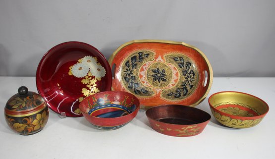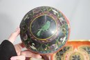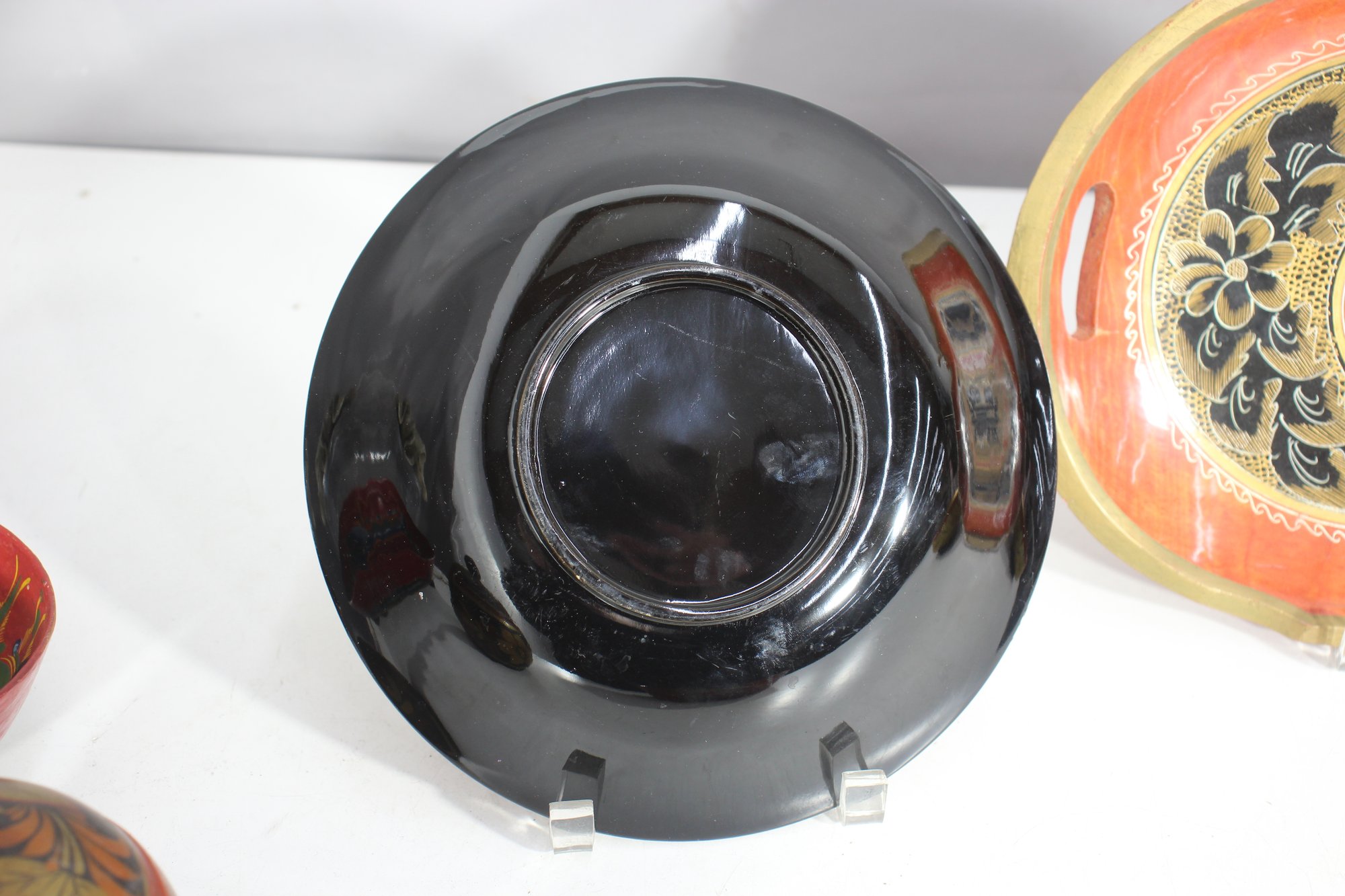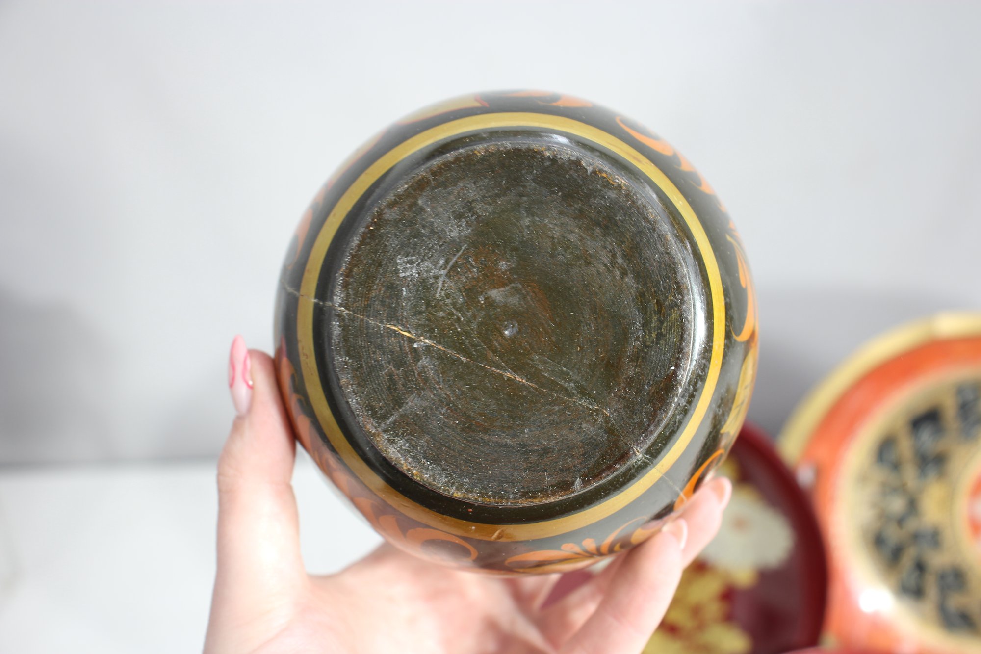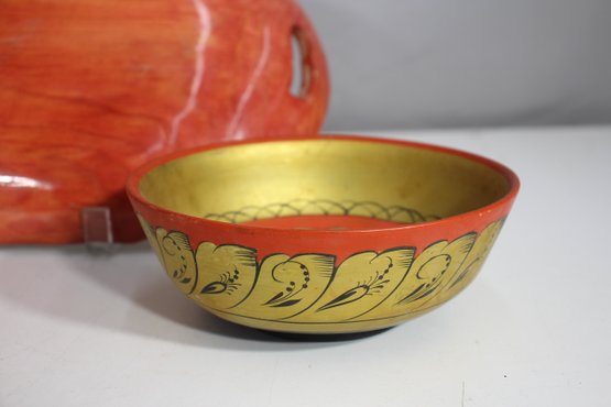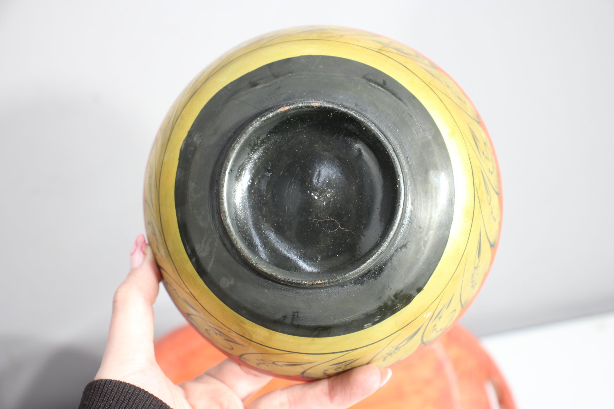 Round lacquered bowl with floral gold accents – Features a striking black and gold folk-art pattern.
