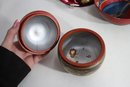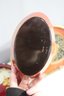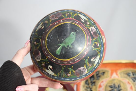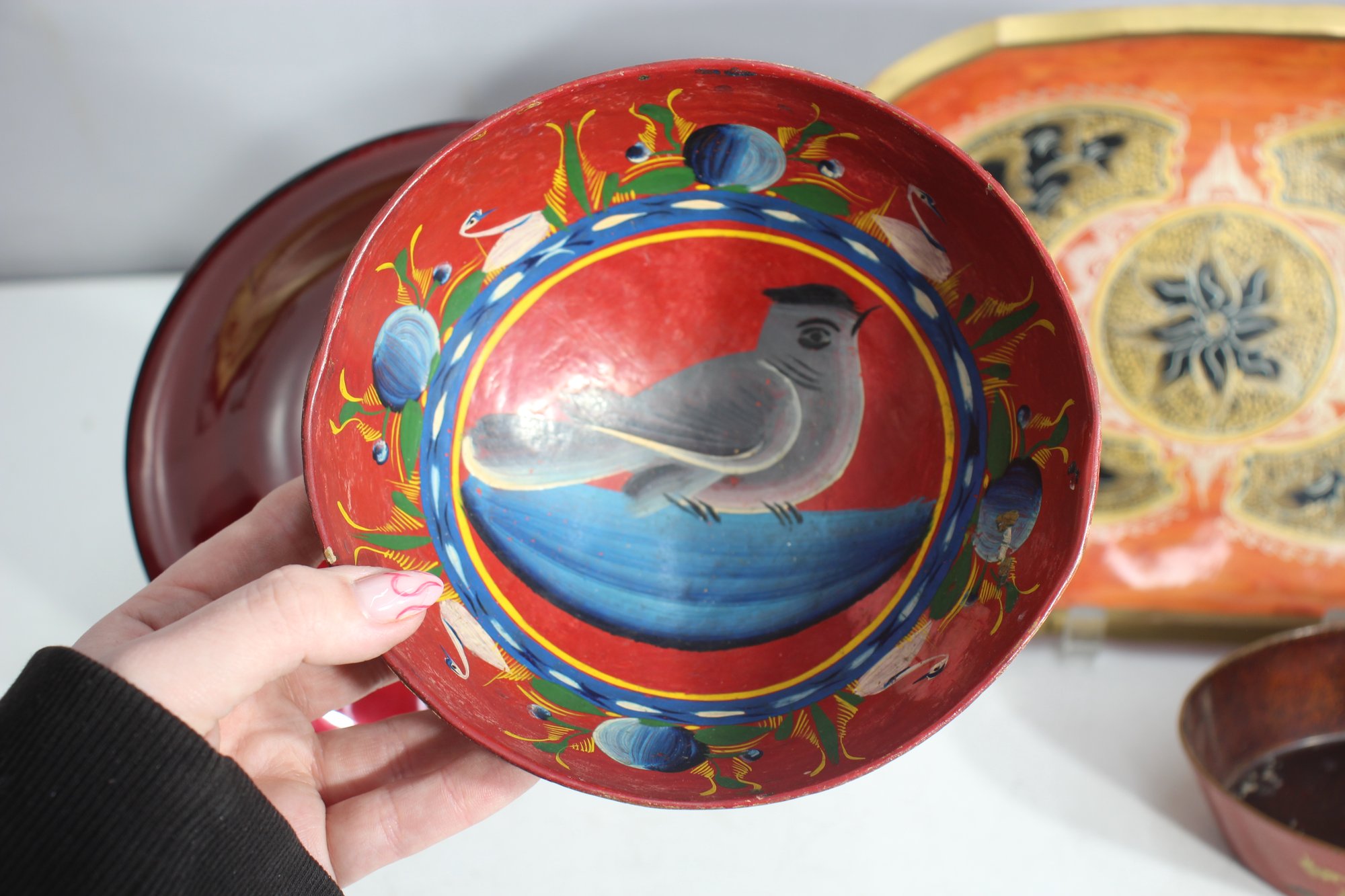 Hand-painted red bowl with bird motif – Beautifully detailed artwork depicting a perched bird, surrounded by decorative floral elements.