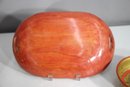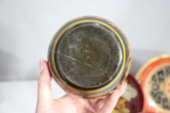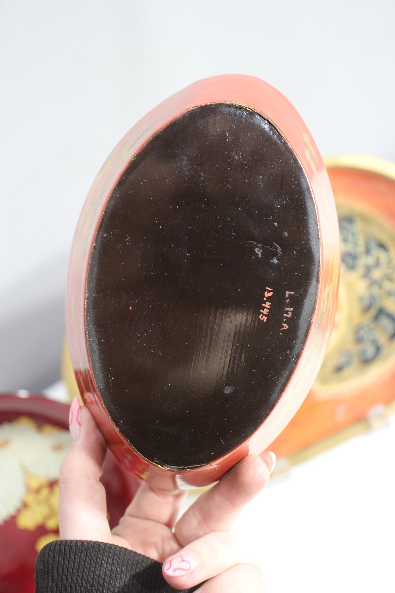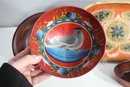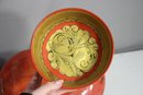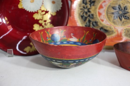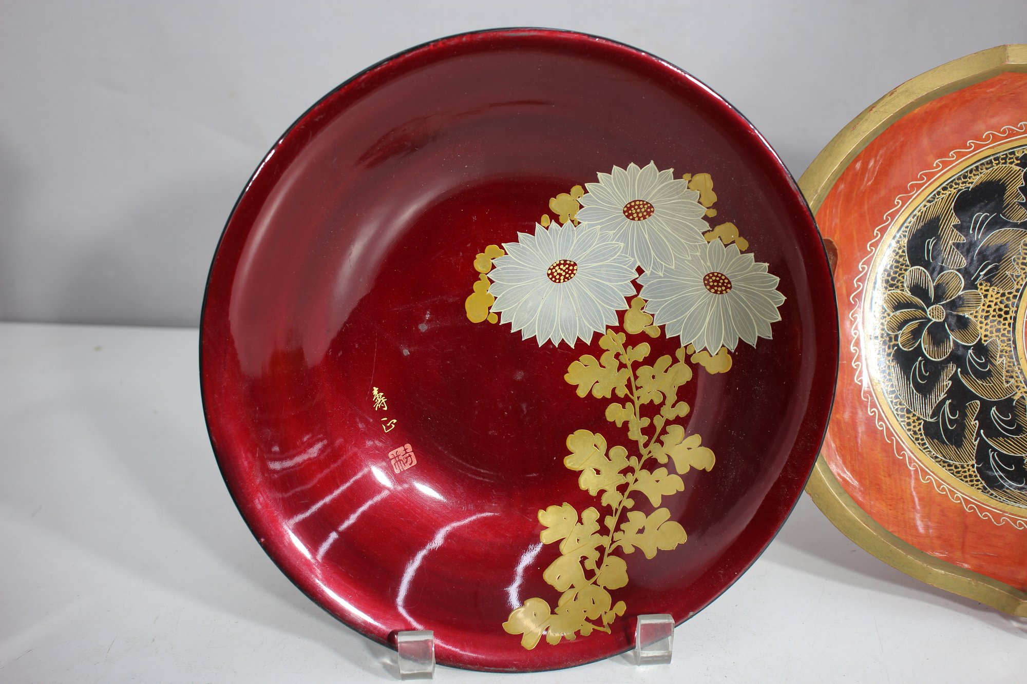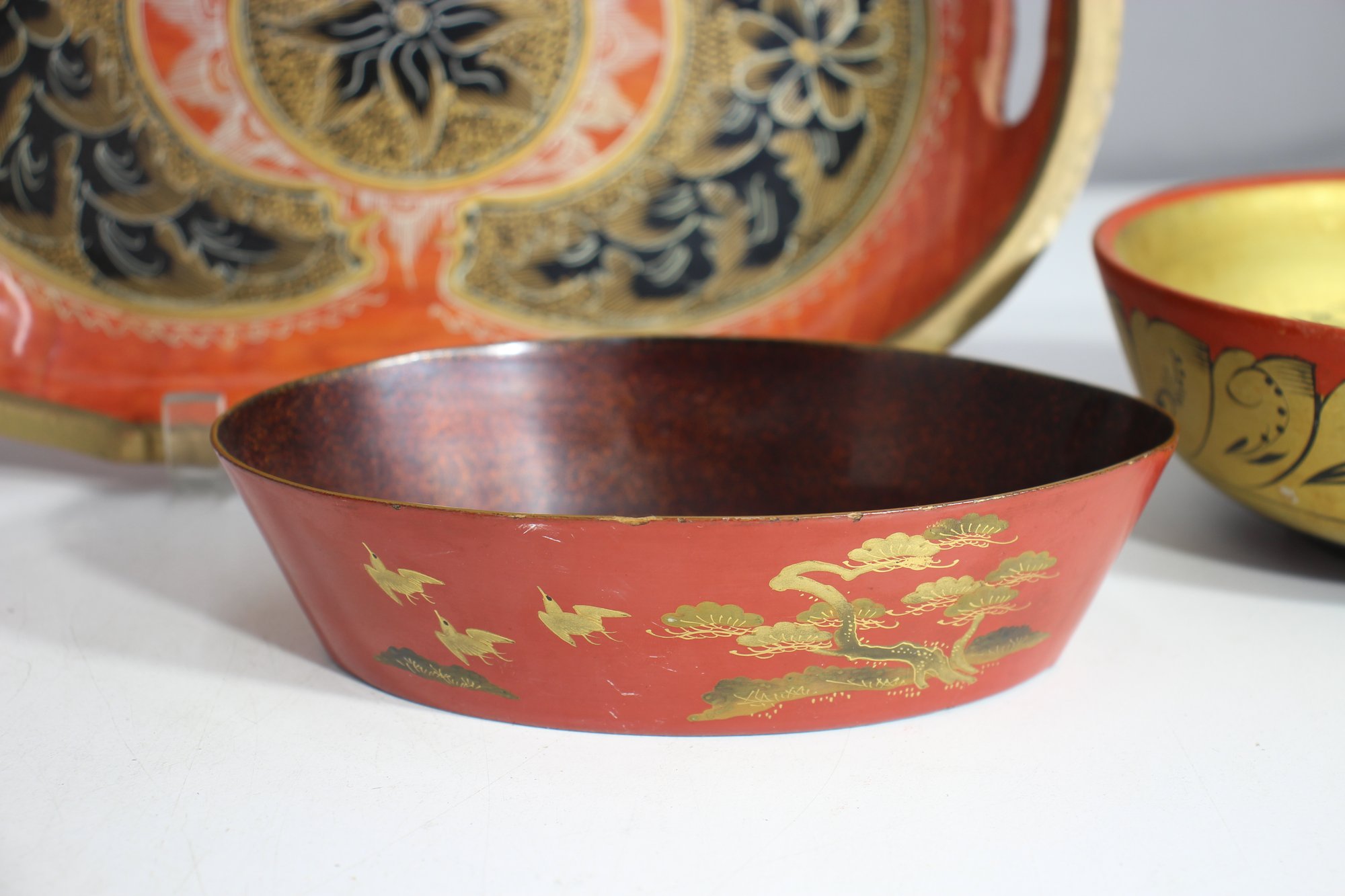 Red oval dish with gold-painted scenery – Features a delicate Asian-inspired nature scene with cranes and trees.