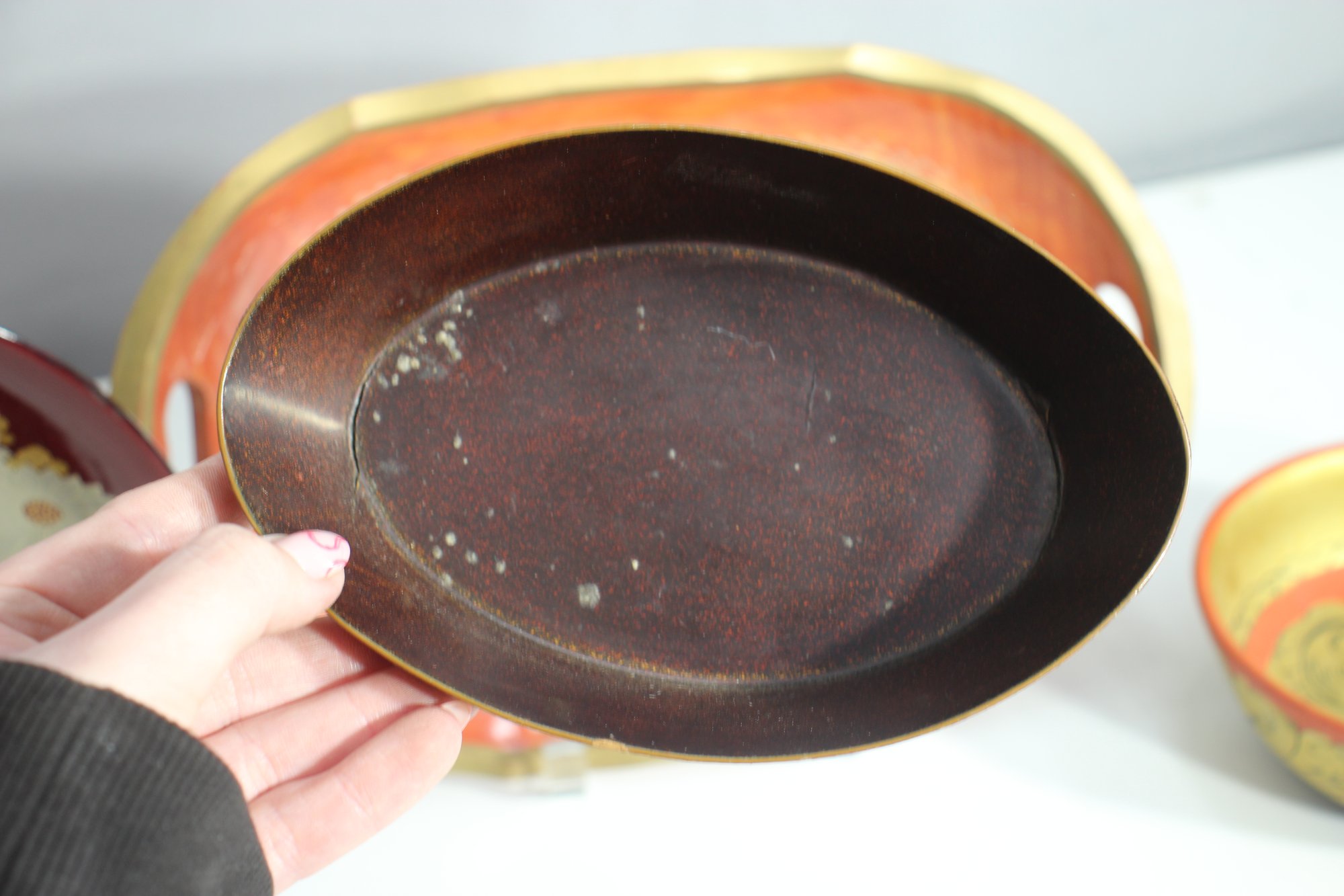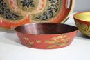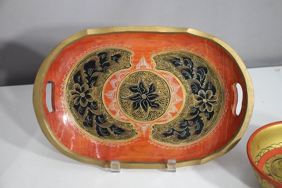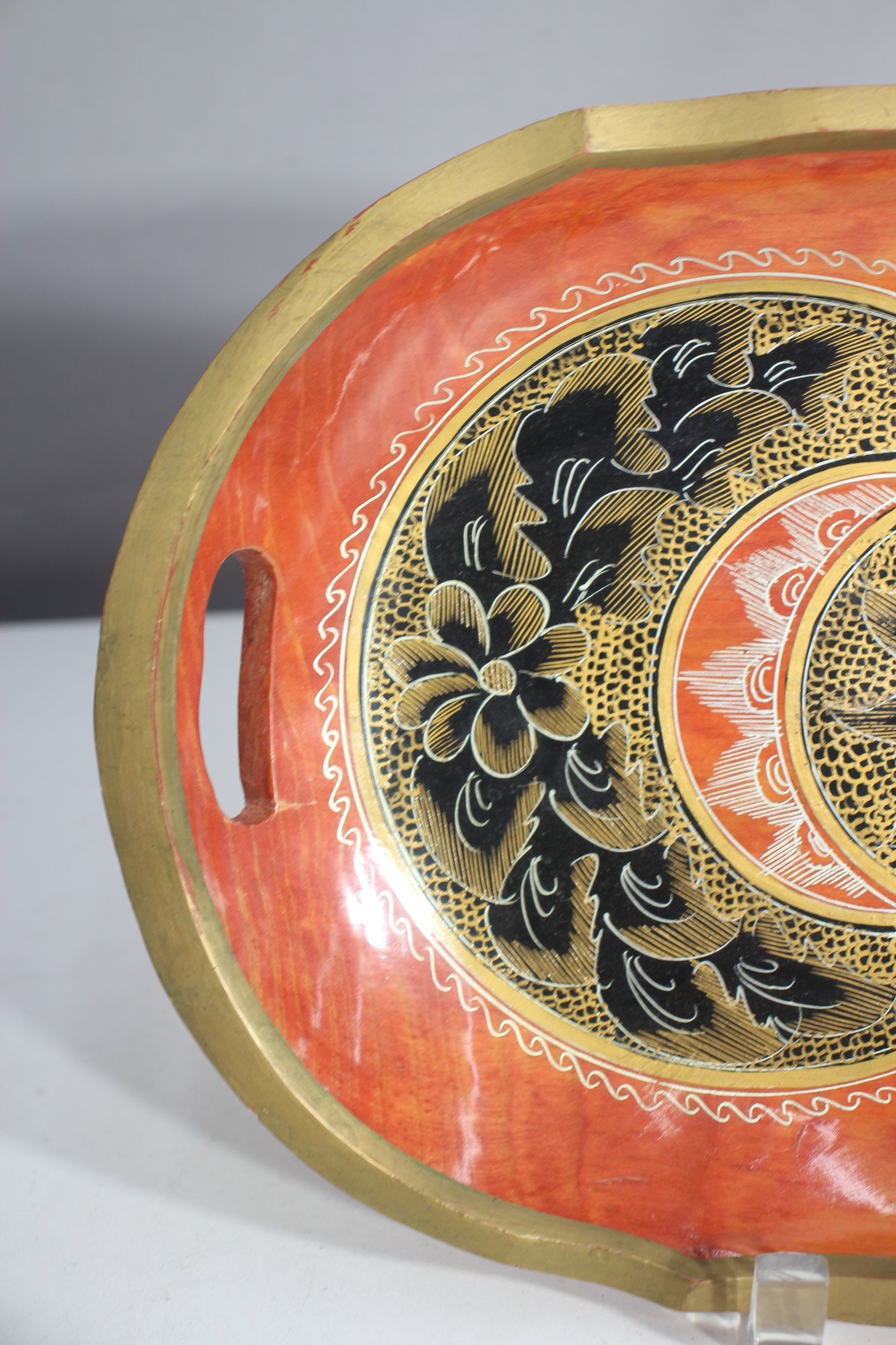 Large oval serving tray – Rich red and gold tones with an intricate floral and geometric design.