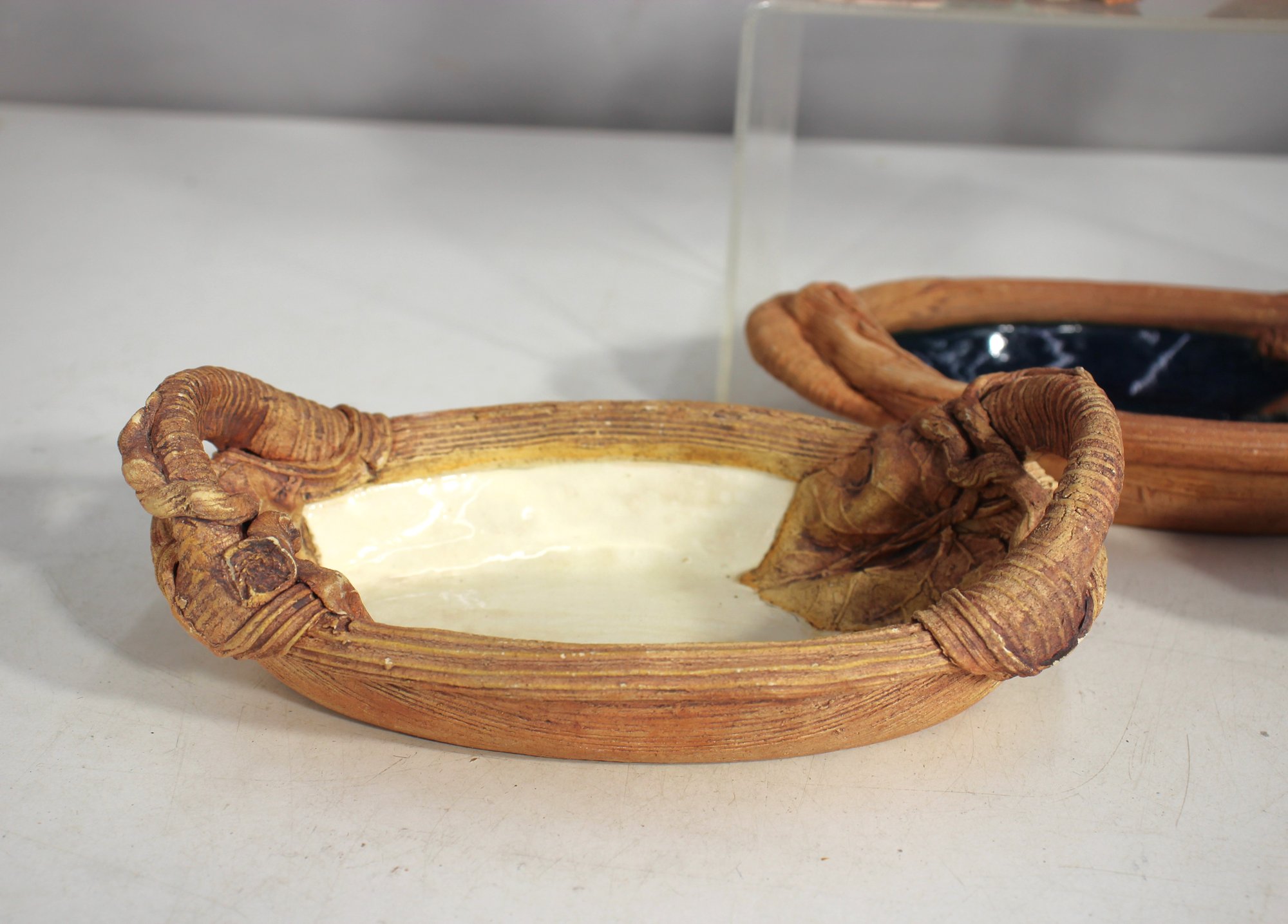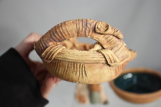 Two hand-sculpted pottery bowls – Organic, basket-like rims with rich glazed interiors.