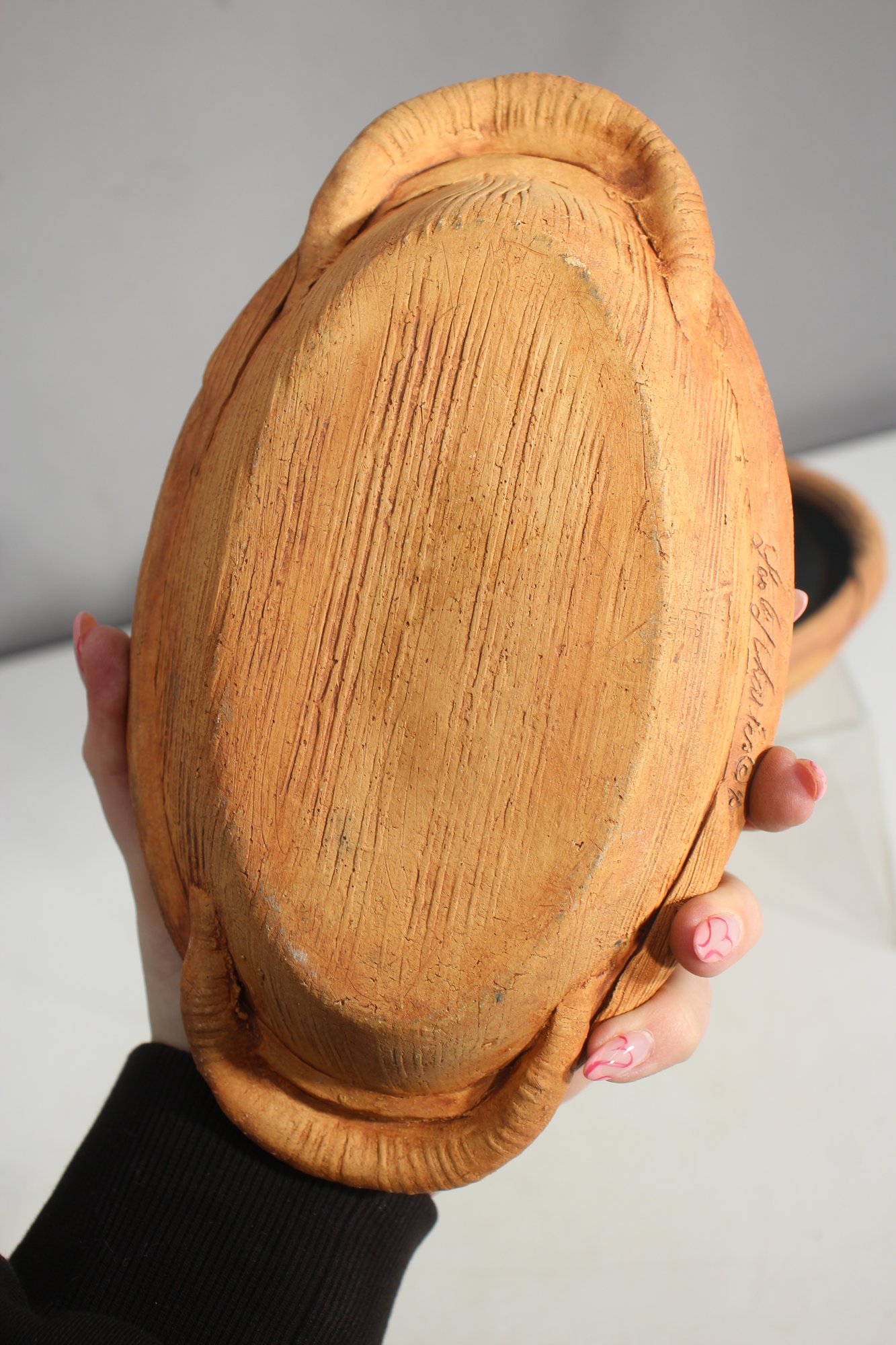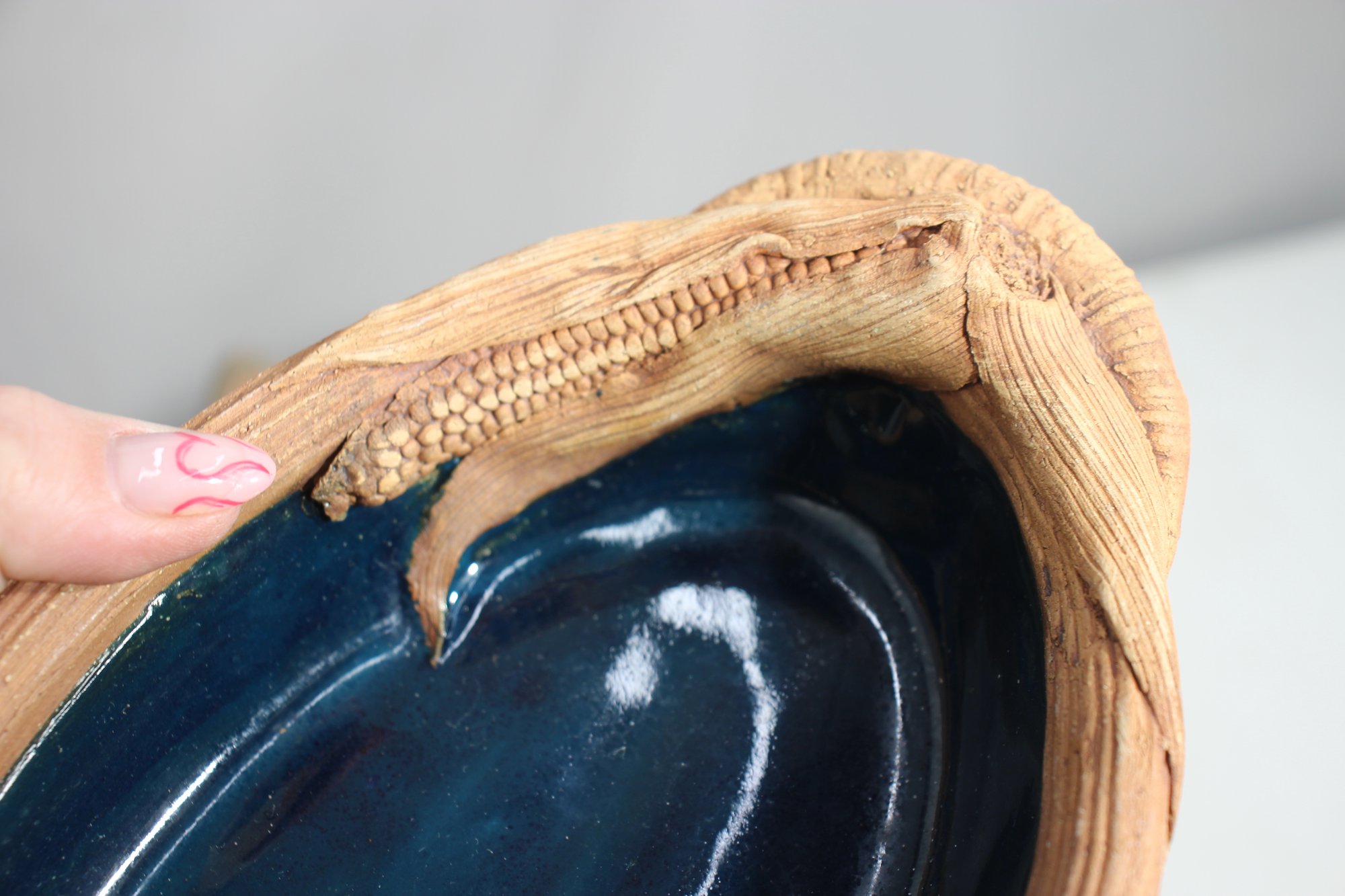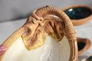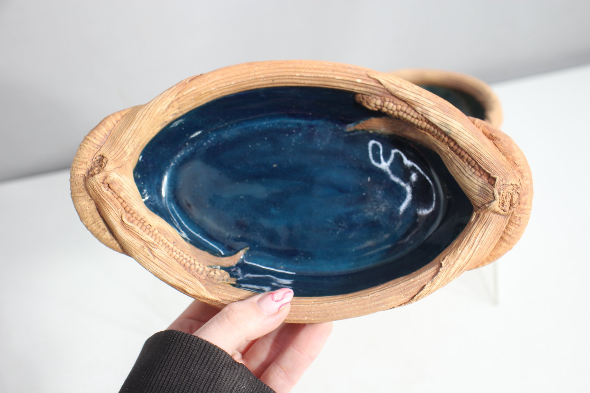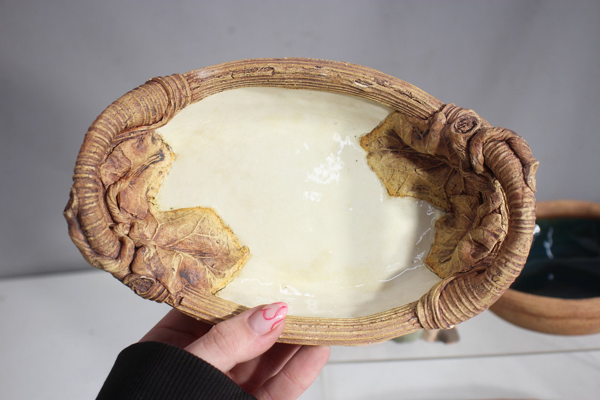Oval ceramic dish – Features a nature-inspired woven handle and leaf detailing.