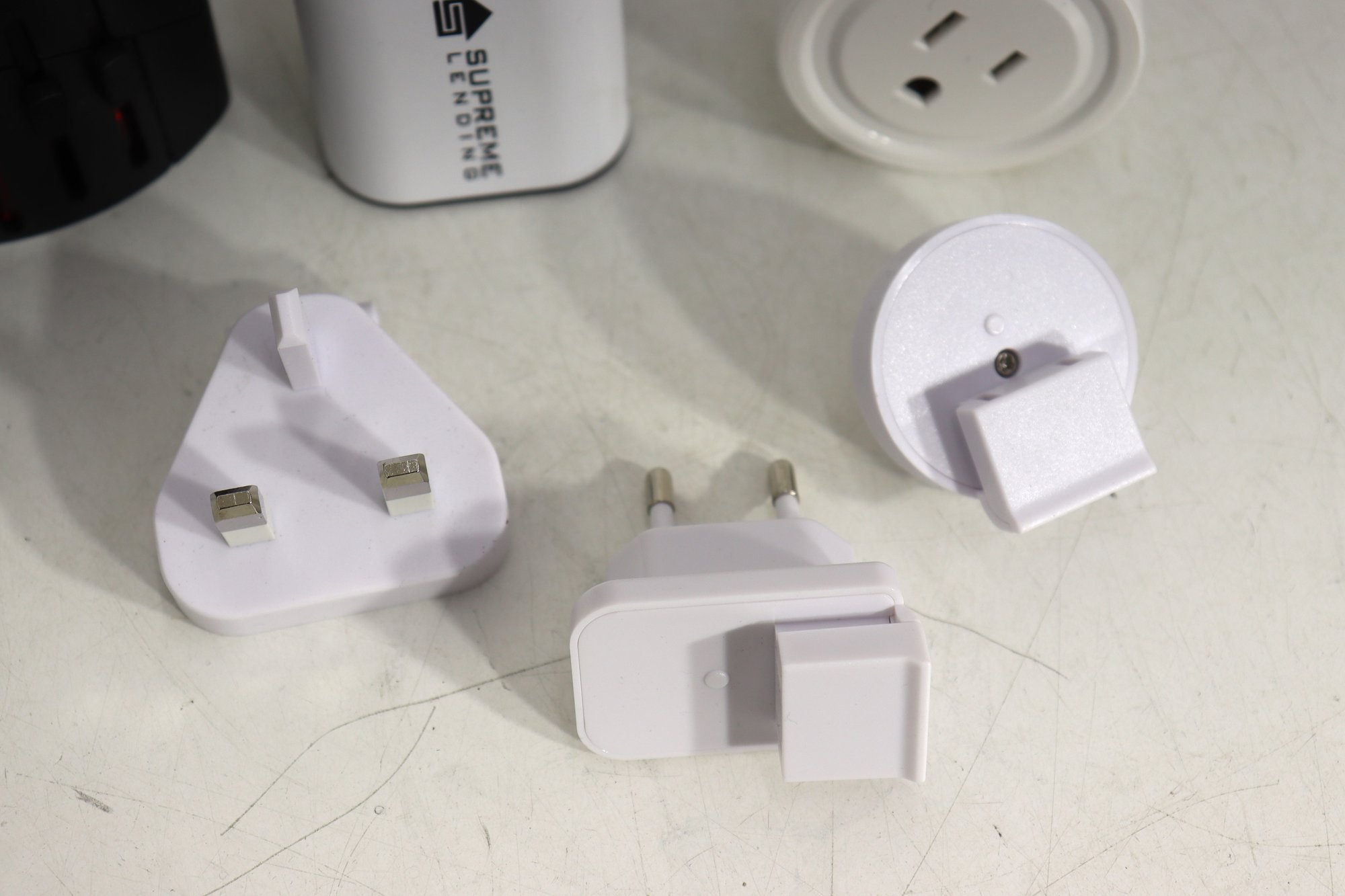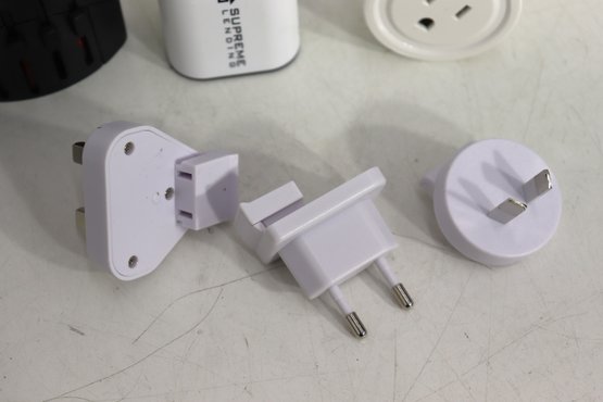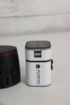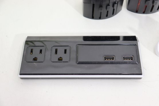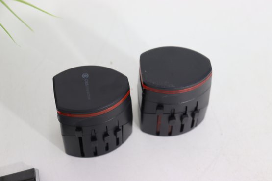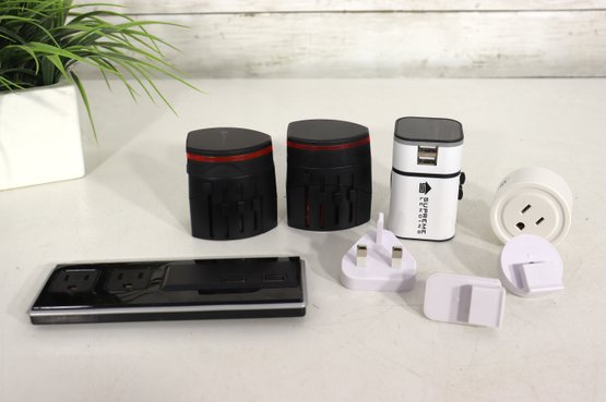 Large assorted lot of various travel / power / charging adapters & converters. Includes multiple universal travel plug adapters, USB outlet charging blocks, plug style converters, plus a dual USB + standard outlet charging station.