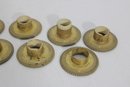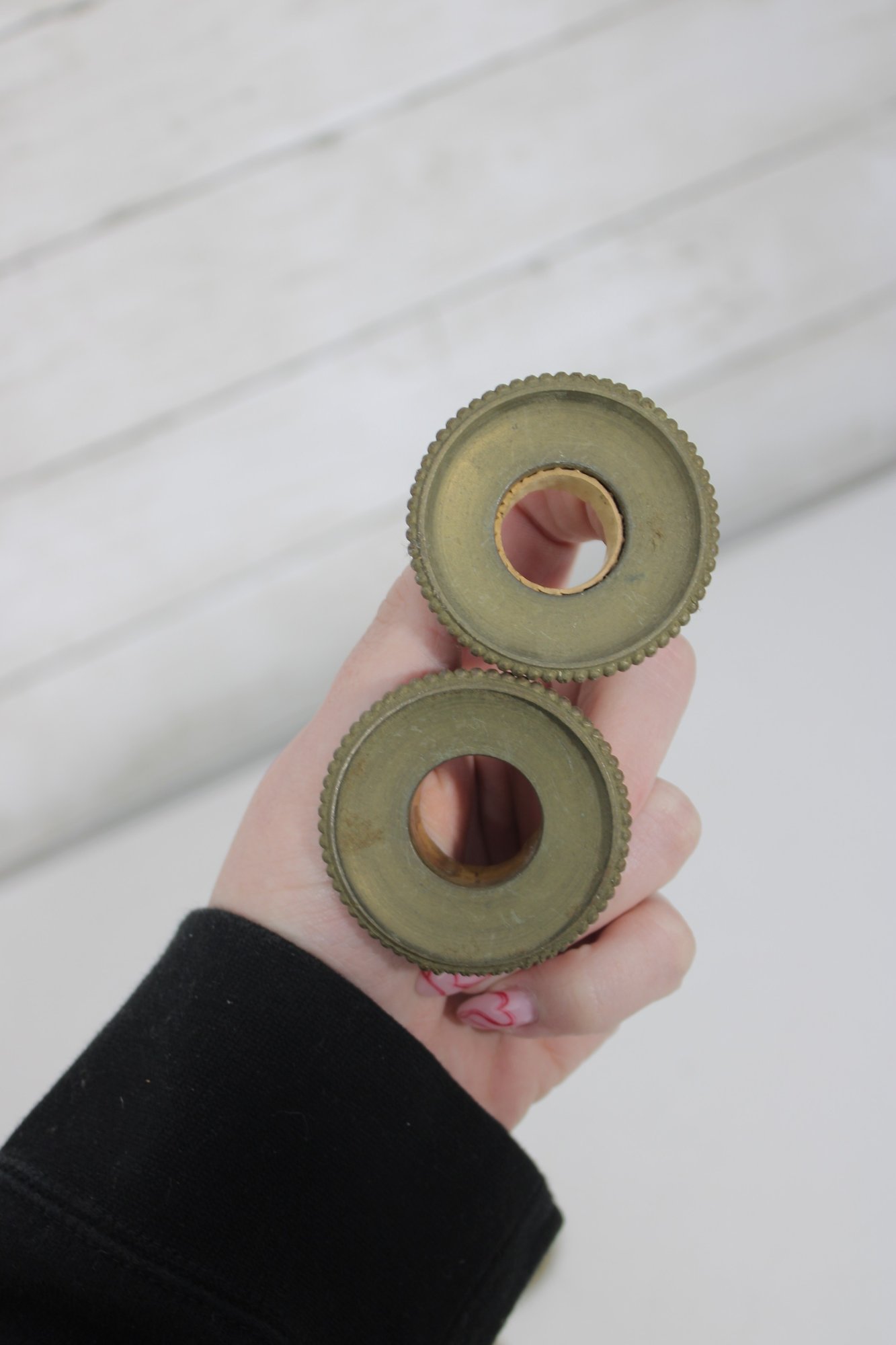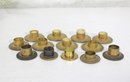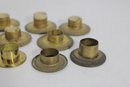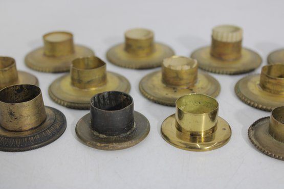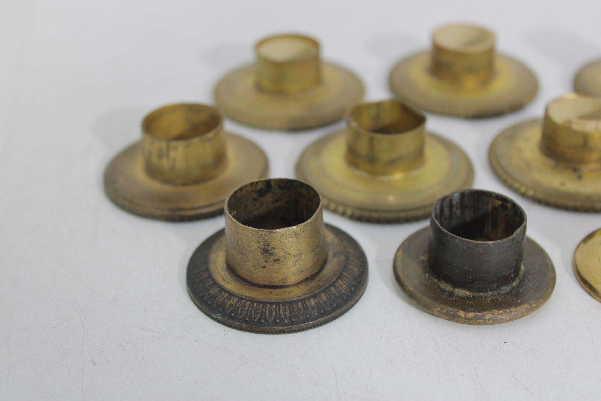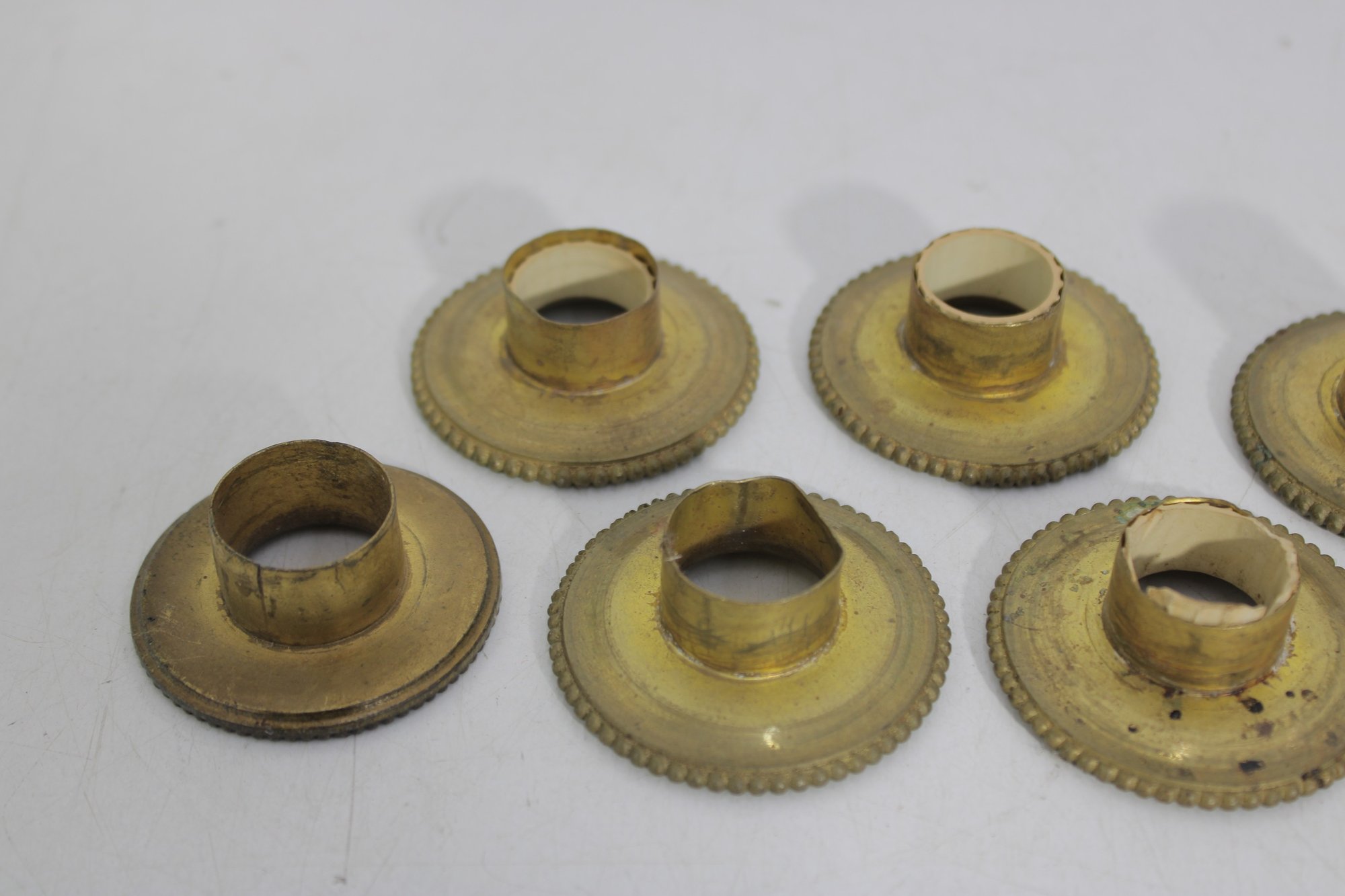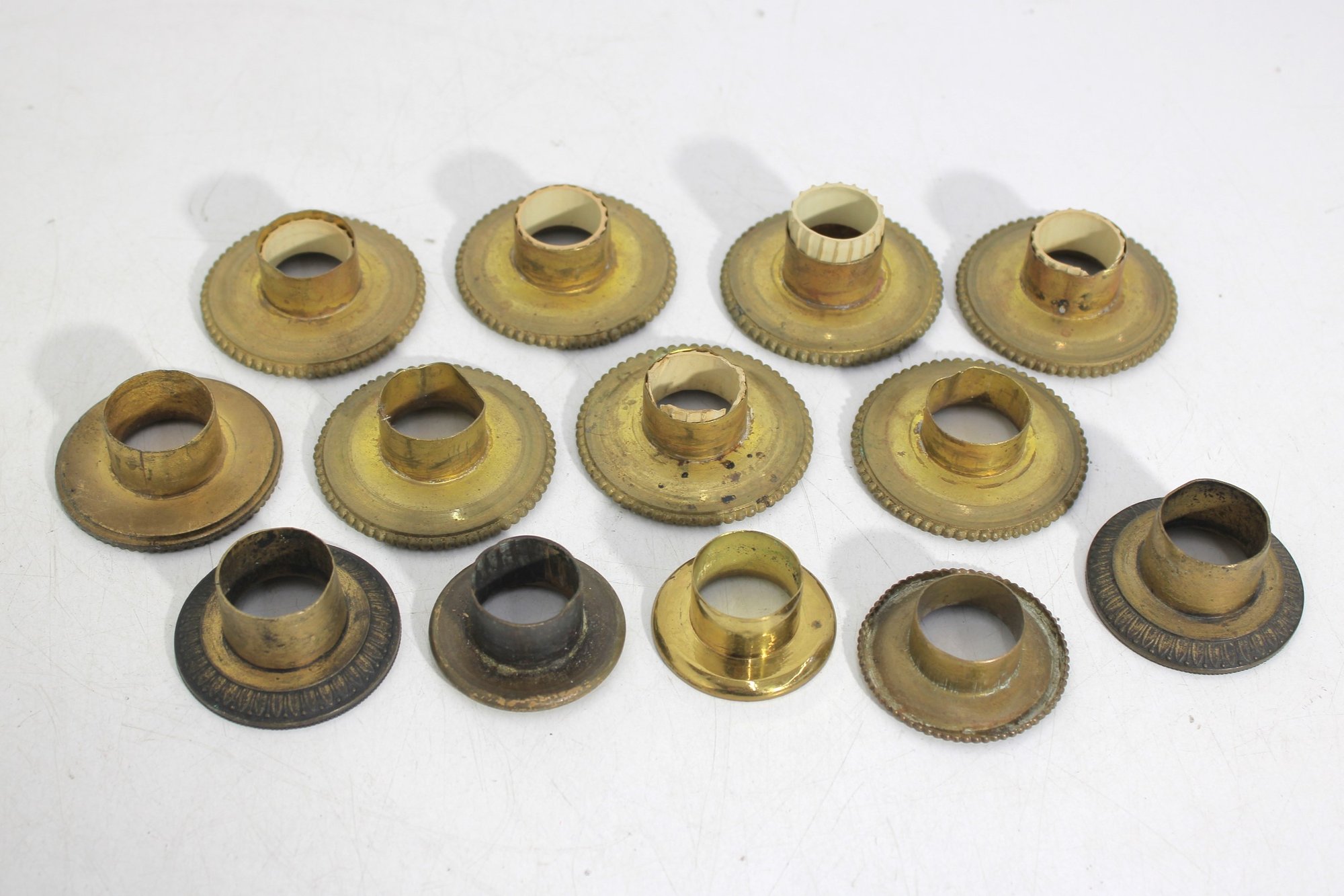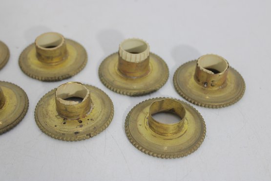 lot of vintage brass candle inserts (also known as bobeches or candle sleeves) in assorted styles and finishes. These pieces were commonly used in antique candlesticks, candelabras, lamps, and sconces to hold or stabilize candles and protect the fixture from wax drips.