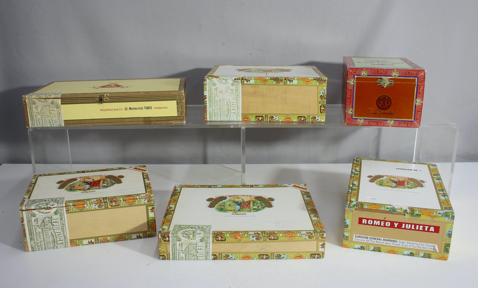 A collection of six vintage Cuban cigar boxes, including iconic brands such as Romeo y Julieta. These boxes showcase intricate designs, traditional branding, and vibrant colors, reflecting the timeless craftsmanship of Cuban cigar packaging.