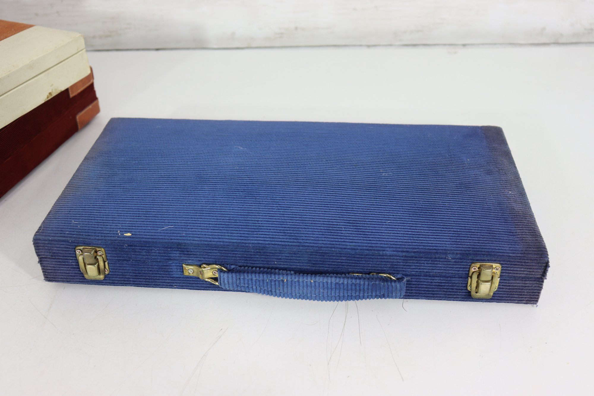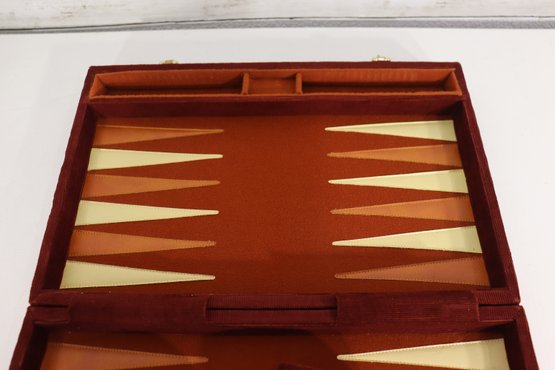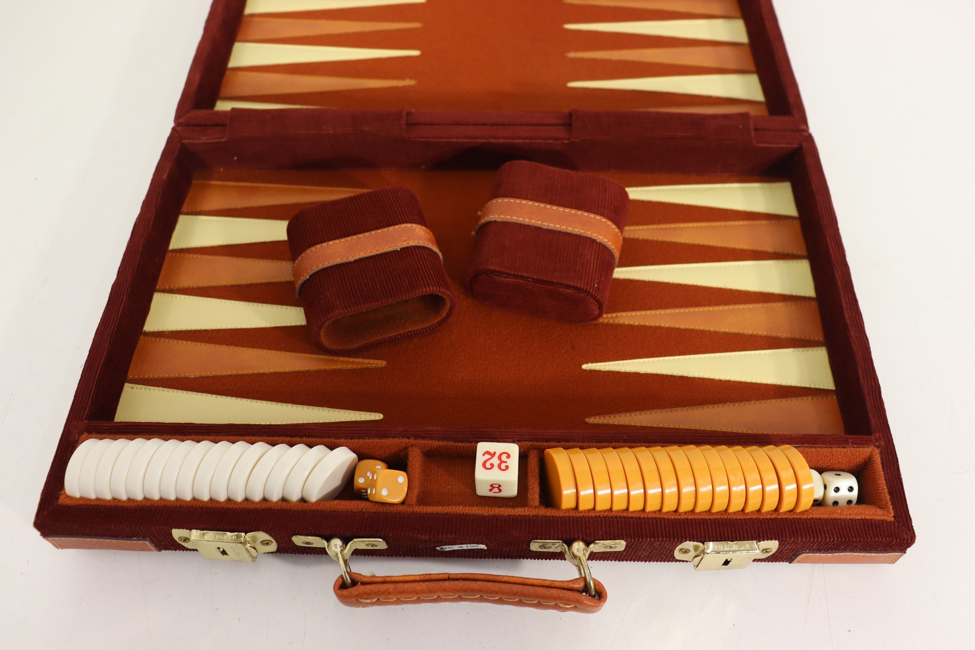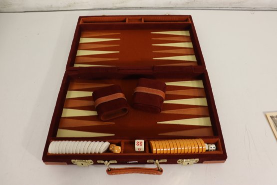 Vintage Backgammon travel style case set w/ pieces, dice, cups + original instructions insert