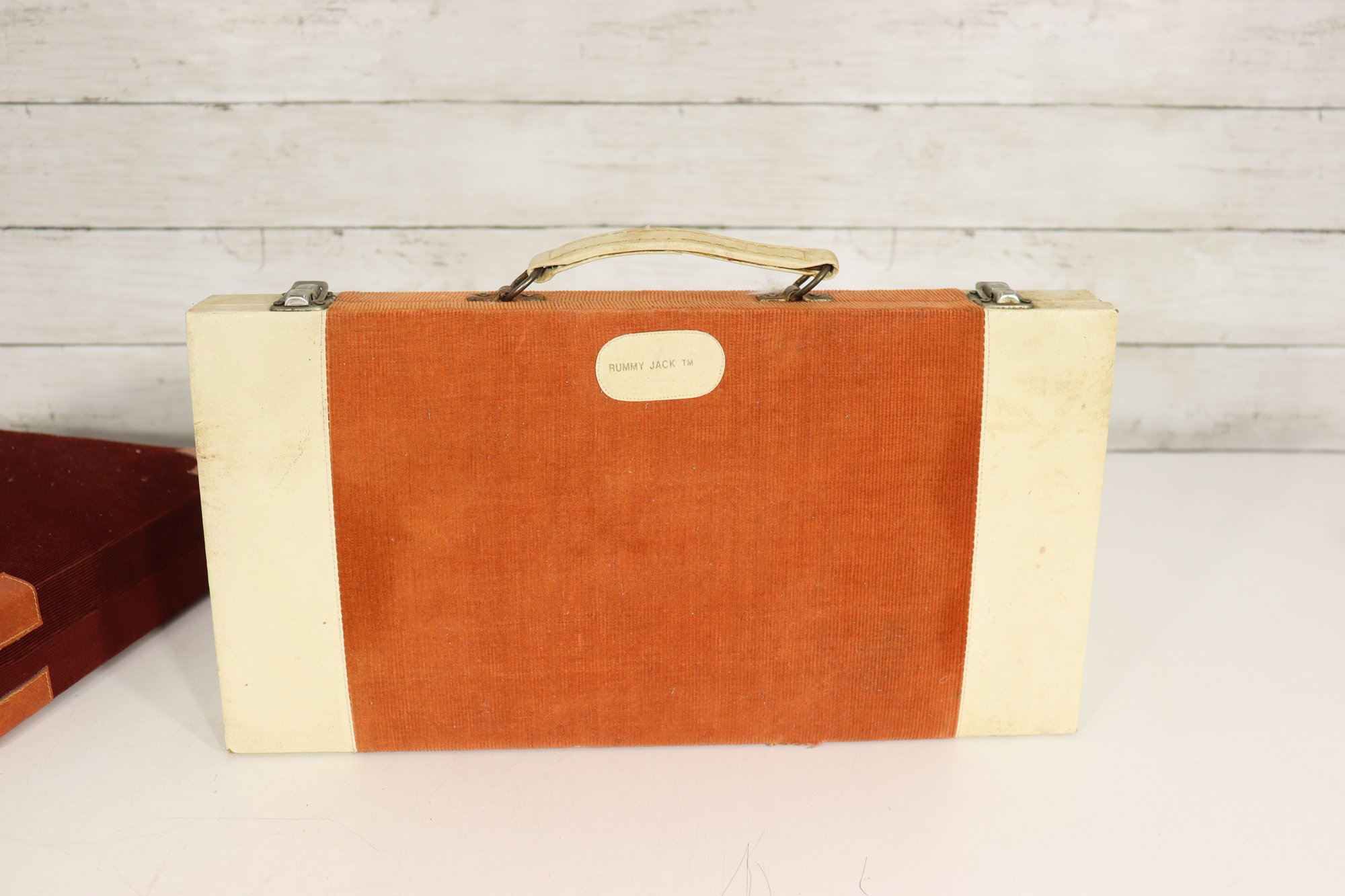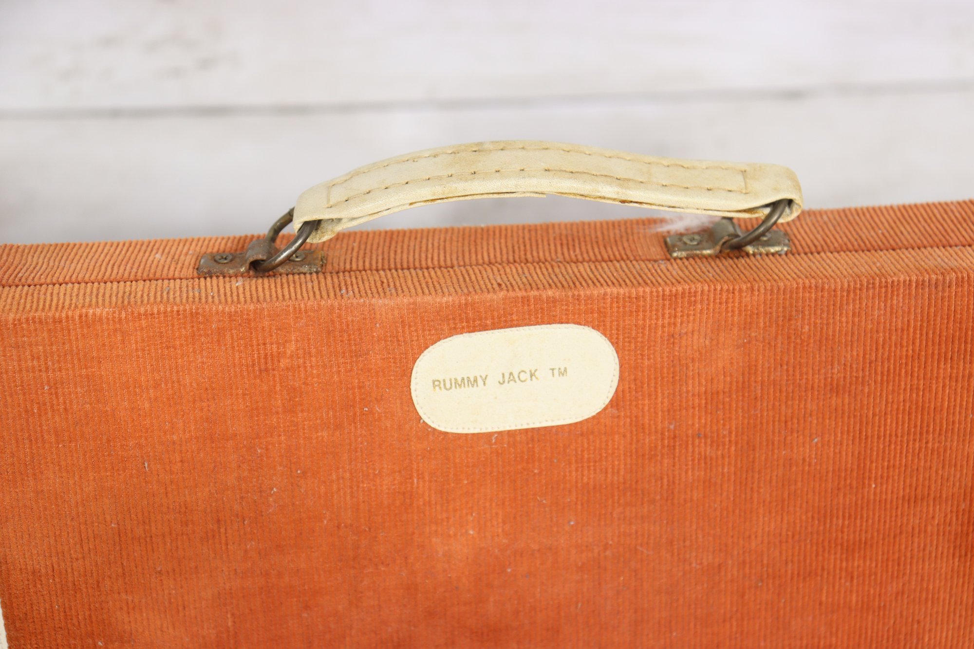 Vintage Rummy Jack TW set in orange corduroy style case – assorted tiles inside case