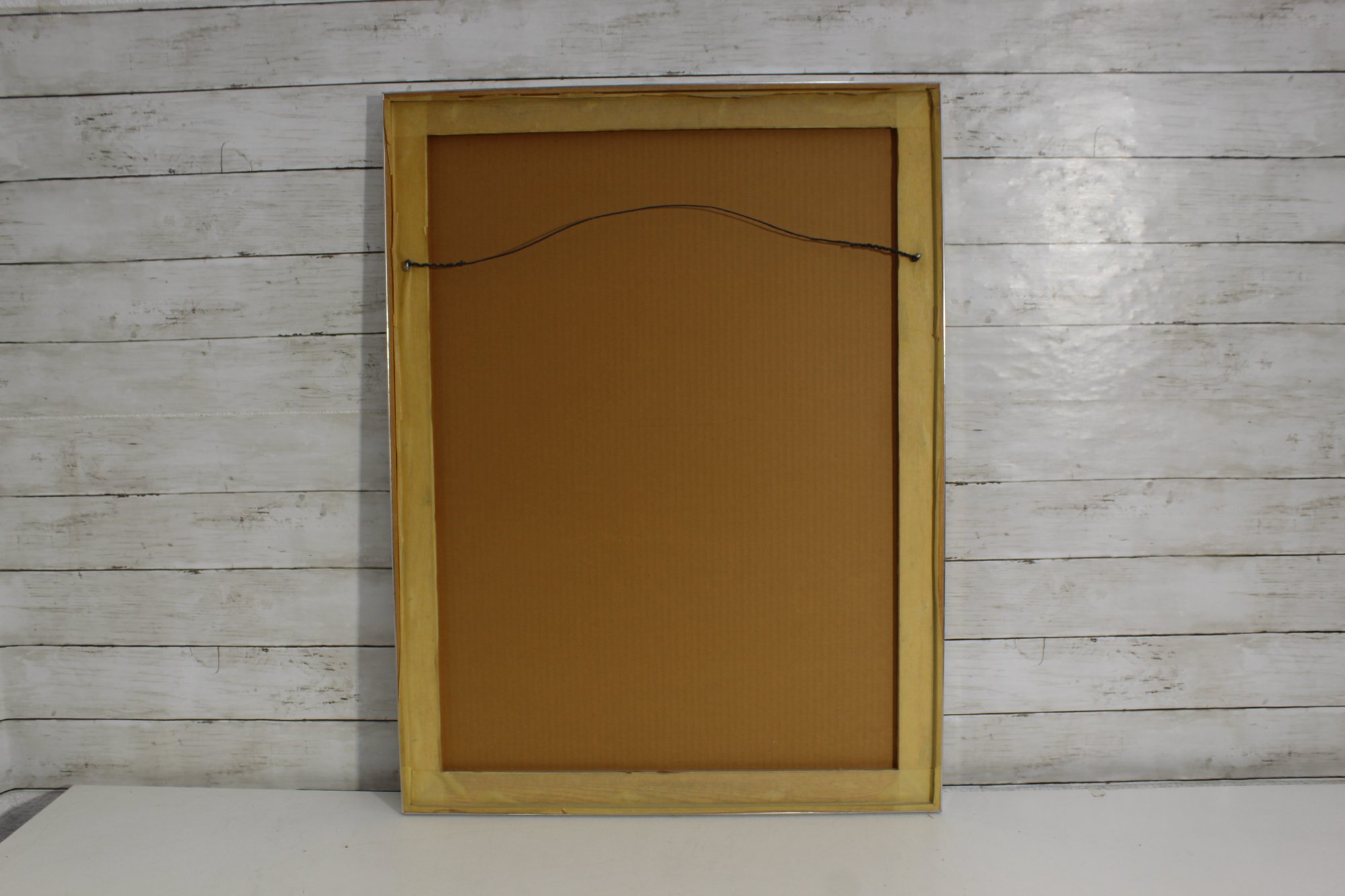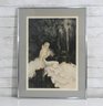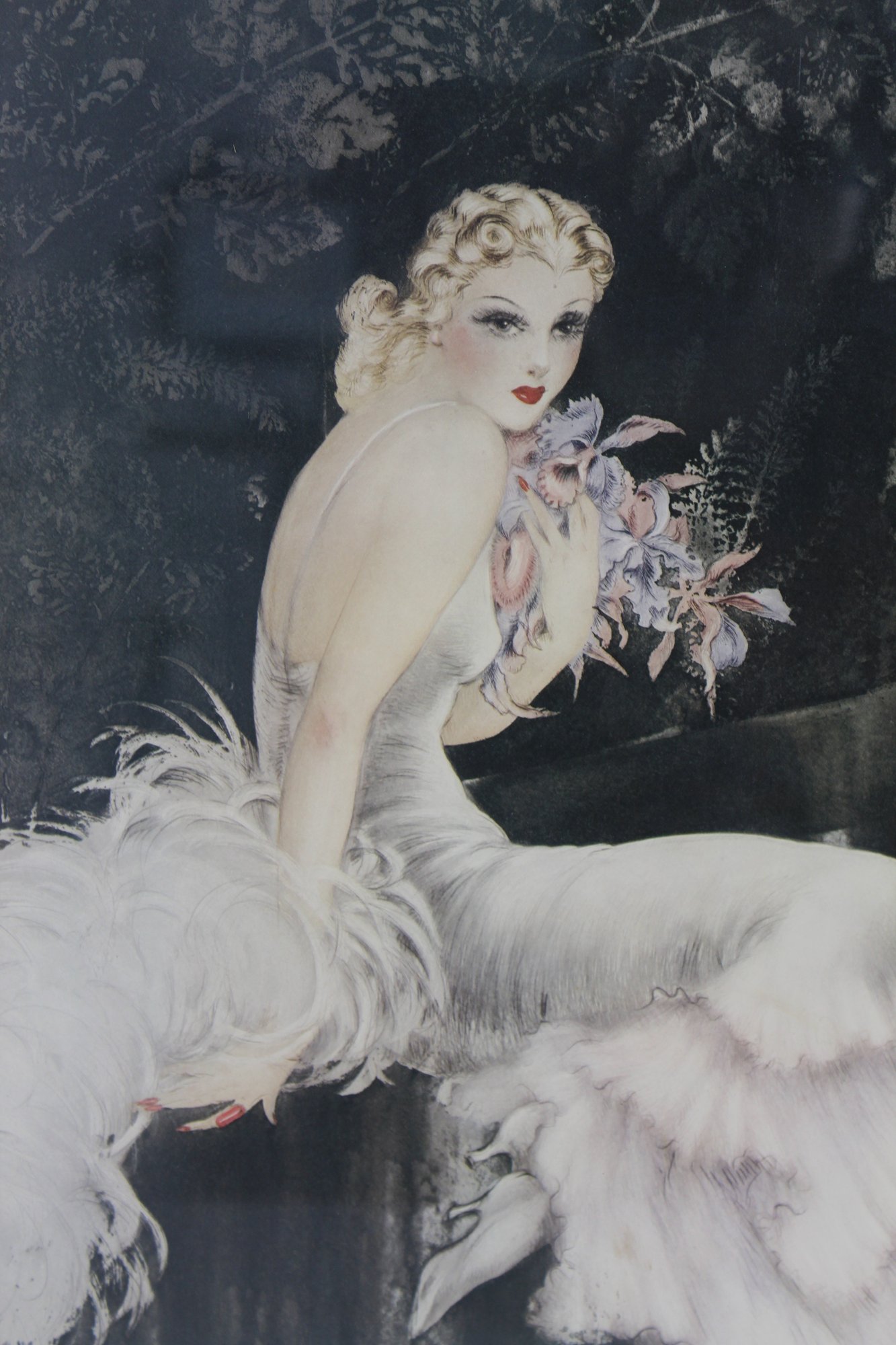 this vintage Louis Icart lithograph captures the romantic glamour of the Art Deco era. The artwork features a beautifully rendered woman in a flowing white gown adorned with feathers, seated gracefully with a bouquet in hand — a hallmark of Icart’s celebrated style blending sophistication, sensuality, and dreamlike charm.