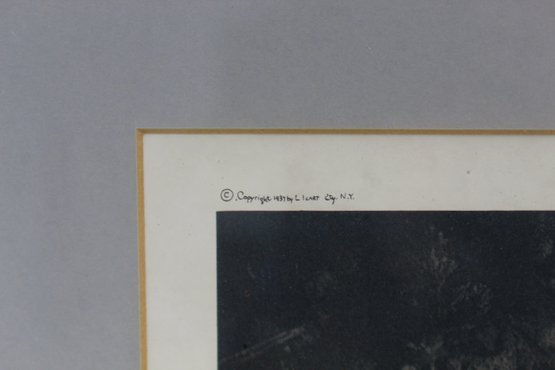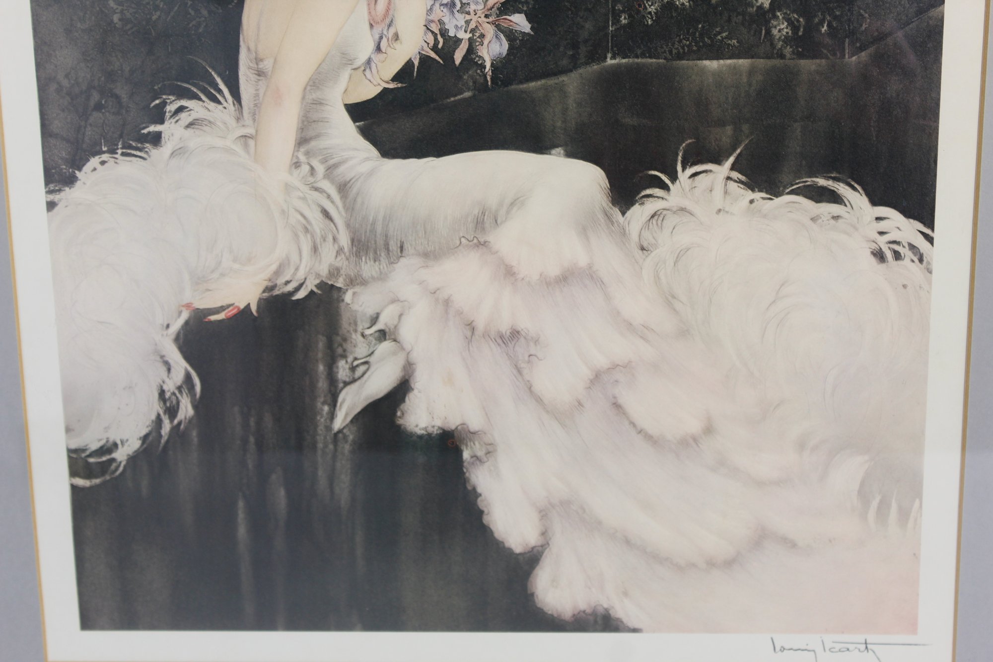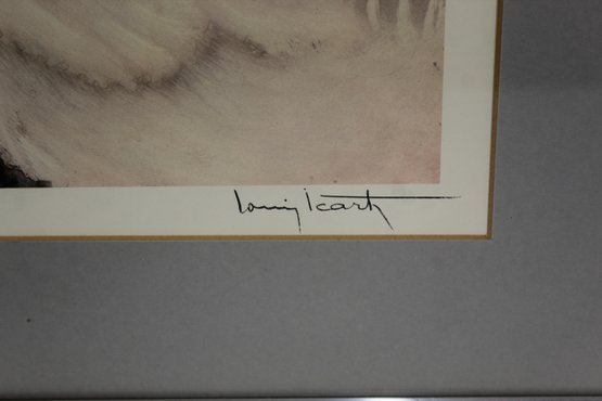 The print bears Louis Icart’s signature in the lower right corner and includes the copyright mark in the upper left, reading “Copyright Louis Icart N.Y.” It is professionally matted and set in a silver-tone frame under glass, enhancing its refined presentation.