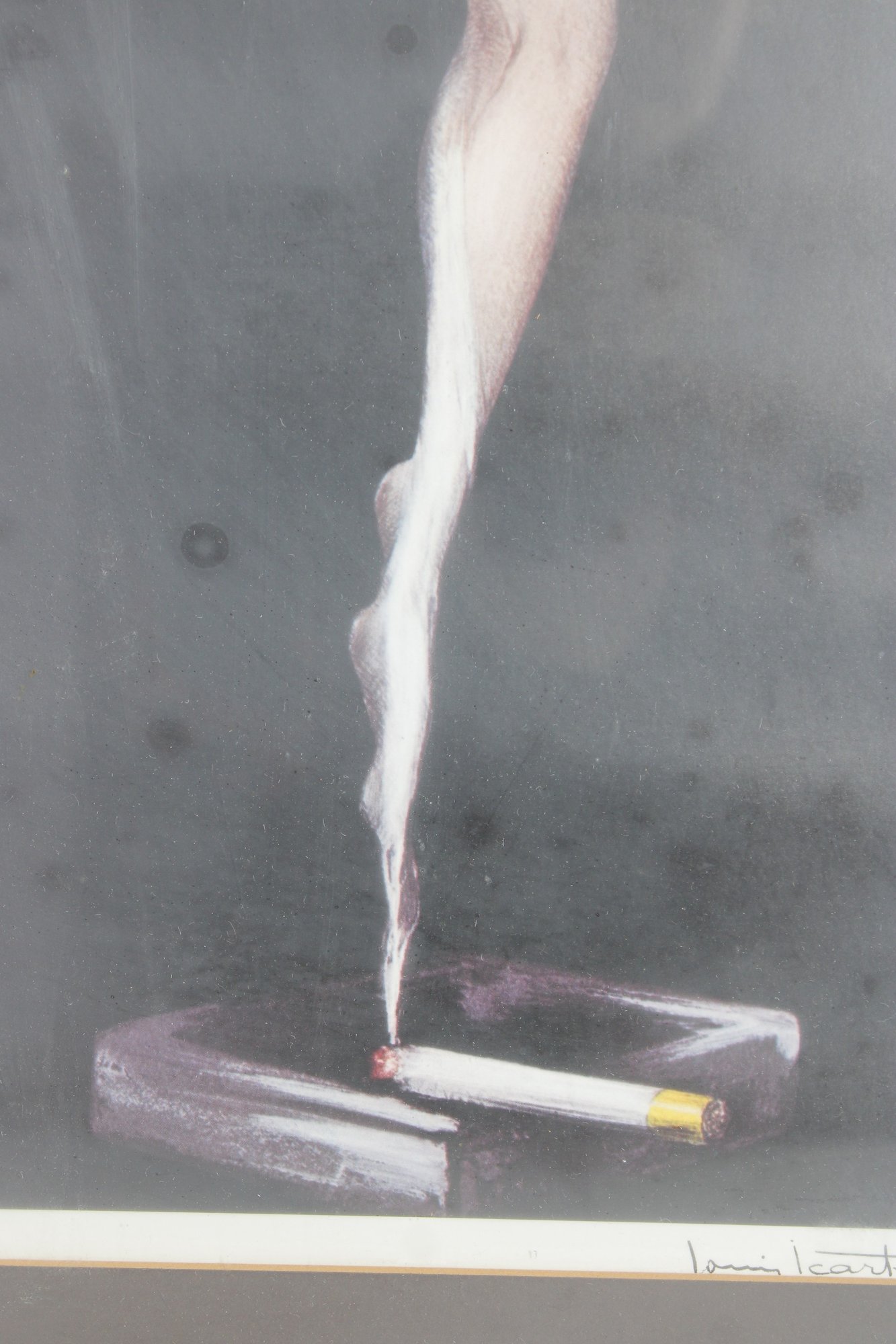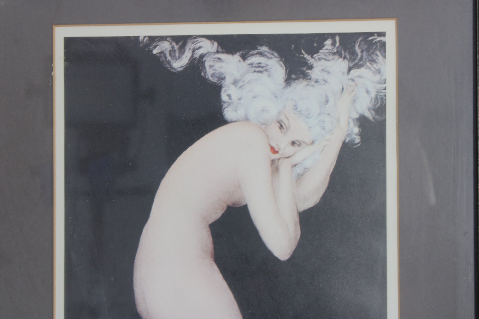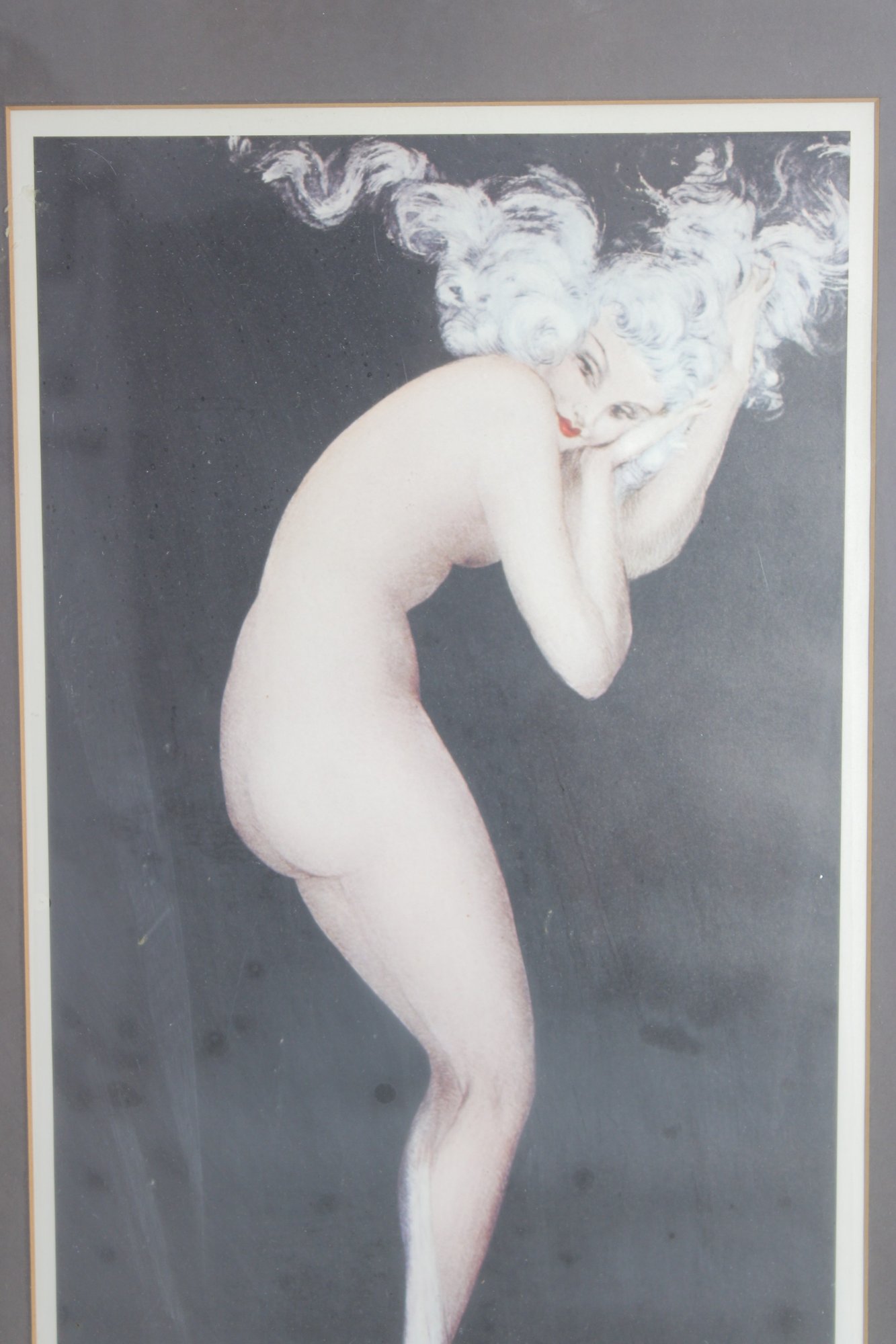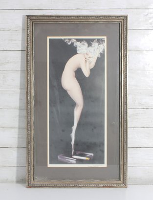 Louis Icart style print featuring a slender nude female figure posed gracefully while holding a cigarette, rendered in a classic Art Deco aesthetic. The composition is both sophisticated and provocative, capturing the glamour and sensuality associated with early 20th-century Parisian art.