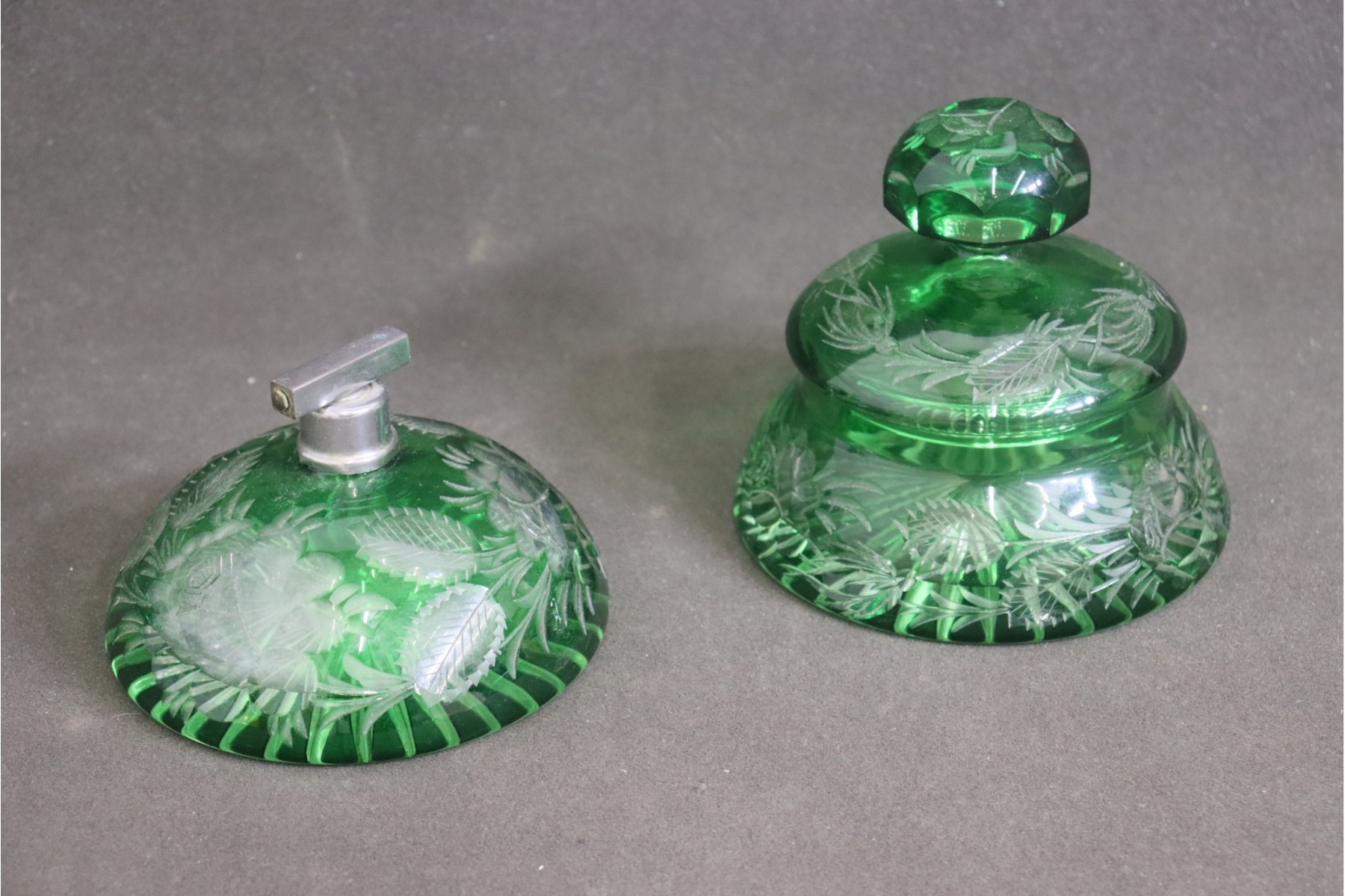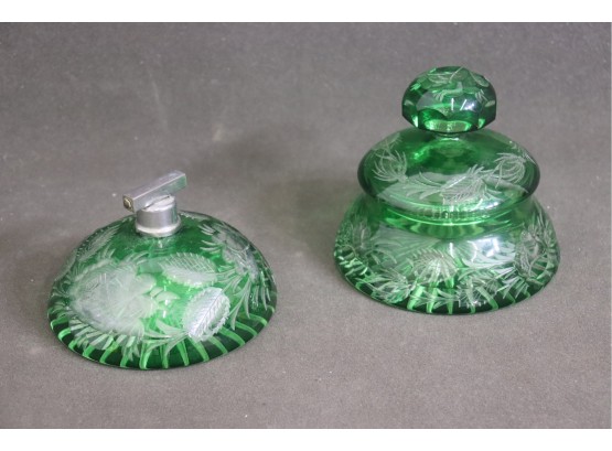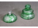 Lovely Pair Of Green Cut Glass Scent And Powder Vanity Jars