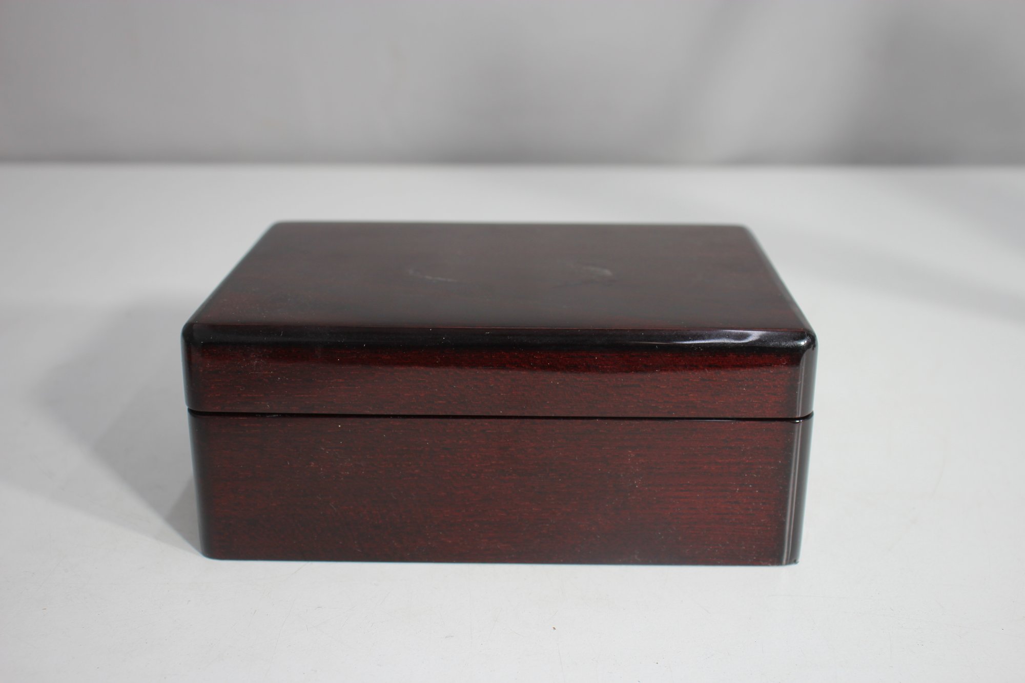 This sophisticated wooden jewelry box features a polished mahogany finish and a plush green felt interior, making it a luxurious and functional storage solution for your treasured items.