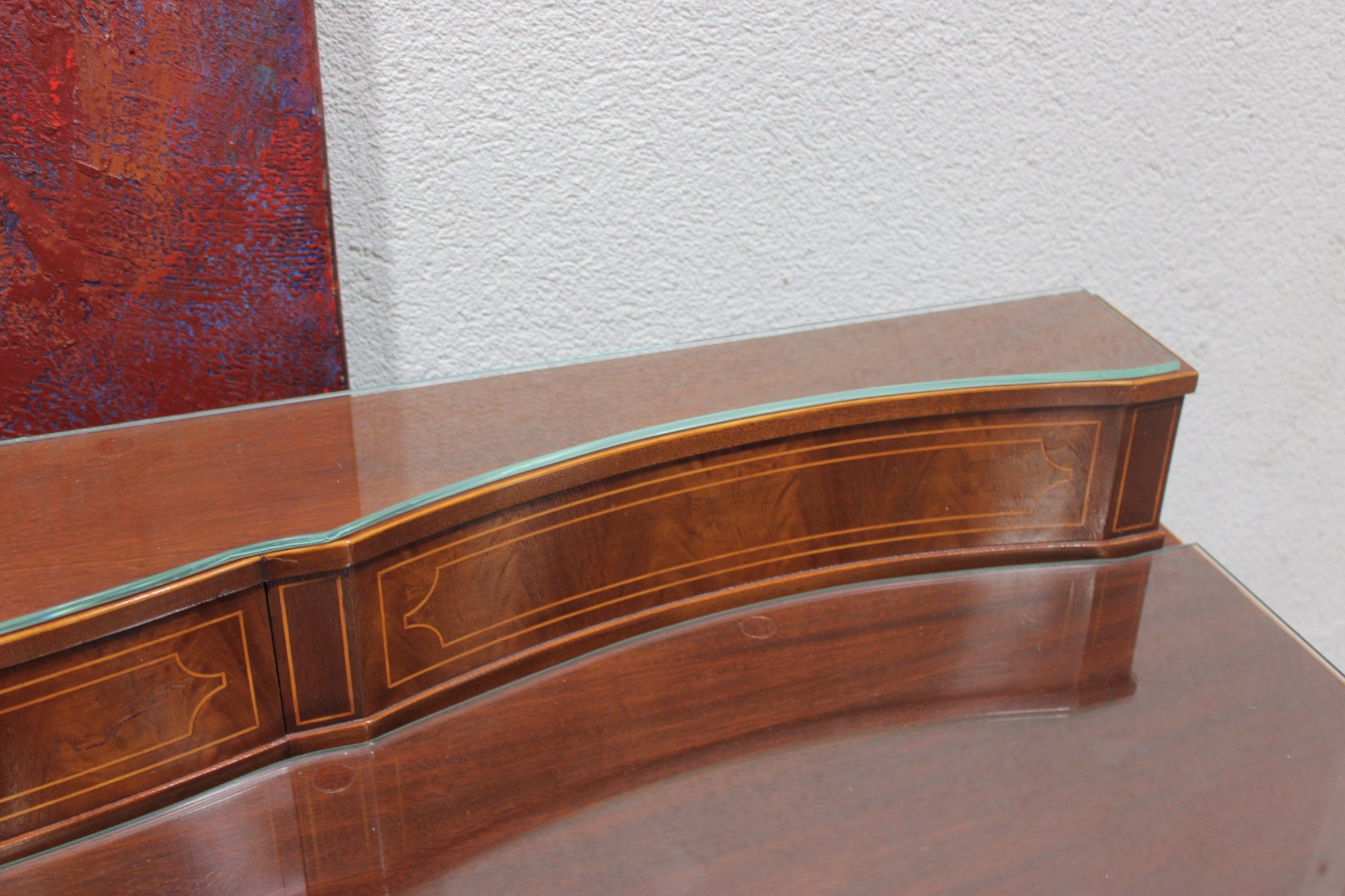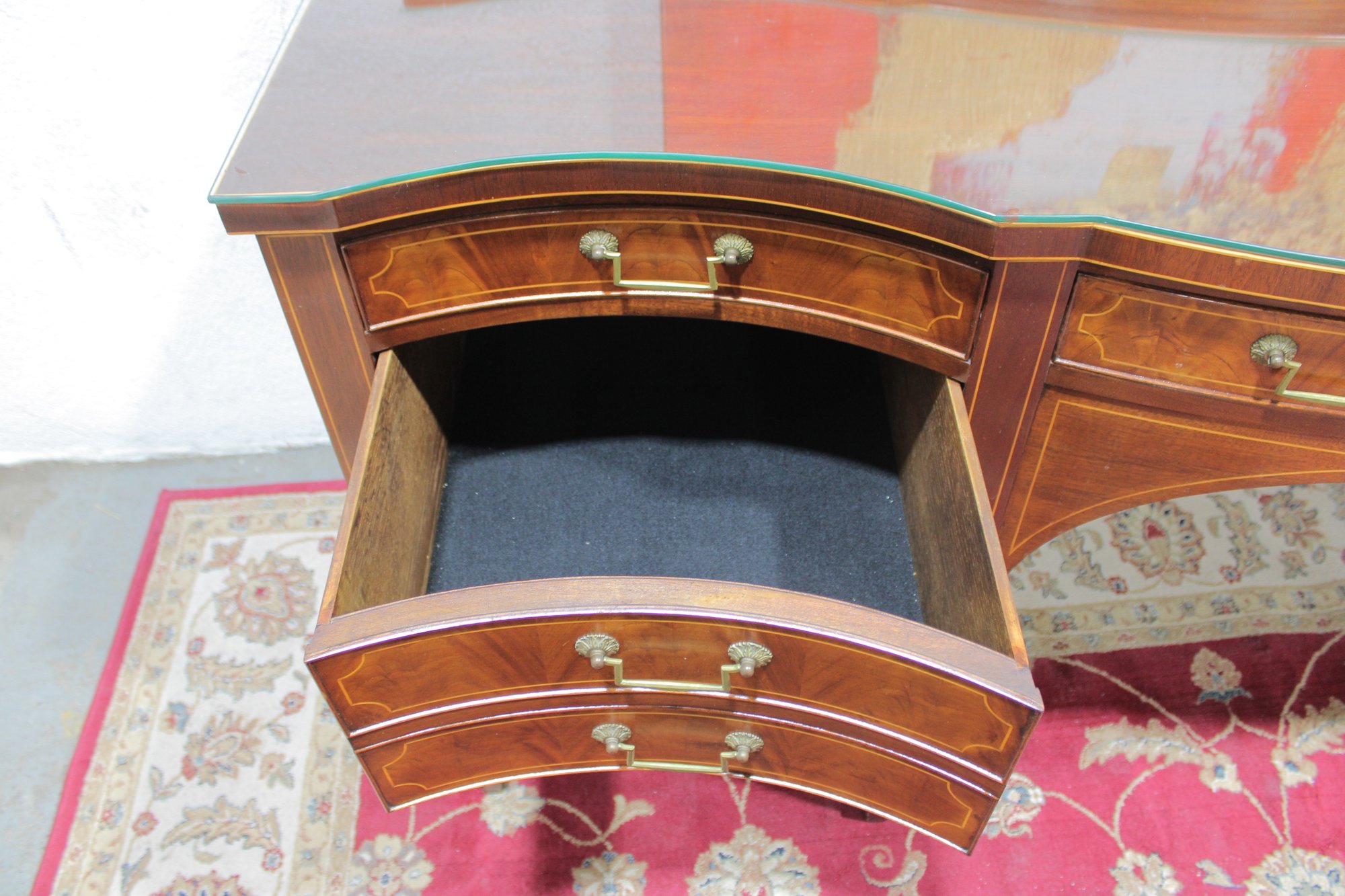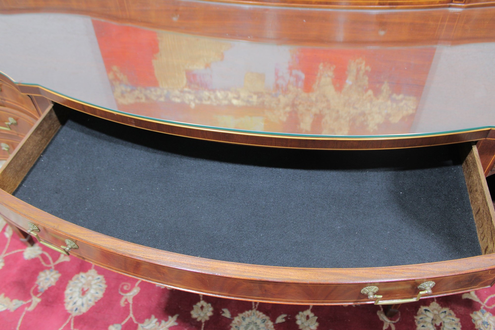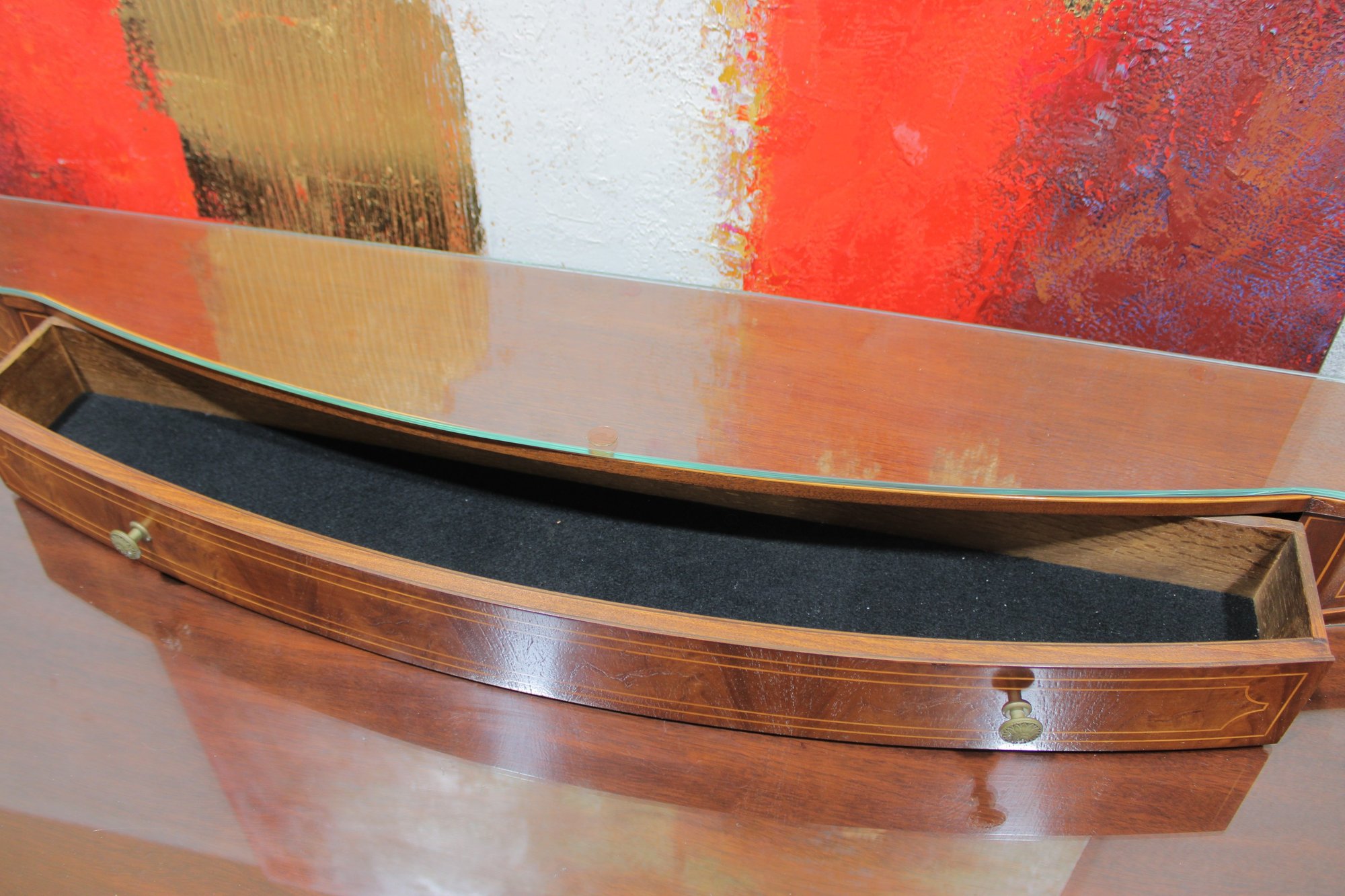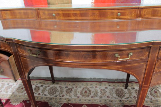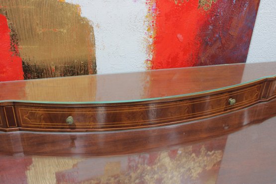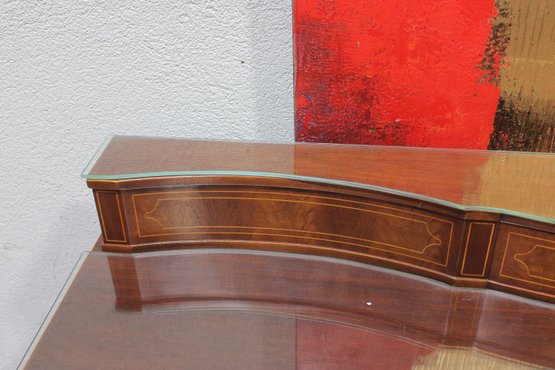 Beautiful mahogany sideboard or server featuring a graceful bow-front design and decorative inlaid details, offering both classic elegance and functional storage. The piece is protected by a custom glass top, preserving the wood surface while highlighting the rich grain and craftsmanship.