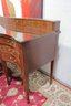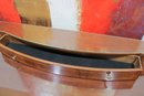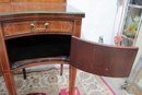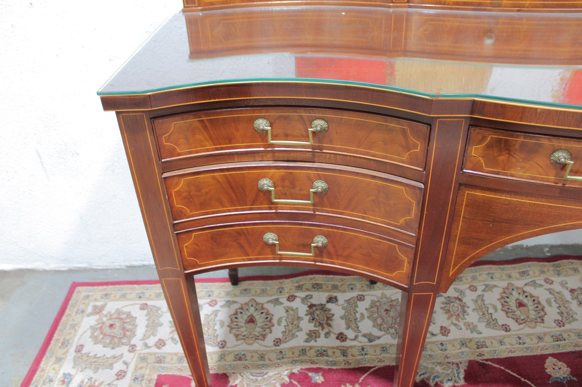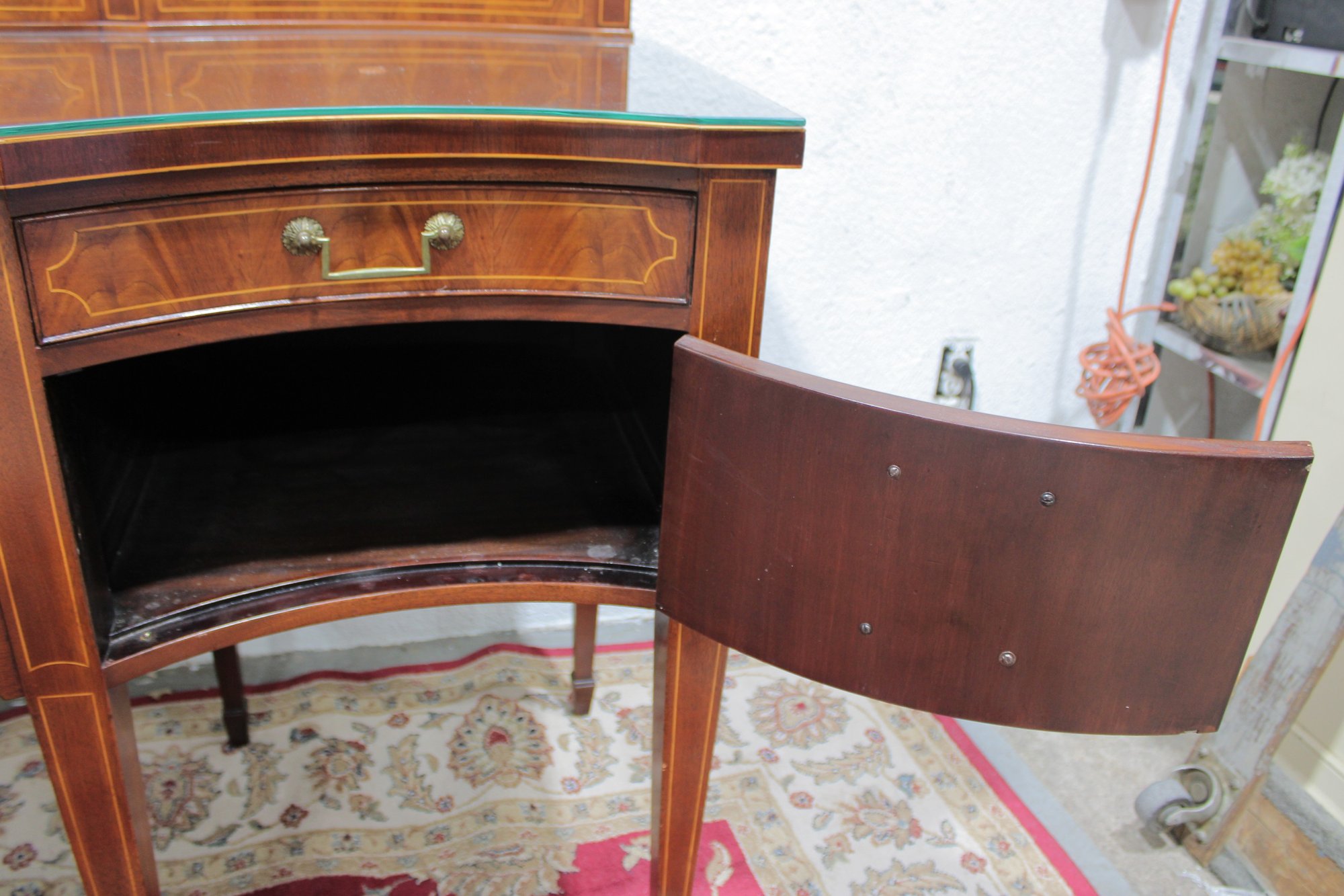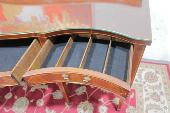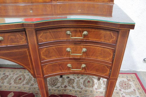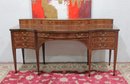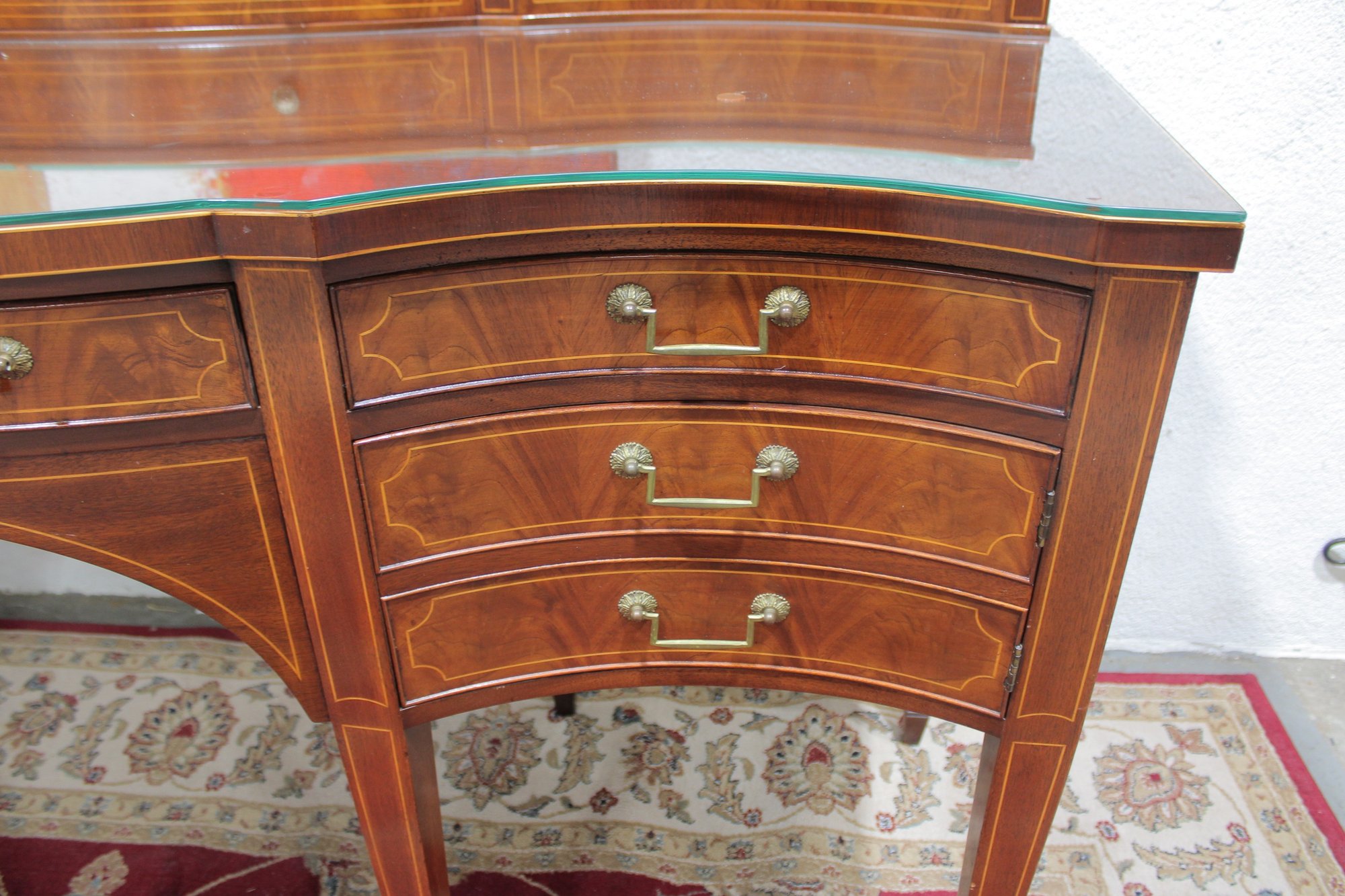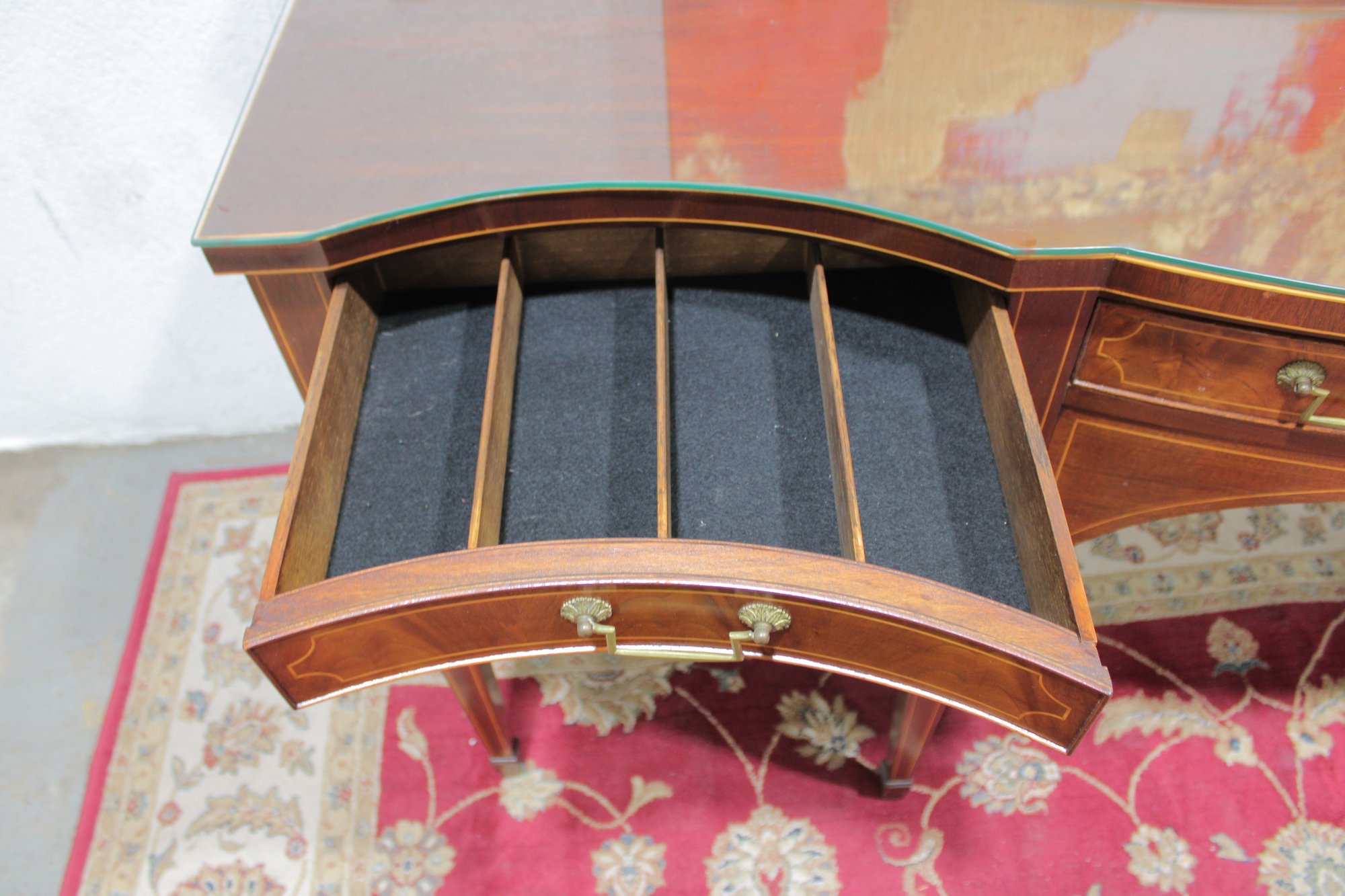 Beautiful mahogany sideboard or server featuring a graceful bow-front design and decorative inlaid details, offering both classic elegance and functional storage. The piece is protected by a custom glass top, preserving the wood surface while highlighting the rich grain and craftsmanship.