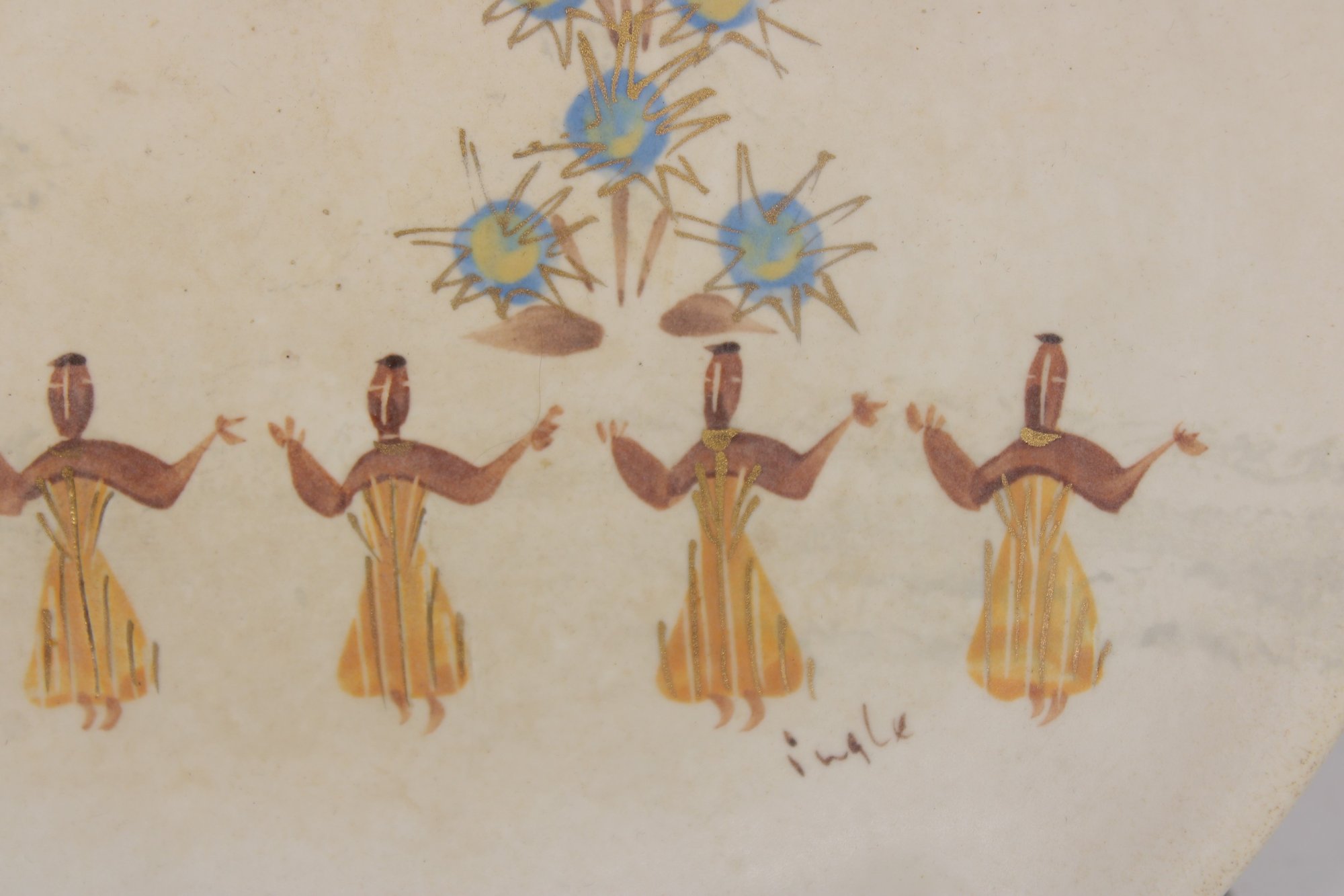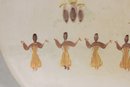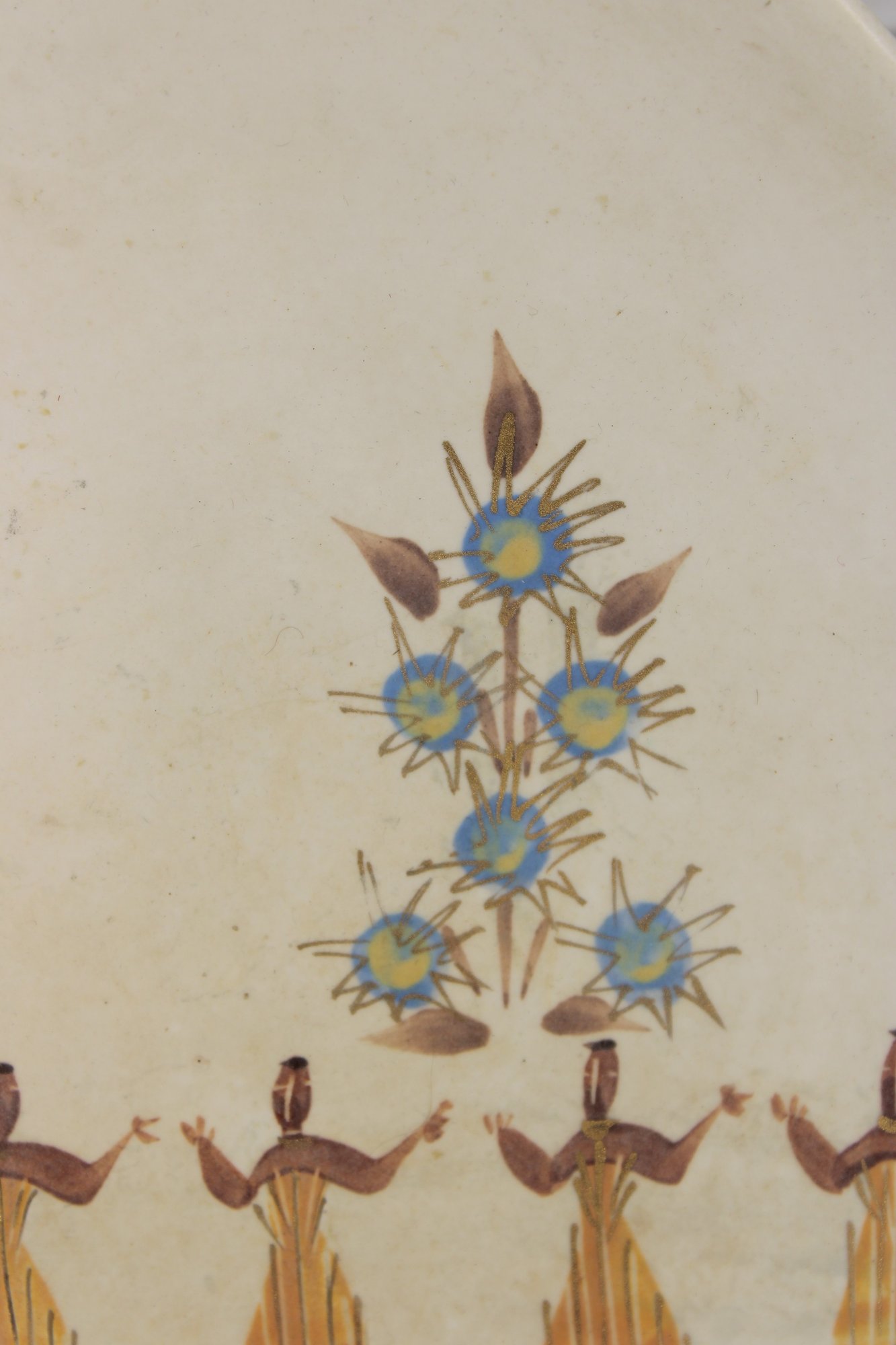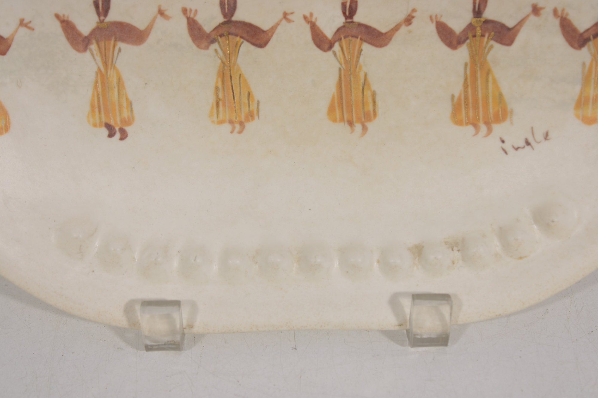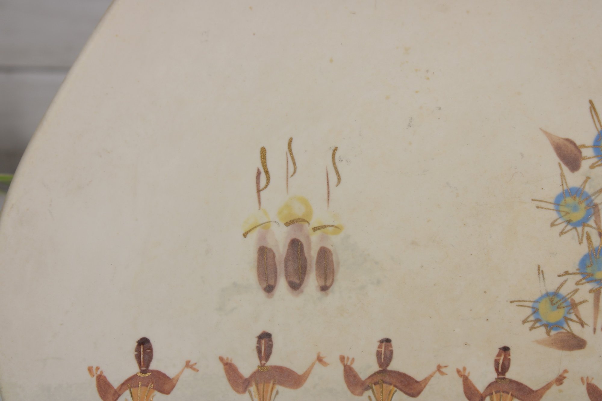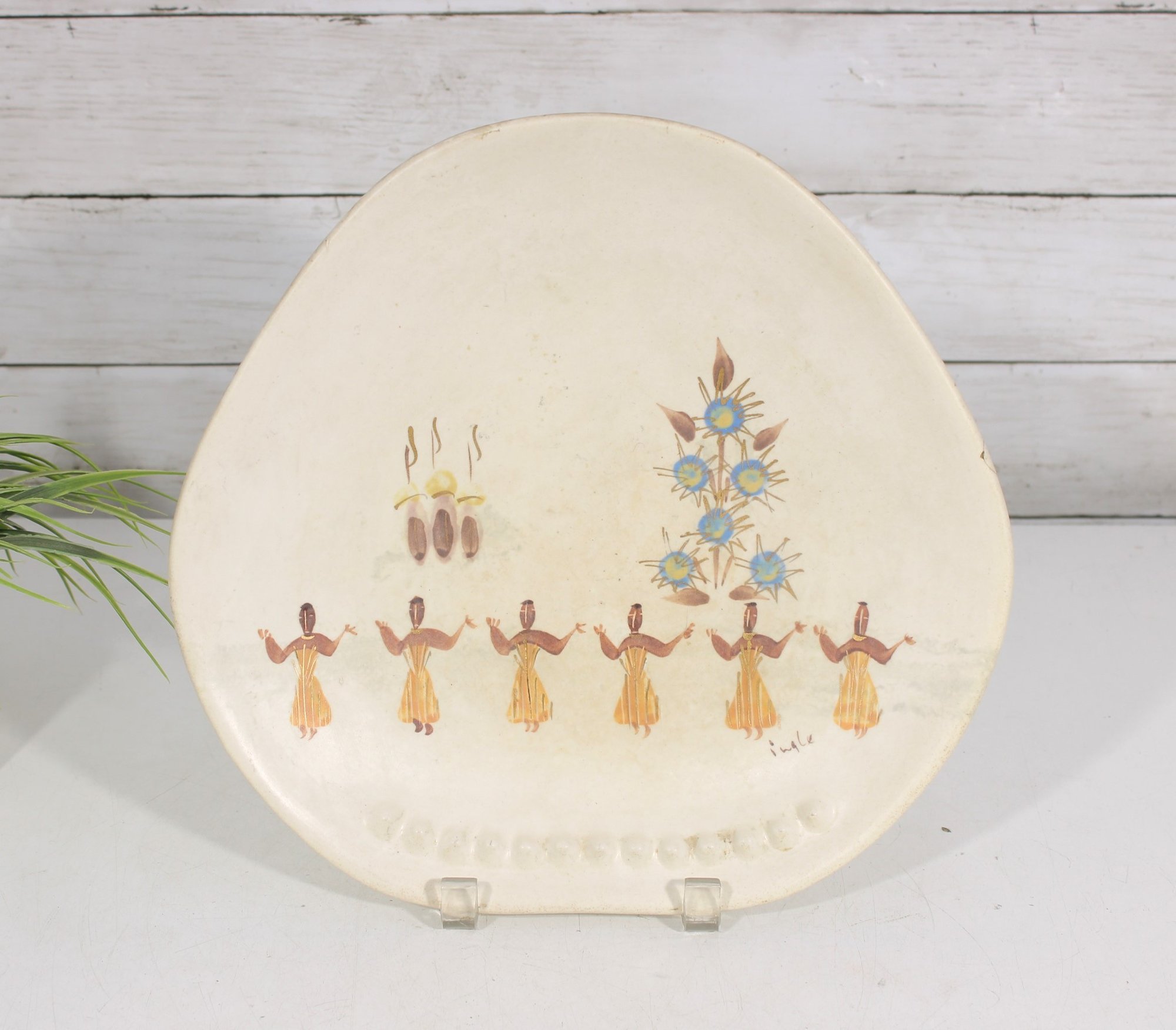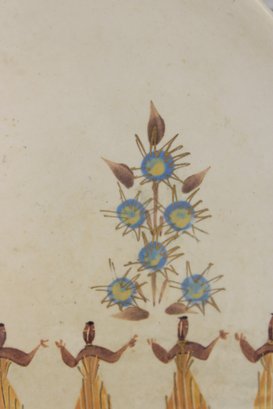 Vintage Marc Bellaire pottery platter featuring the distinctive “Kashmir” pattern, showcasing stylized figures in a repeating motif alongside abstract floral elements. The design reflects mid-century modern aesthetics with warm earthy tones and minimalist line work.