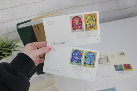 Marc Chagall themed collectible lot featuring a mix of philatelic covers, art prints, and a presentation-style book. This group blends fine art history with stamp collecting, making it appealing to both art enthusiasts and philatelists.