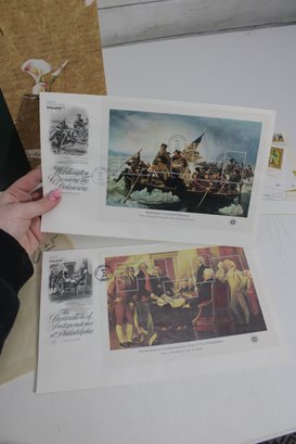 Chagall’s signature colorful, dreamlike imagery is represented through stamp designs and printed artwork in this curated assortment.
