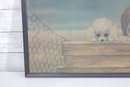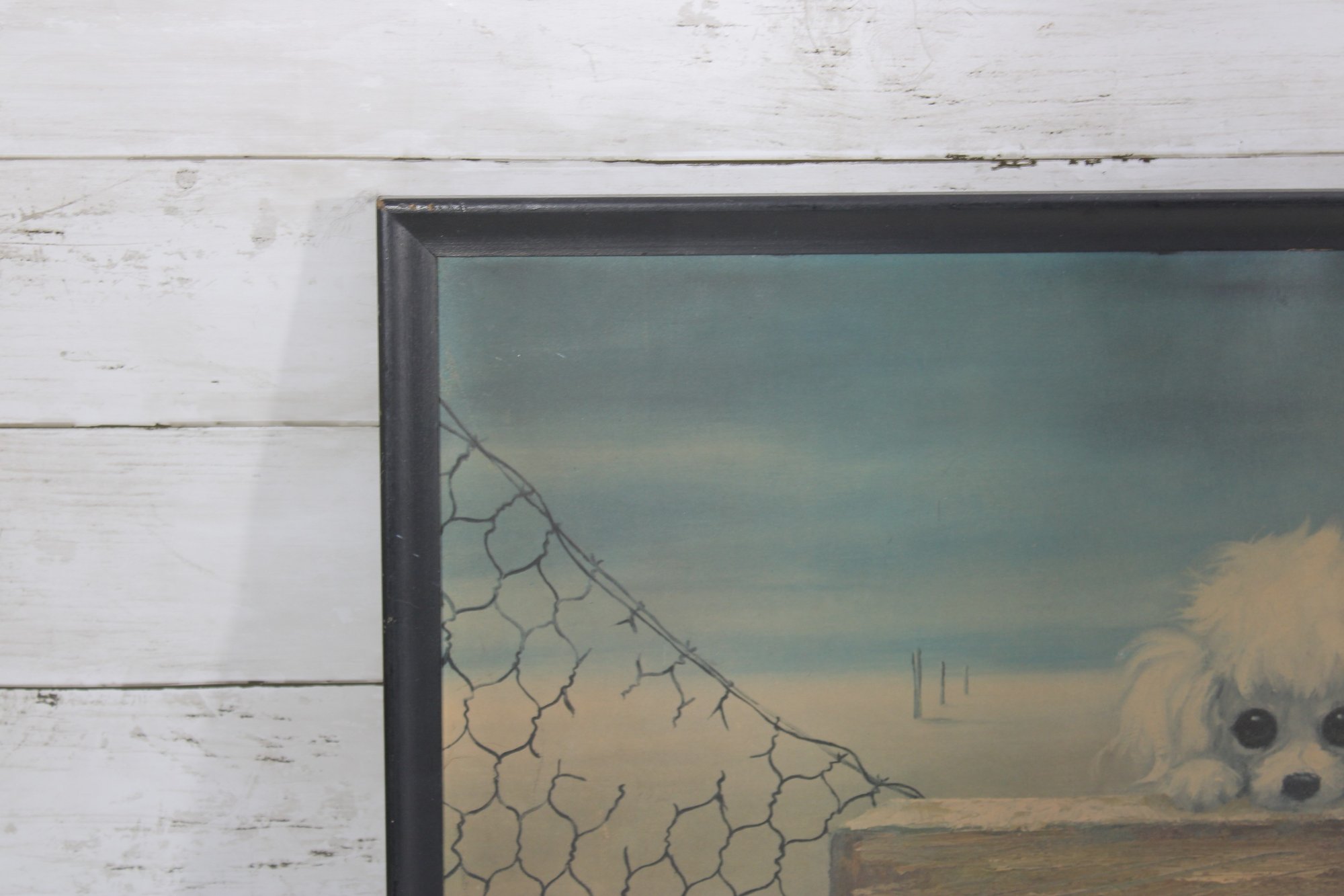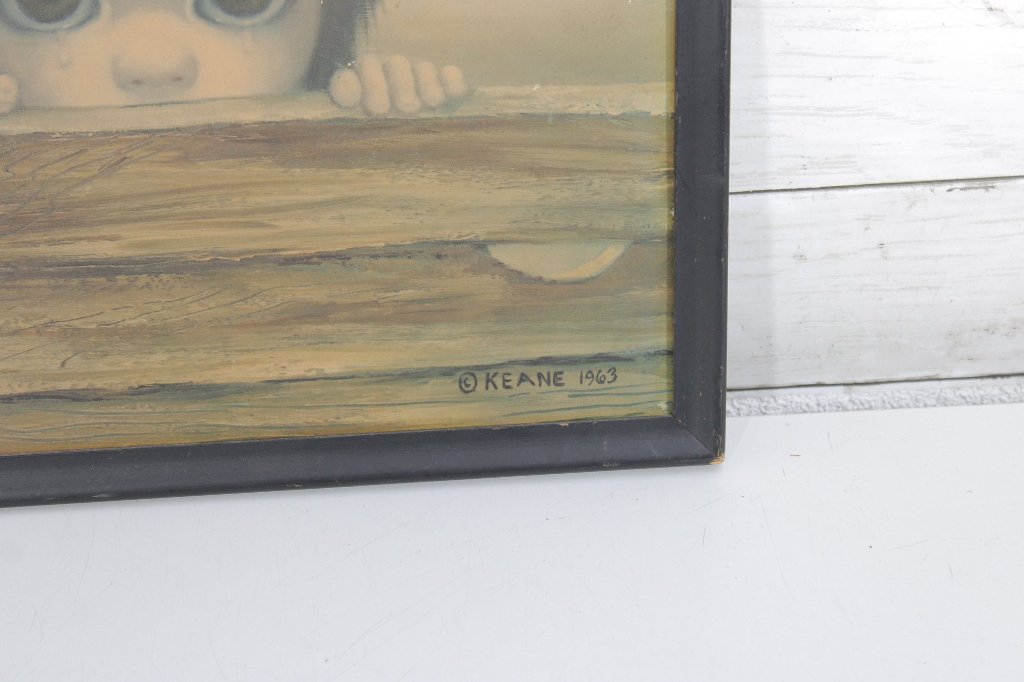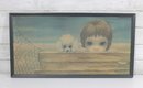 vintage framed print after Margaret Keane, dated 1963, featuring her iconic “Big Eyes” style. The artwork depicts a wide-eyed child peeking over a wooden fence alongside a small dog, rendered in Keane’s signature emotional and whimsical aesthetic.
