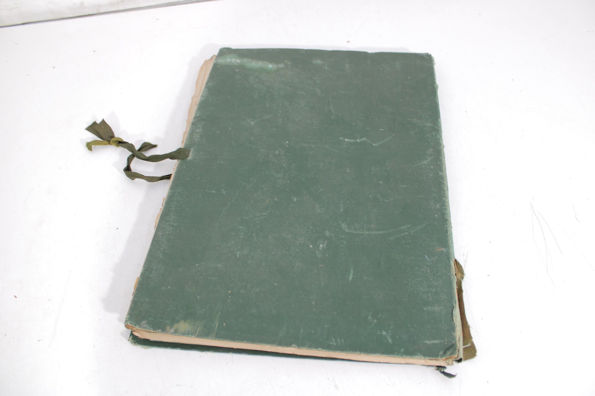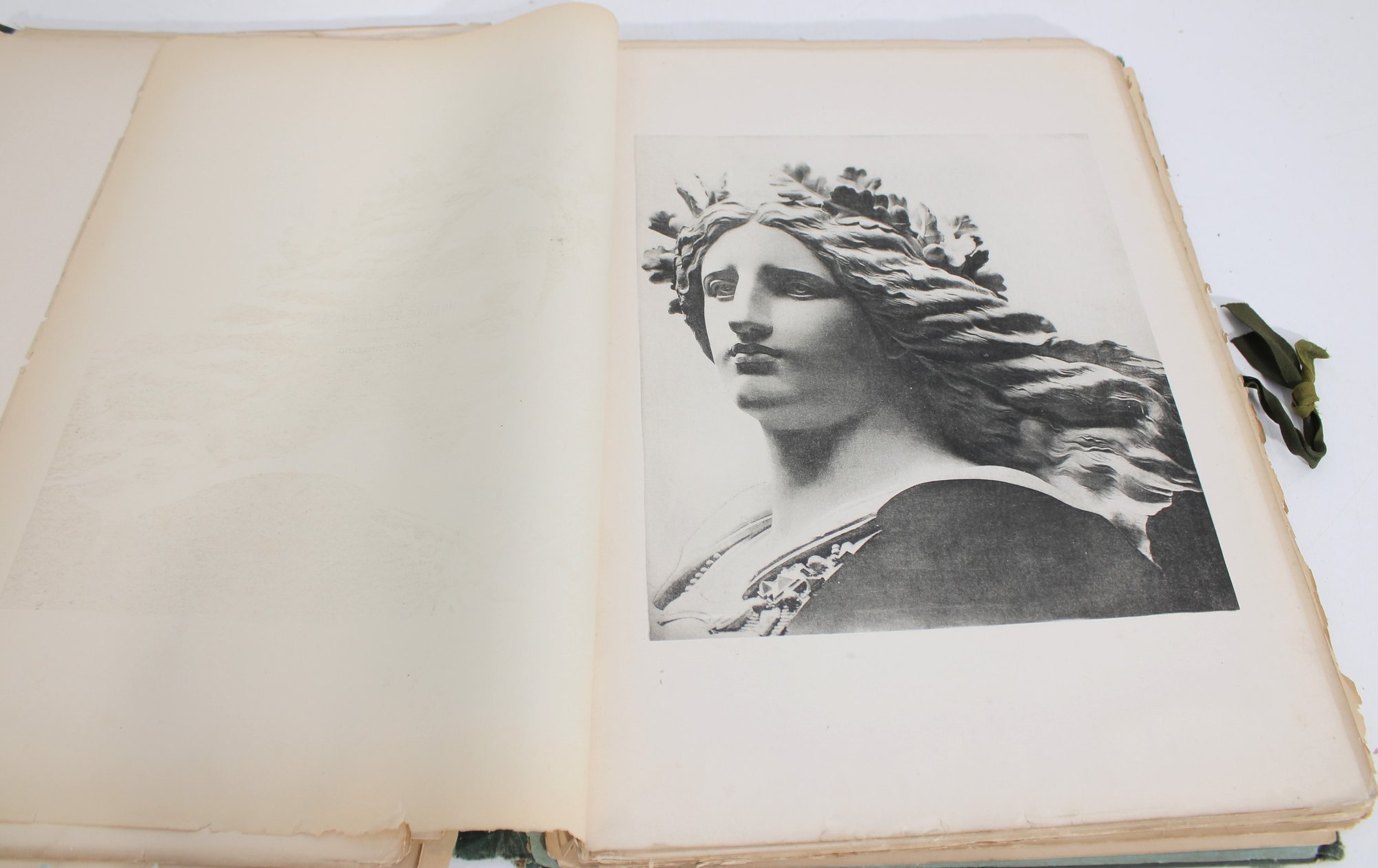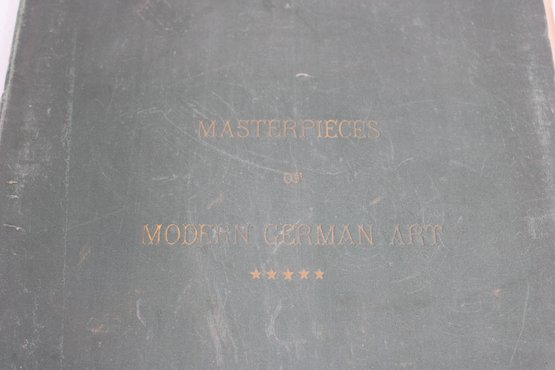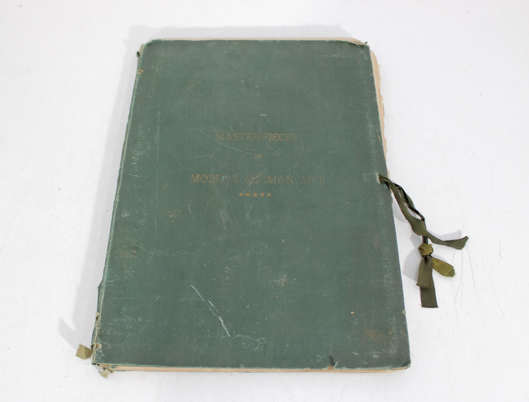 Antique folio volume titled “Masterpieces of Modern German Art”, featuring a collection of mounted black-and-white art plates after notable German works. This large-format portfolio presents high-quality reproductions printed on substantial paper and tipped/mounted onto heavy backing sheets.
