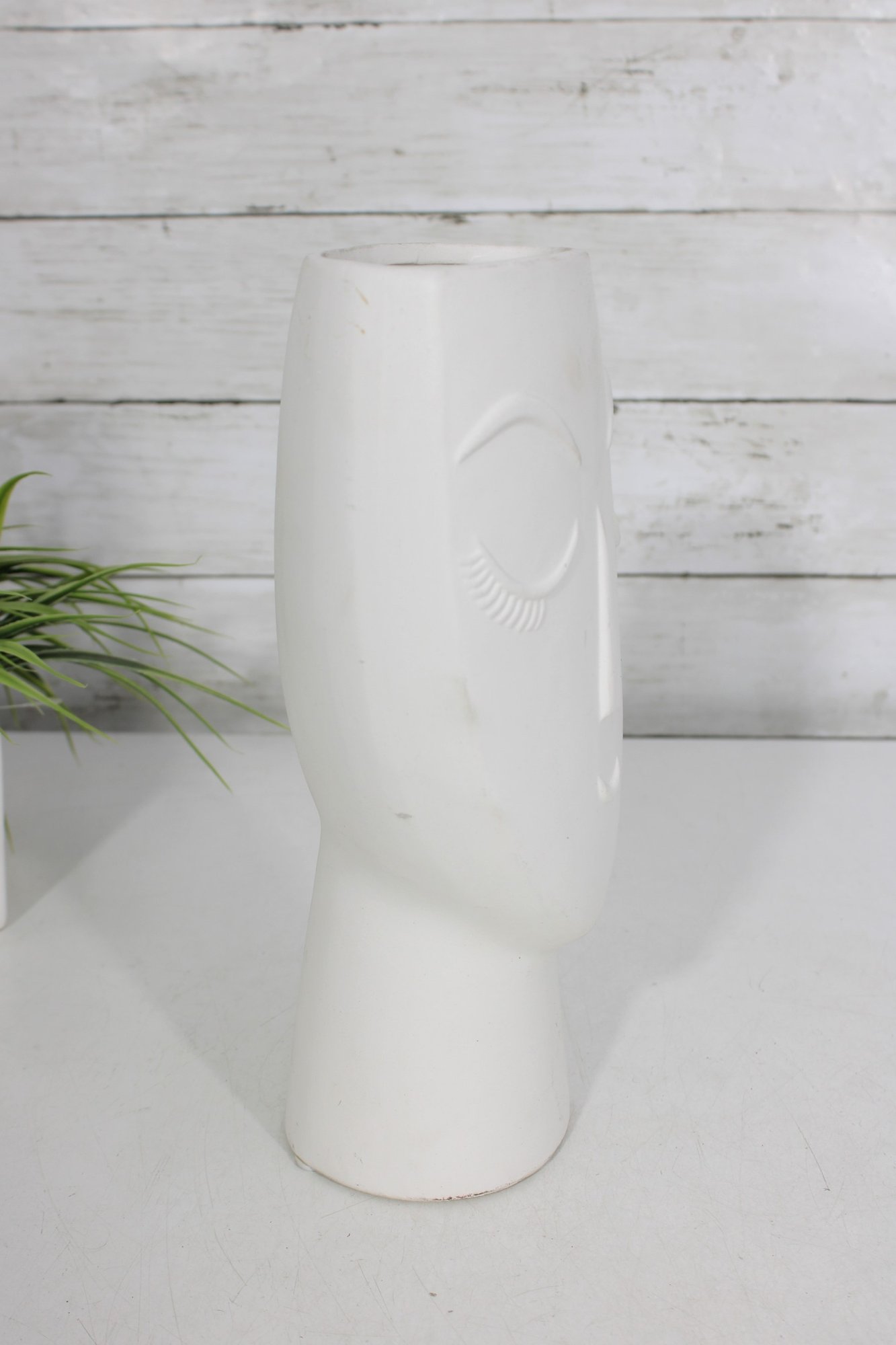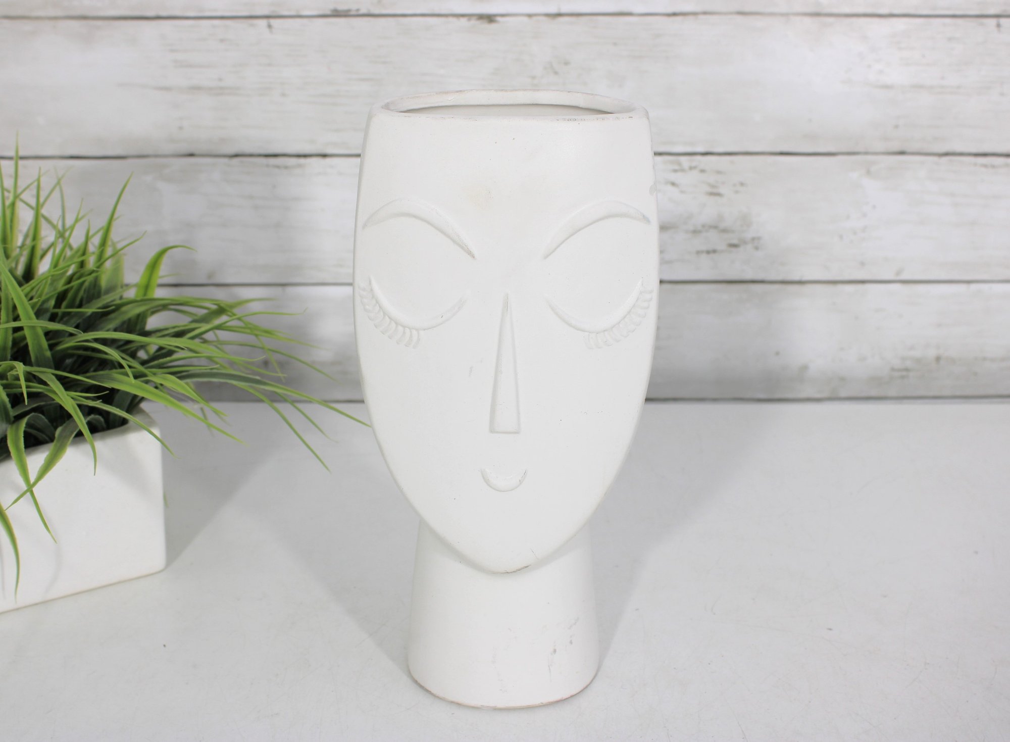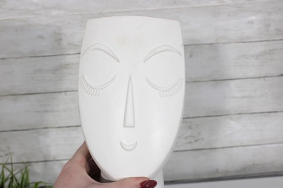 Stylish matte white head vase featuring a minimalist sculptural face design with clean lines and a modern aesthetic. The smooth ceramic finish and subtle facial details give this piece a contemporary artistic look, perfect for modern home décor, shelf styling, or use as a unique planter.