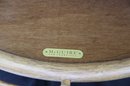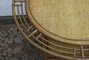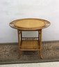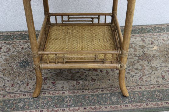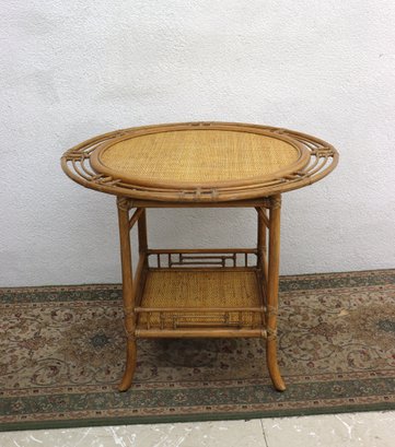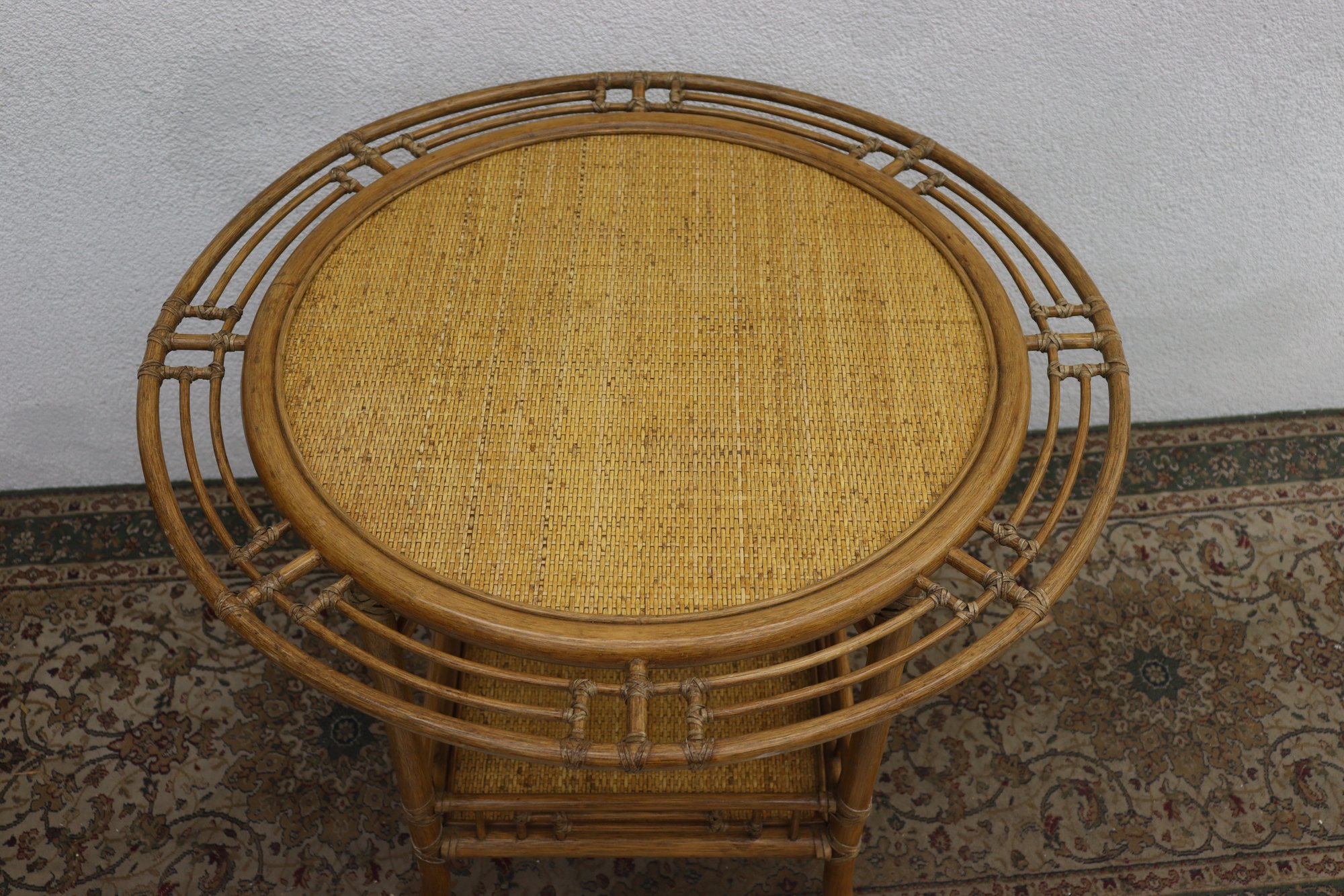 Authentic McGuire San Francisco rattan and cane round accent table. Beautifully crafted with McGuire’s signature high quality rattan work and wrapped joinery details. Features a woven cane top surface with sculptural open rattan ring design and a lower shelf for display or storage.